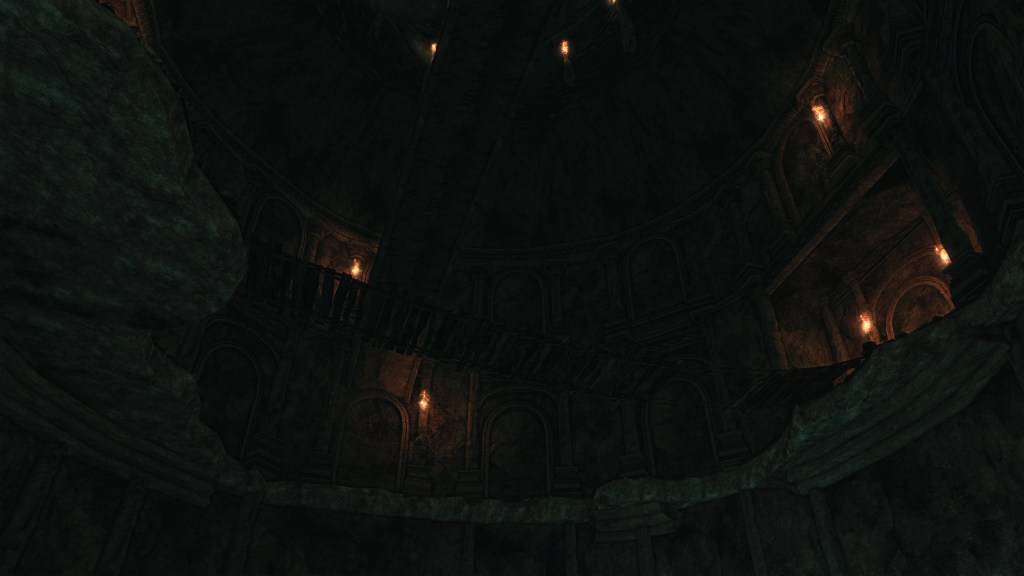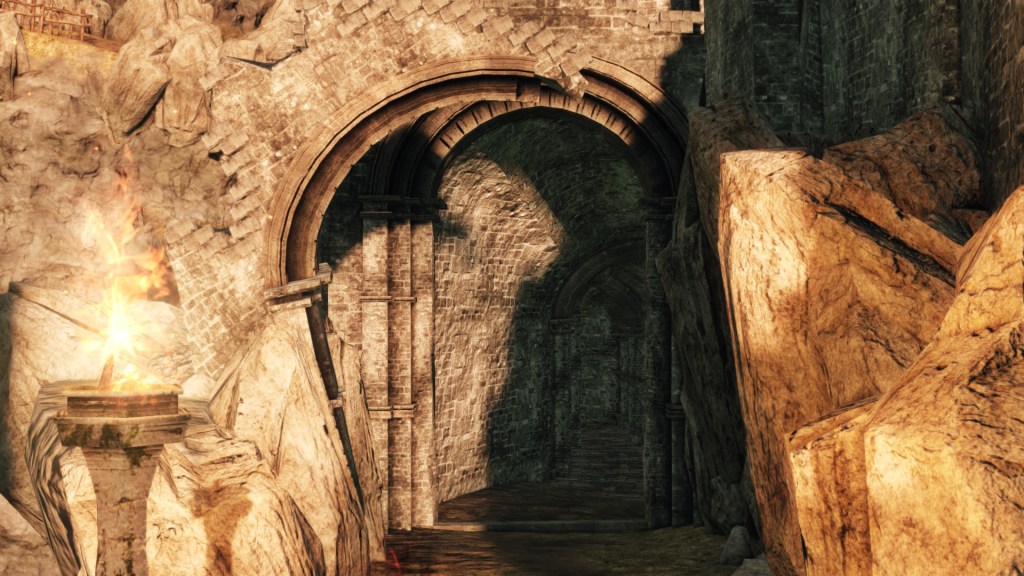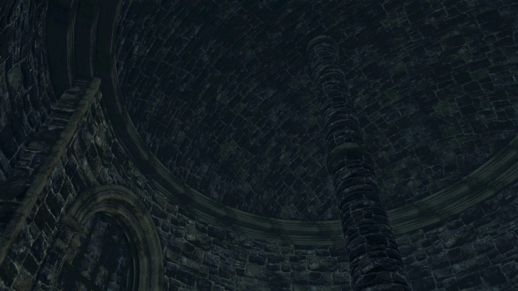 The cathedral is but one part of this system, the Heide Knights also guarding the path to the area’s eponymous Fire Tower. This landmark is identified as a lighthouse in the Design Works, but this may be due to the designer illustrating concepts for the sea-sunk ruin. From what we can observe, it served primarily as an arena. Entering the tower brings us to a small ring, with levers along the way to it widening the space by raising additional sections. These devices serve no purpose in a lighthouse but do function well for a ring-out arena, as proven by the boss faced in it. In other words, the tower probably served as another trial ground, the flames visible from every other part of the city beckoning warriors to prove their strength as devout defenders of fire. Perhaps prospective knights of blue had to prove their mettle there before moving onto the church, weeding out the generally weak before testing individual strength against the Dark.