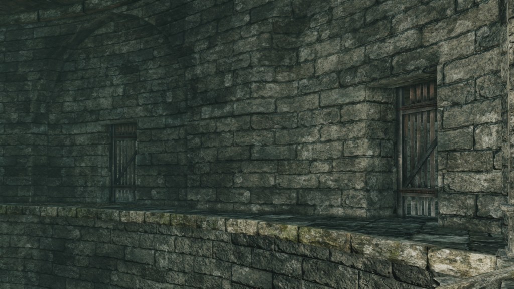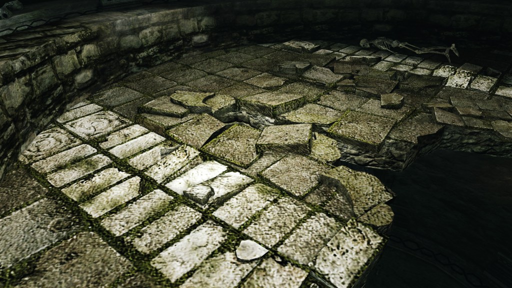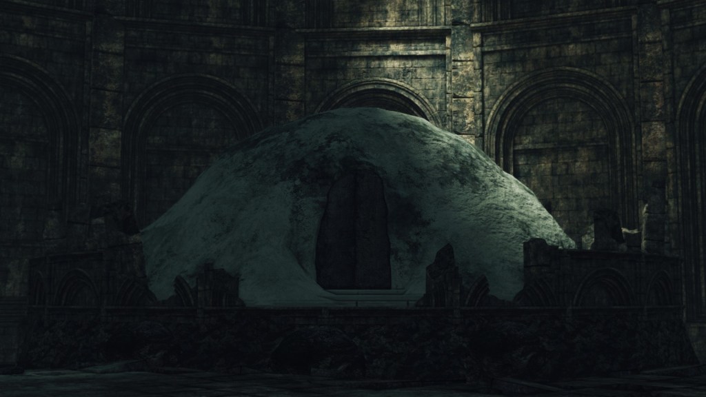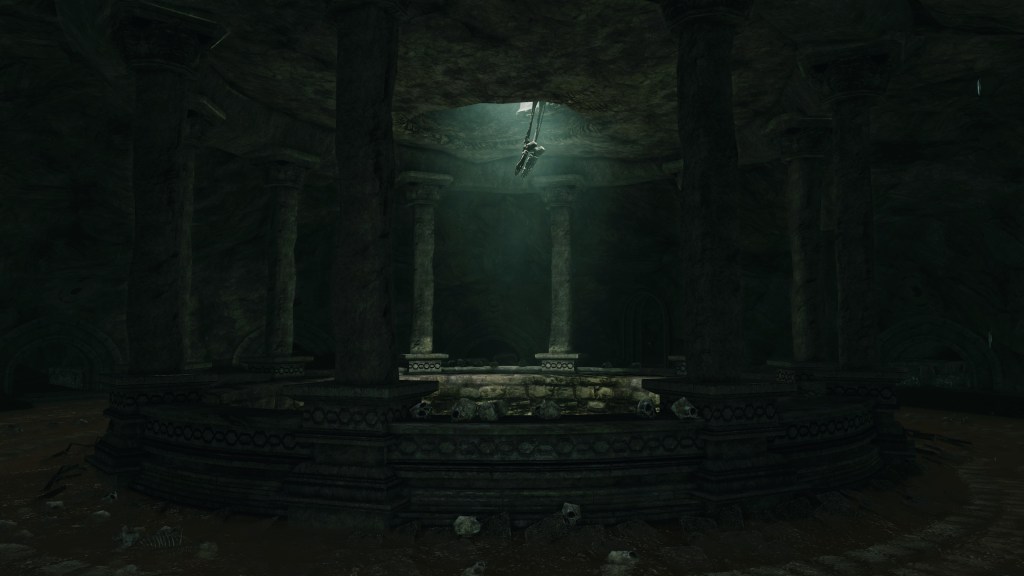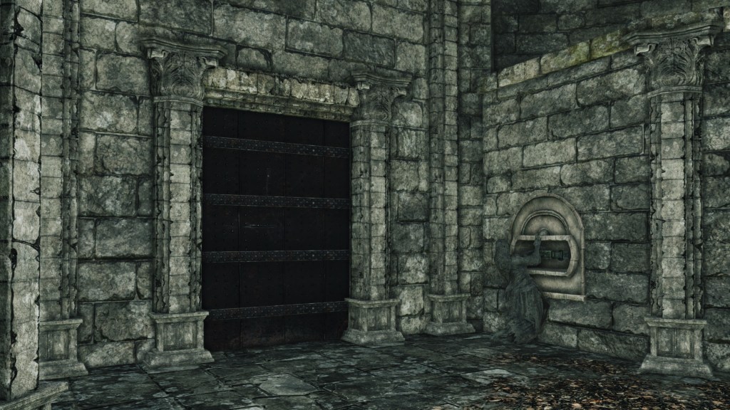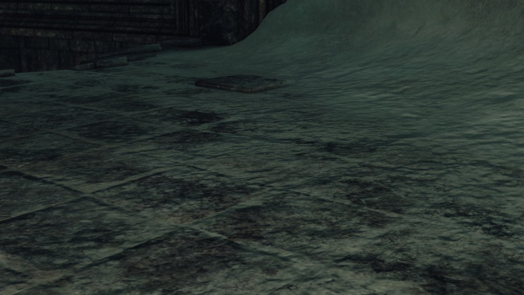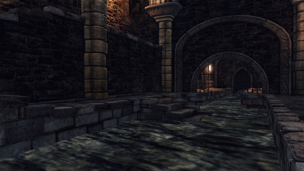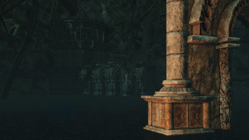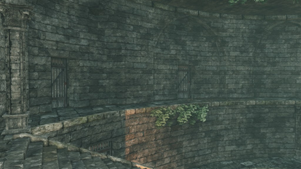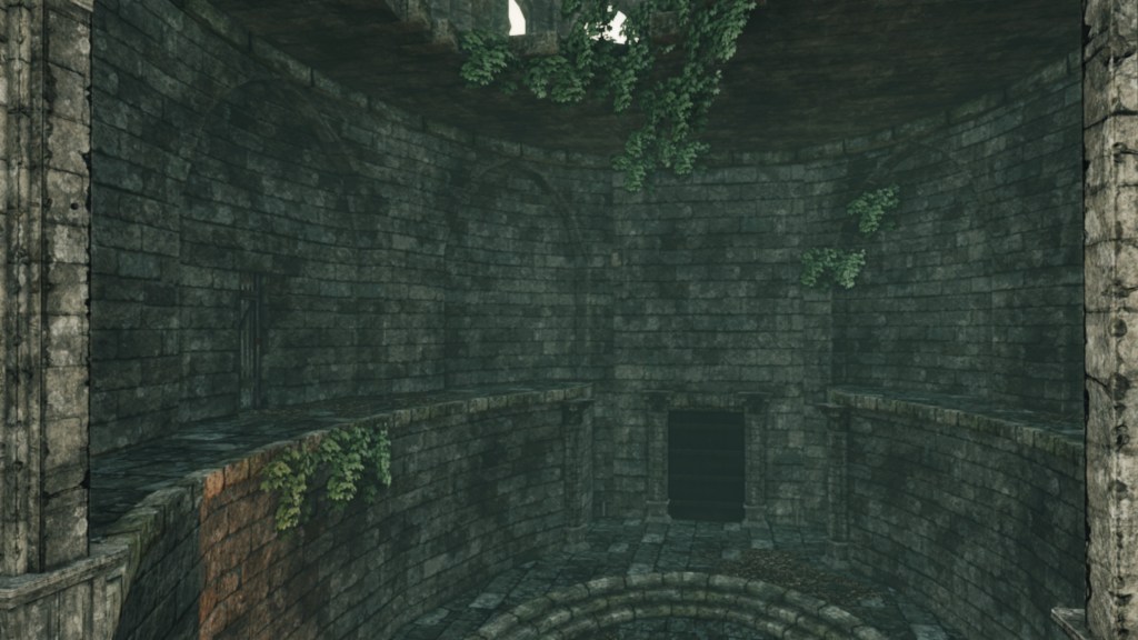 Therefore, the Pit was most likely built to be a circular elevator to various floors of the Grave of Saints, among other areas. For example, we can come across various stone doorways built into the rock face of the Gutter, each identical to the one in the Pit. These doors seem to be the only surviving Heiden ruins below the shaft, reached at the end of the proposed lift ride. But following the country’s destruction and the passage of time, the actual lift and any supporting structures or mechanisms around it were lost. While Majula sits well above sea level compared to Heide’s Tower of Flame, the lower levels of the Grave of Saints have nevertheless been completely flooded — if there were other means to enter the graveyard from the capital, they have been forever cut off. Only some of this can be attributed to water trickling in from above, as seen within one chamber higher up and another directly under through broken floors. And so, it is likely that any other underground facilities that this hypothetical lift would have taken us to were made inaccessible by Heide’s watery destruction.