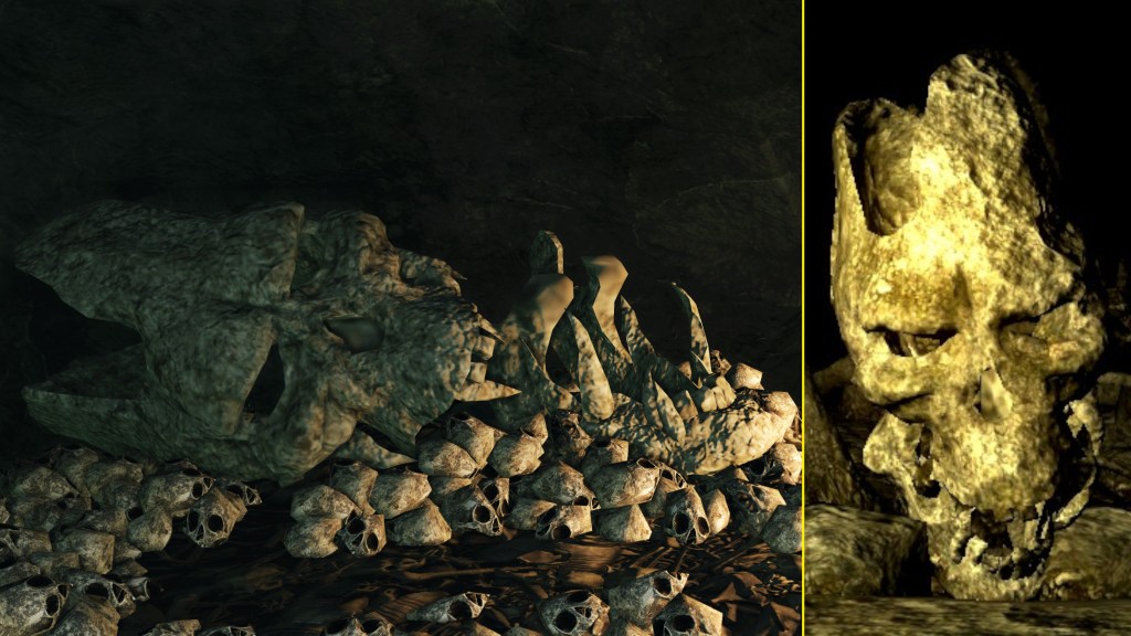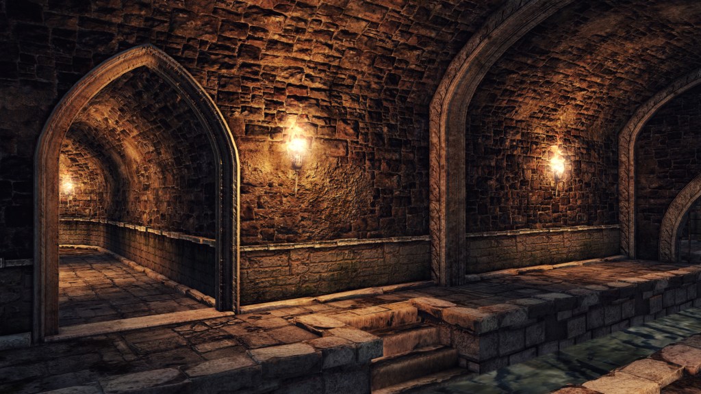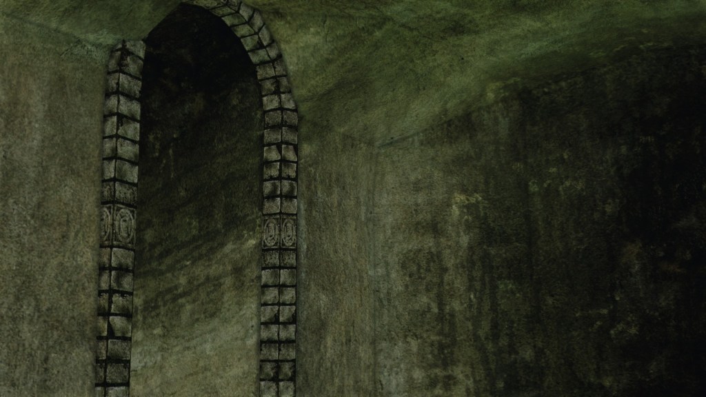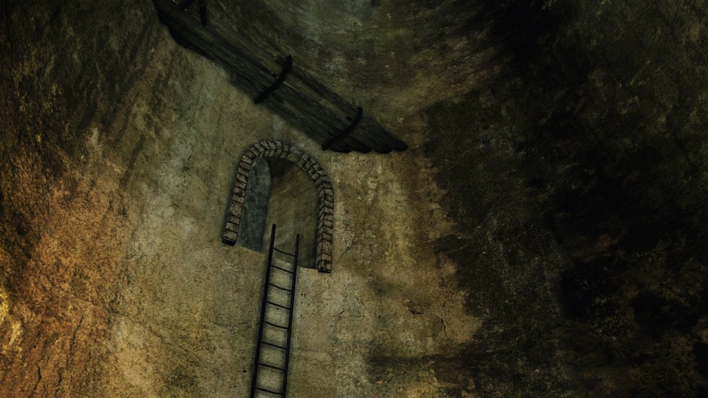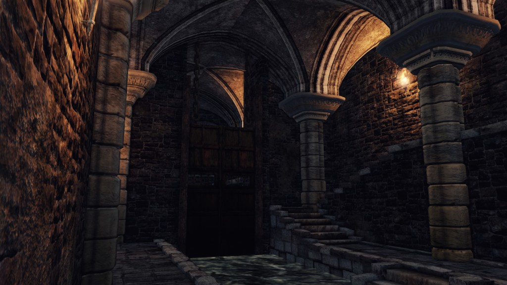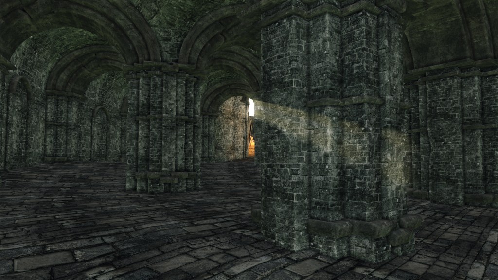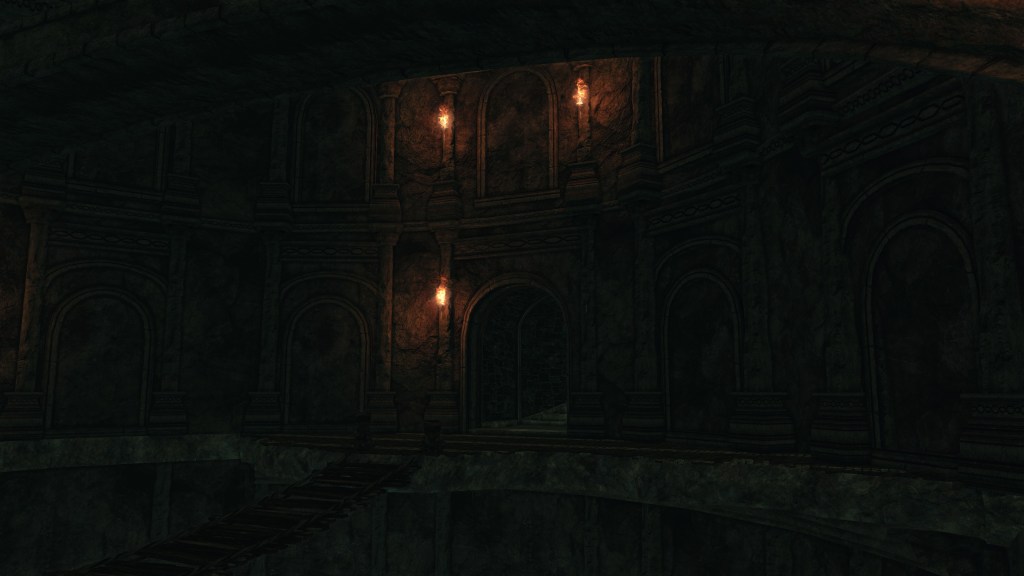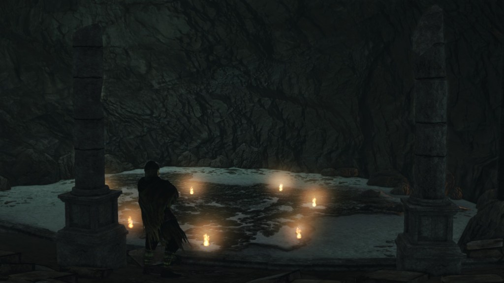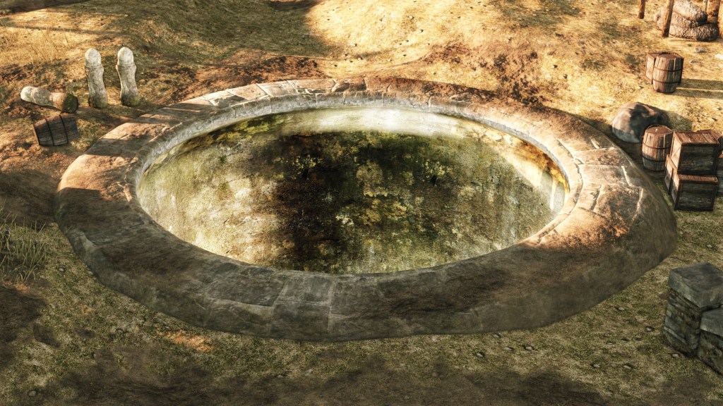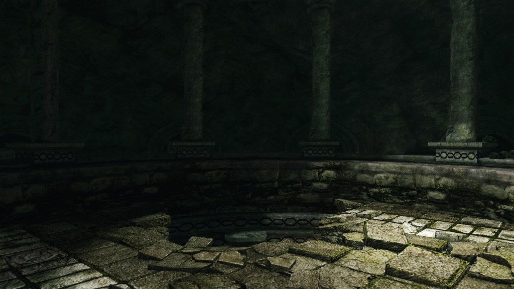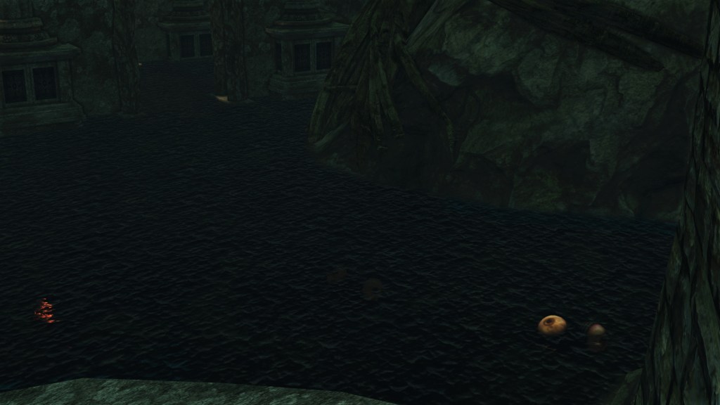 Therefore, the Pit was most likely built to be a circular elevator to various floors of the Grave of Saints, among other areas. For example, we can come across various stone doorways built into the rock face of the Gutter, each identical to the one in the Pit. These doors seem to be the only surviving Heiden ruins below the shaft, reached at the end of the proposed lift ride. But following the country’s destruction and the passage of time, the actual lift and any supporting structures or mechanisms around it were lost. While Majula sits well above sea level compared to Heide’s Tower of Flame, the lower levels of the Grave of Saints have nevertheless been completely flooded — if there were other means to enter the graveyard from the capital, they have been forever cut off. Only some of this can be attributed to water trickling in from above, as seen within one chamber higher up and another directly under through broken floors. And so, it is likely that any other underground facilities that this hypothetical lift would have taken us to were made inaccessible by Heide’s watery destruction.