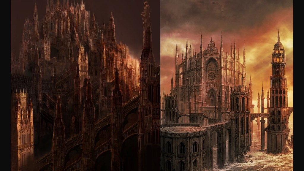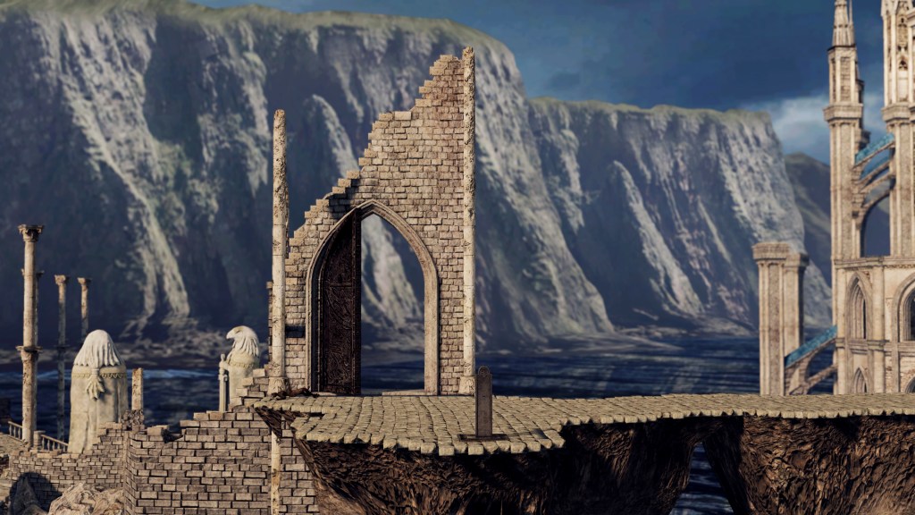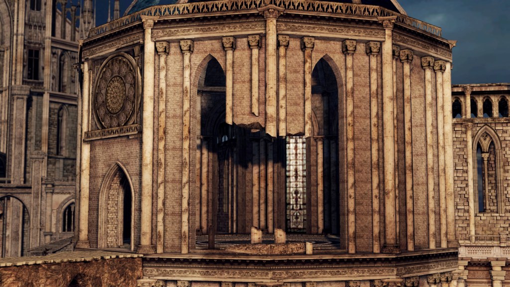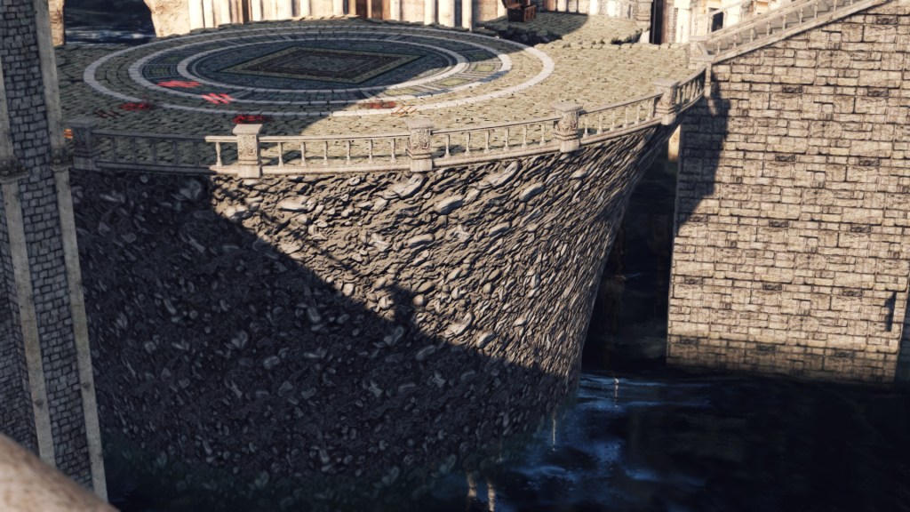 As alluded to earlier, Heide appears to have collapsed when the city inexplicably sank into the sea. This particular phrasing rings odd given that we reach the ruins from Majula, which sits on the seaside cliffs at higher altitude. Specifically, it is via a passage through the loop temple, a passage which remains unblemished aside from water flowing through the portions below sea level — and looking at the design, this is simply because it is part of the city’s water supply or sewer systems. If the city physically sank beneath the waves, then one would think passages like these would have been torn asunder. Instead, it is as if the entire continent sank along with it. But we can clearly see some of the rocky foundation above water even while taller buildings stand perfectly upright, if flooded, below it. This would suggest that nothing had actually sank; the city simply wasn’t built up all on the same level. At the same time, parts of the foundation do appear to have collapsed and brought infrastructure down with it, certain buildings leaning above the waves between huge swathes of ocean. That constitutes a sink.