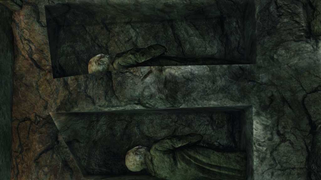 Down the shaft lie various entrances to the multilevel Grave of Saints. As the name implies, it is a “holy man graveyard” (聖人墓所) entombing countless clergy. This is evident from the area’s first bonfire dubbed Harval’s Resting Place, more accurately “Clergyman Hakbal’s” Resting Place. (聖職者ハクバルの最期の地) The bonfire name is likely a mistake; Harval’s supposed final resting place is situated at the cave entrance leading into the actual graveyard, whereas the Grave Entrance bonfire is perversely located in the catacomb’s deepest reaches. Since both bonfires are listed adjacent in the game’s code, it is possible for the names to have been accidentally swapped by FromSoftware, the small detail going unnoticed through the rest of development. Regardless, Harval’s ministry firmly establishes the nature of the “Saints” buried in this Grave area.
