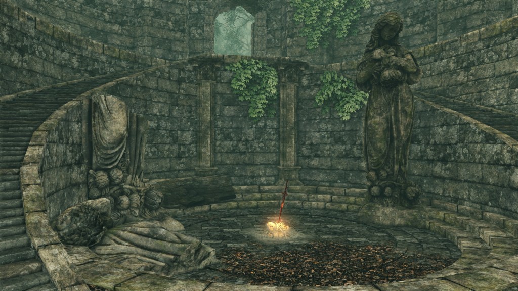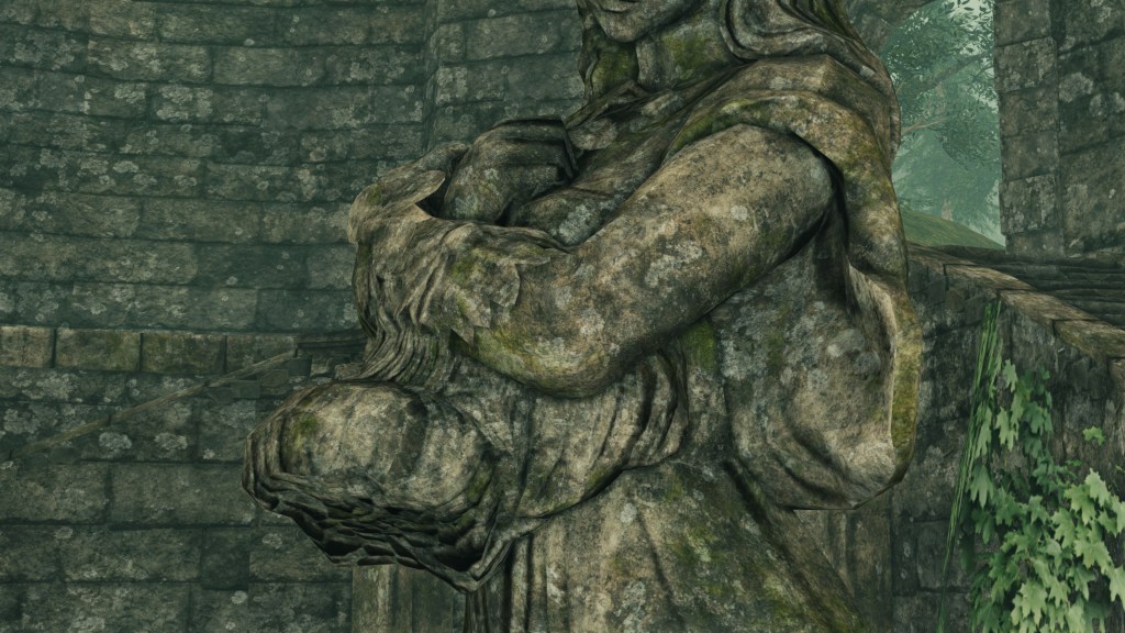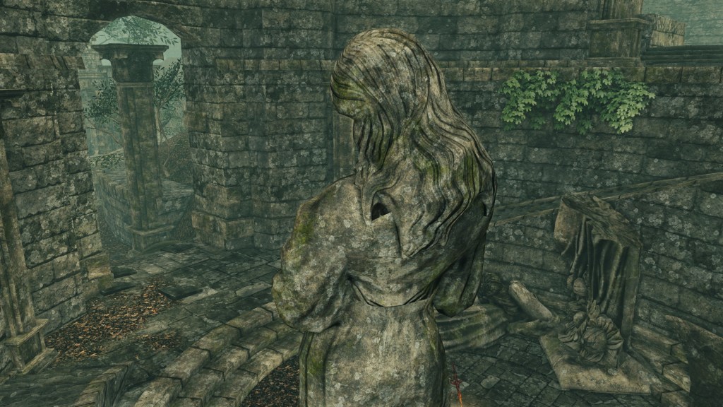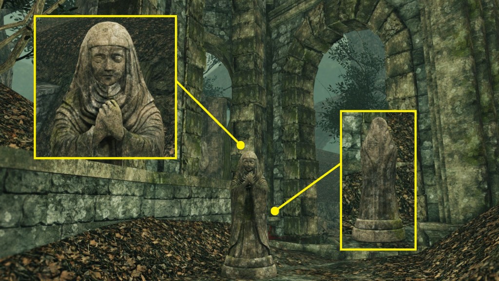 At the centers of the ruins stand statues of a woman, flowers held to the chest blossoming at her feet. The strong association with nature is appropriate for the area, but who is this figure specifically? If she is a goddess, then Gwynvere fits the bill. That being said, the harvest god doesn’t have any particular connection to Oolacile. Perhaps it instead portrays Elizabeth, who is revered as a holy woman that dedicated her life to relieving the poor with the help of her secret medicine. This vaguely lines up with DS1’s mushroom woman selling her own fungi as such medicine in Oolacile. Moreover, the description for Elizabeth’s Mushroom questions if her beauty matching her nobility is to be believed. Her legend has clearly been exaggerated to reimagine the kindly mushroom as a beautiful human, using all sorts of pills rolled up from New World flora and fauna. Therefore, the statue can be an icon of her. Another effigy connecting these ruins to holy woman worship is conjured with Chameleon. The figure resembles a nun in prayer, so it may be another depiction of the saintess.