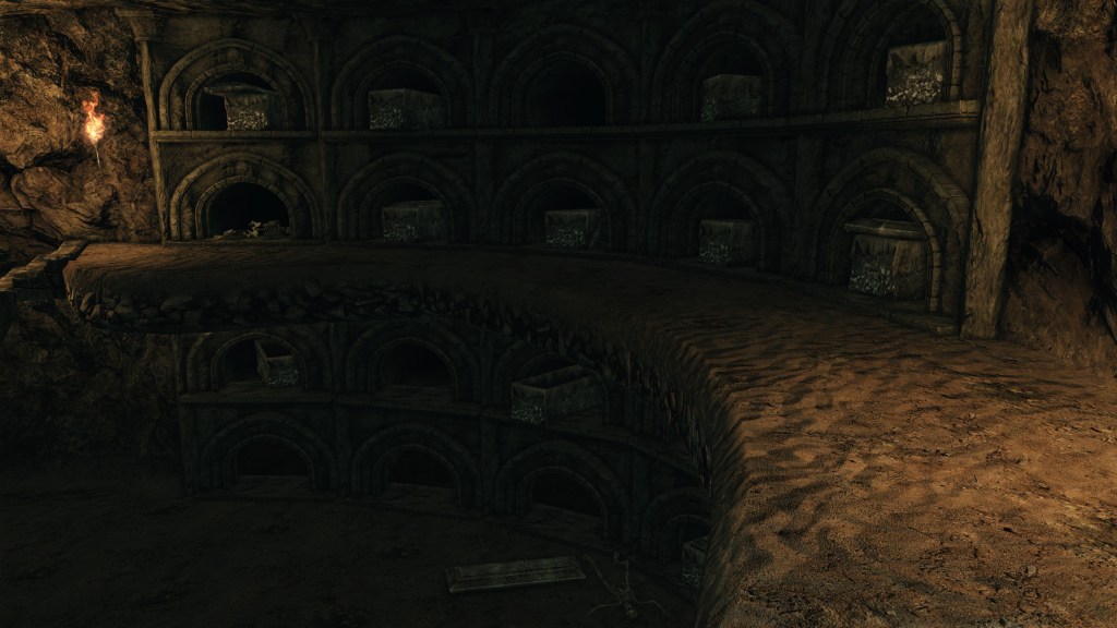 Besides their size, some skeletons and coffins are also shackled or wrapped in iron chains to keep them in their graves. This implies concern over these holy men rising back up again, whether due to undeath or grudges in life. Given the random nature of both curses, proactively chaining them so that they don’t freely wander around the crypt is prudent — once the gravekeepers found them, they could easily be put down or transferred to the Undead Crypt. But considering that this is only the case for some of the bodies, the practice likely only began much later after countless instances of these saints not staying dead. The reason is likely because they modeled their graveyard after the Catacombs from DS1, as evidenced by the shared iconography and style of architecture in certain areas. Heide built themselves a catacombs for clergy to reflect Anor Londo’s own without considering the change in circumstances since the dawn of the Age of Fire, forcing them to adapt to these newer factors after much trial and error.