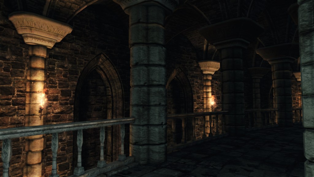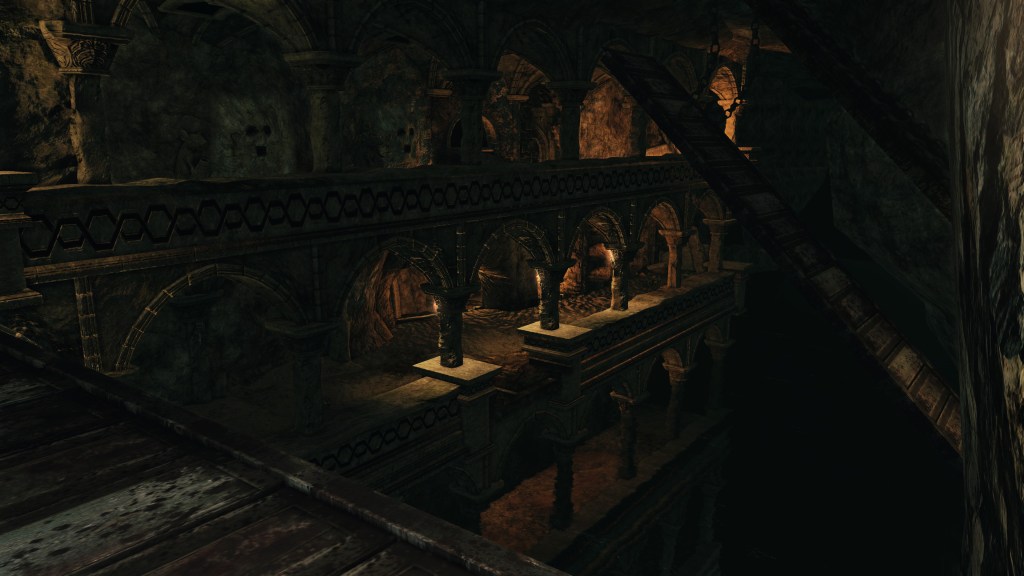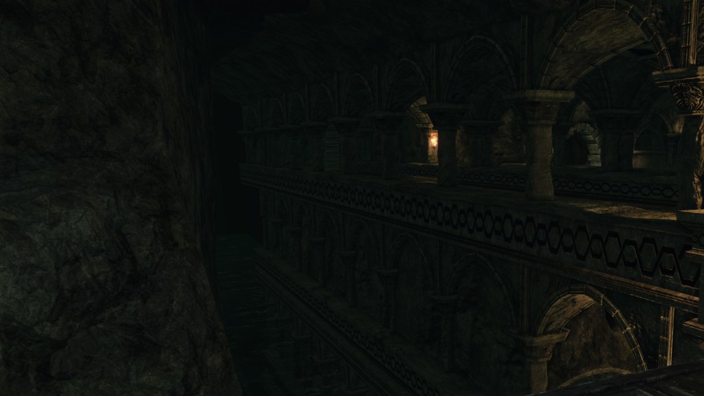 If Heide branched off from Anor Londo, then it only makes sense that they inherited its technical achievements. The city we explore is merely the pinnacle of an immense cityscape submerged beneath the water, with the church and the still-burning fire tower positioned at the apex — the Dark Souls II: Design Works confirming that the city centers around the cathedral. These landmarks not only reflect a civilization that values their religion and the power of fire above all else, but also demonstrate the lengths it went to preserve and even build upon medial culture. Nowhere in Anor Londo were there buildings quite so impressive except maybe its own cathedral, but humans made a monument to the holy fire wielded by the gods visible to anyone in or out of the city. This didn’t stop memory of their gods from being perverted, but it does show the depth of their reverence for them. How much of Heide replaced the old cityscape isn’t obvious, but they at least kept the recognizable style. This preservation and refinement of Anor Londo’s works extended beyond just architecture.