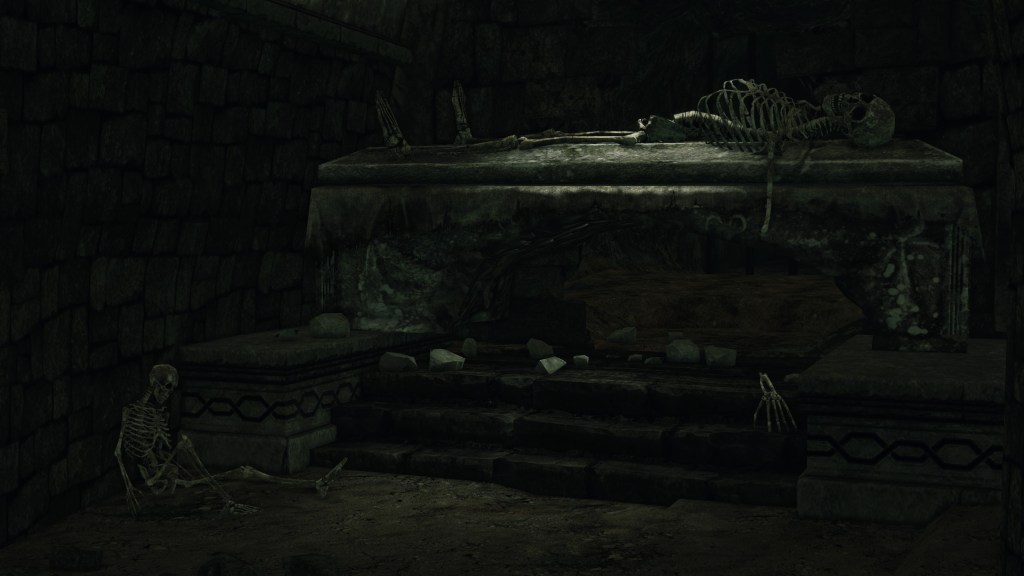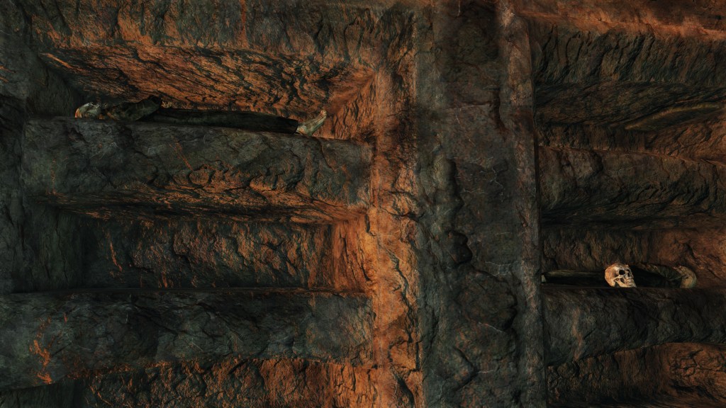In the end, the civilization was ravaged. Although the ruins themselves are remarkably well preserved, the indoor chambers and passages beneath the ocean’s surface are still ankle-deep in water and likely completely flooded at the base of these towering buildings. Few going about their daily lives within the city would survive the sudden crashing waves and resulting seismic activity. The same holds true for the Shrine of Amana and Grave of Saints — anyone in those areas would have drowned or become trapped during the flooding. Perhaps some had attempted to escape this fate by burrowing out of the complex, hence why our primary entrance to the Grave lies through a crude tunnel dug out to the Pit. But instead of a lift to the surface, the victims found an empty, unscalable shaft to deeper underground. No amount of digging would lead these survivors out of there before they succumbed to starvation.