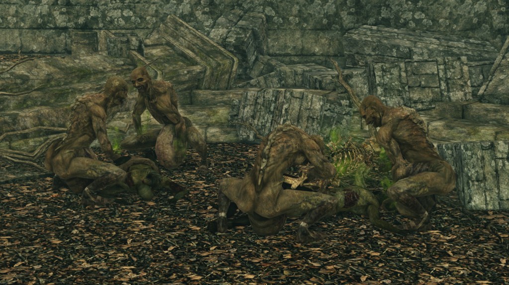 In short, more residents of Heide have survived to the present day after civilization in the woods fell apart. With any remaining food getting stolen, the starving citizens began eating their fellow man. And when that resource inevitably left arm’s reach, the cannibals started to seek out fellow survivors and, eventually, anyone passing through the forest, going native in the process. Their single-minded focus on hunting for prey without tools would explain their subtle transformation, DS1 having already shown how obsession can cause the soul to twist the body. Whether or not the grotesques can even be considered Hollows, scarfing down whatever they can has nonetheless become mindless instinct as the savages enjoy unnatural longevity. Insofar as they still behave human, it is other survivors treating them as such by throwing the “criminals” into jail, often with their meals, before public order had fully disintegrated — as the countless more grotesques still in the forest show, that semblance of civilization didn’t hold together long. Darksign or no, the people have become monsters.