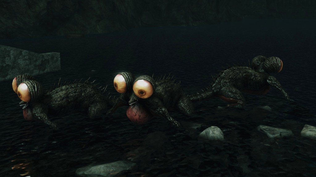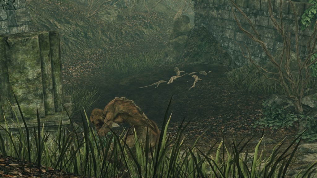 This isn’t the only instance of such incident, as the Shrine of Amana has grotesques of its own. These “Amana grotesques” (アマナの異形) are treated as Hollows by Soul Appease despite appearing far less human. With their long tails, clawed digits, and extended tongues, they look more lizard than man; the tattered clothes are the last sign of their former civility. But while not strictly amphibious, these lizard-men also have a second set of eyes, perfect for maintaining visibility as they lie low in shallow waters. For sure, the grotesques lurch around the flooded ruins on all fours ready to ambush passing prey, those long tongues suited to scooping up small bugs or red leeches infesting the marsh. By all indications, their bizarre forms are the result of Hollows transforming in order to adapt to the marshy environment, their sheer number further suggesting their longstanding residence in the area. Combined, the grotesques must be another result of some Heiden survivors’ desperate hunt for food after the waters destroyed civilization.