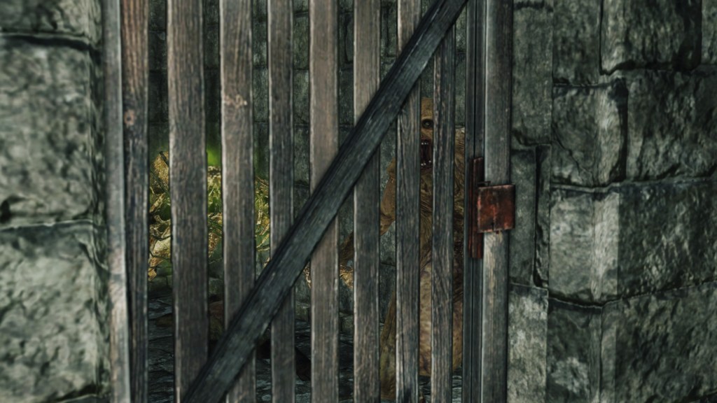 Indeed, we can derive a Heiden connection from the many lingering in the first ruins we come across after leaving Majula. Inside, the monsters remain behind wooden barred doors with locks on the outside, almost like jail cells. To that point, the building is set up like two cell blocks, divided by a metal door. The cells in one block automatically open when we active the mechanism to open this door, which coincides with closing the other entrance to the block. This serves to facilitate the transfer of prisoners between blocks, painting the ruin as a kind of jailhouse. The local bonfire labels this location as Old Akelarre, but that is simply a Basque term for a Witch’s Sabbath, the localization taking creative liberties with the name “Place the Witch Stayed” (魔女がいた場所) in obvious reference to Rosabeth; the “magic woman” was petrified while trying to escape a basilisk in the ruins, her hands still on the lever to the door. The actual ruin is patently a kind of Heiden jailhouse, and it imprisons some of these grotesque cannibals.