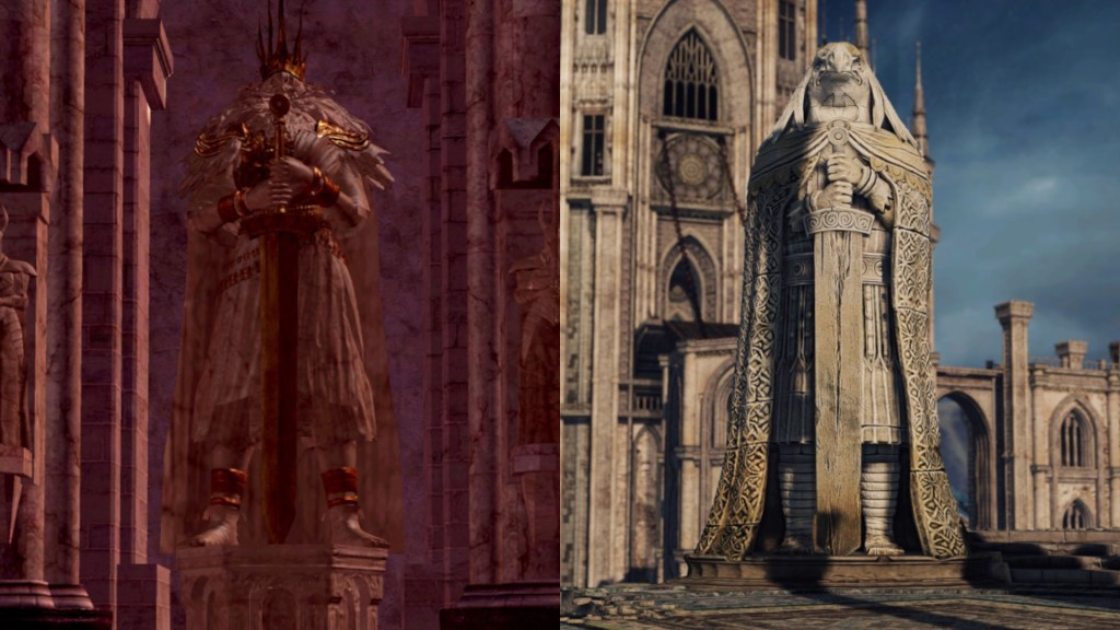 The architecture to Heide’s Tower of Flame is reminiscent of DS1’s divine capital, from its bright stonework to its gothic style. The civilization also seems to have worshiped the sun symbolizing the First Flame and the power of the gods. Despite its name, the Cathedral of Blue uses red banners and rugs while the Tower Shield stored there bears a personified sun on its face. Moreover, statues found within and without the church are clearly modeled after the statue of Gwyn seen in Anor Londo, except replacing his visage with the head of a falcon — taking clear inspiration from Ra, the sun god of Egyptian mythology. Aside from connections to Gwyn and the gods in general, we can also find a Divine Blessing in the area. This holy water belonged to the goddess Gwynevere, who once resided in Anor Londo and had left some vials behind in DS1. Likewise, the Heide Greatlance is imbued with the power of lightning, a manifestation of sunlight which had previously been exclusive to Gwyn, Gwynevere, and parties connected to the Anor Londo gods in general. If only superficially, the two cities mirror each other well.