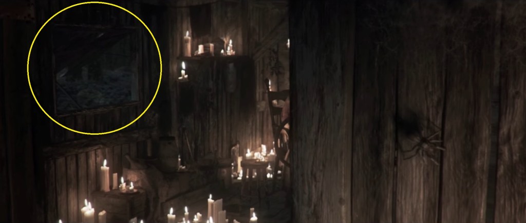 While some have suggested that this is a memory of the our wife and child, it is more likely a recollection of our mother with us as a newborn. The Japanese description for Homeward notes that cursed Undead gradually lose their memories until they eventually even forget their own births, an obvious allusion to the cinematic. Ignoring the realism of us remembering our own birth, the underlying message is clear: the world of man rejects Undead and often casts them out due to their inevitable hollowing, just like in DS1. The Darksign will leave us nowhere to go for relief, not our birthplace, not anywhere. This excludes the Undead bonfires, of course. How fitting then that we apparently came across a quaint home in the forest where we sought shelter inside for a short reprieve from the rain. We soon discovered that we have intruded upon the home of an old woman. We are provided no insight into what transpires between her and us, but we soon prepared to head back out based on the storm still raging outside just as we are about to place our hand on the doorknob. Only, something stops us.