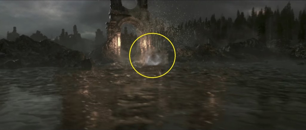Whether the god of dreams is acting independent of the Fire Keeper or is collaborating with her, they have ultimately succeeded in leading us to these ruins. The brightbugs begin to swarm us in apparent recognition of our curse, but when we look back up after examining them, we see a blood moon in the night sky. This is in stark contrast to the Darkmoon previously seen looming overhead only moments prior, although that crescent body had been slowly obscured by the clouds when we passed through the ruined gateway. This makes it possible for what we see to not be all that it seems. Lunar eclipses have historically been considered ill omens, and the moon is never again portrayed in-game with this ominous hue. This suggests that it is the byproduct of some magical phenomenon occurring specifically at the ruins rather than anything of greater cosmological significance. Indeed, the brightbugs go wild immediately after it appears, flying through the gateway and lighting its torches as they pass. They gather over the lake just off the shore, as if anticipating what happens.