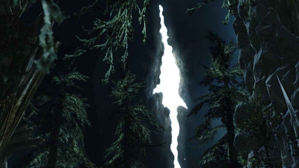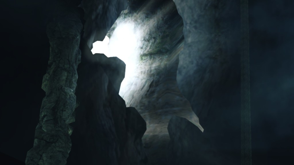 According to the Dark Souls II Collector’s Edition Guide, Things Betwixt is a small dimensional rift bridging Drangleic and the rest of the world. This is why the area is called a “gap” or “interstice cave” (隙間の洞) and has such irrational geography relative to other areas. This dark cavern is a distorted space, and we can see the massive breach in the cave we pass through to reach the world beyond. Yet once we enter Drangleic proper, we look back to find neither the enormous crack nor the massive cavern behind us, only a rift in a relatively small crag. This is proof that we had just passed through a gap in spacetime. Though the narrow passage makes it seem as if we simply passed through completely ordinary space, it was us crossing between dimensions. Indeed, if Lordran and Drangleic lay within time bubbles, then there must be some transition point where the space warps as you cross the border. Our experience through Things Betwixt thus appears to showcase that transitional space dividing Drangleic from the world outside.