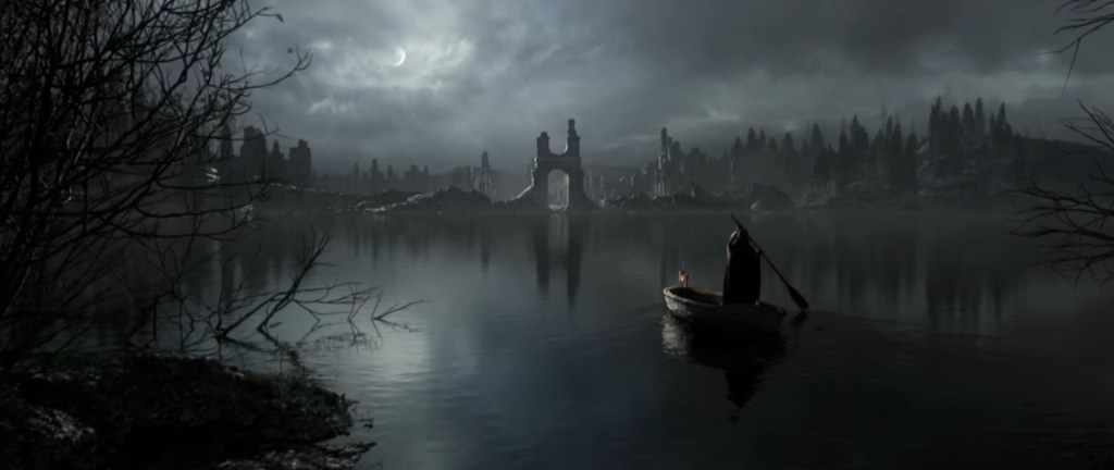 We eventually take a boat across a lake in a forest, possibly the same forest from the earlier sequence. At the other end are ruins to a large castle, the only prominent parts remaining being the main gateway and some interior pillars and arches. More shadowy ruins can be seen further in the background, emphasizing the sheer scale of this complex. But after stepping through the gateway, skeletons litter the ground around us, and countless more can be briefly spotted at the lake bottom. One particular skull has a glowing insect that takes flight upon our approach, with more lingering around a lone tree at the center of this ruined atrium. They appear to be brightbugs, which comfort the dead in the watery areas leading up to the Undead Crypt. This implies the skeletons to be Undead that perished at this location, and relatively recently given their exposure. Were they fellow travelers trying to reach this place? But why there, and how come now dead? Surrounding the bones, the aforementioned tree stands alone. Was the fort built to safeguard this tree or did it come after? In either case, one must question its significance.