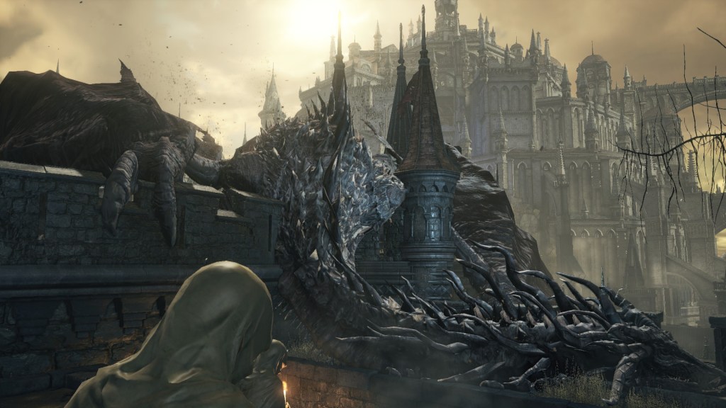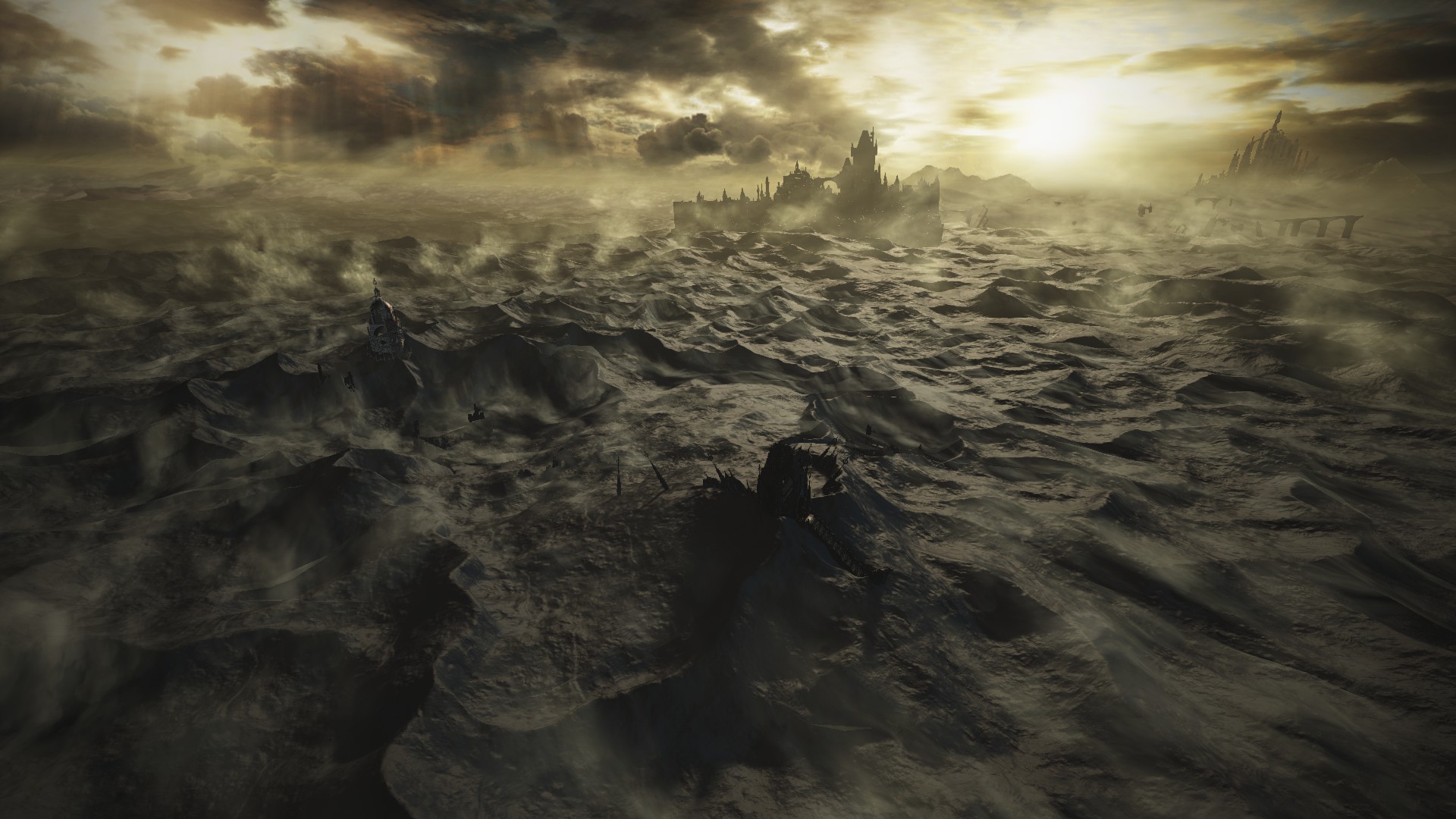 The Dreg Heap is more accurately the “Drift”, (吹き溜まり) referring literally to piles blown in. But rather than leaves or snow carried on water or wind, this area has accumulated every land around the earth, pooling them all together at world’s end. Although much of the background is repeated Lothric assets, the inclusion of Firelink Shrine and the Undead Settlement suggest that these do represent various locales. The stone-humped hag confirms that this stagnation signals the Age of Fire coming to an end, and Lapp further indicates that not all of these lands come from the same age. In fact, we see remnants of both DS1’s Firelink Shrine and DS2’s Earthen Peak among the ruins we explore. Both areas could have been dragged into this temporal melting pot at any point following the events of their respective game, and both are unlikely to have survived the natural passage of time leading up to DS3’s events. Every land will eventually be drawn in, and this stagnation culminates into that same desert during the final sequence of the The Ringed City DLC. We are therefore introduced to the inevitable future.