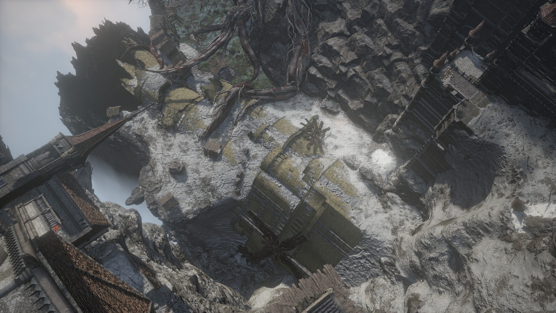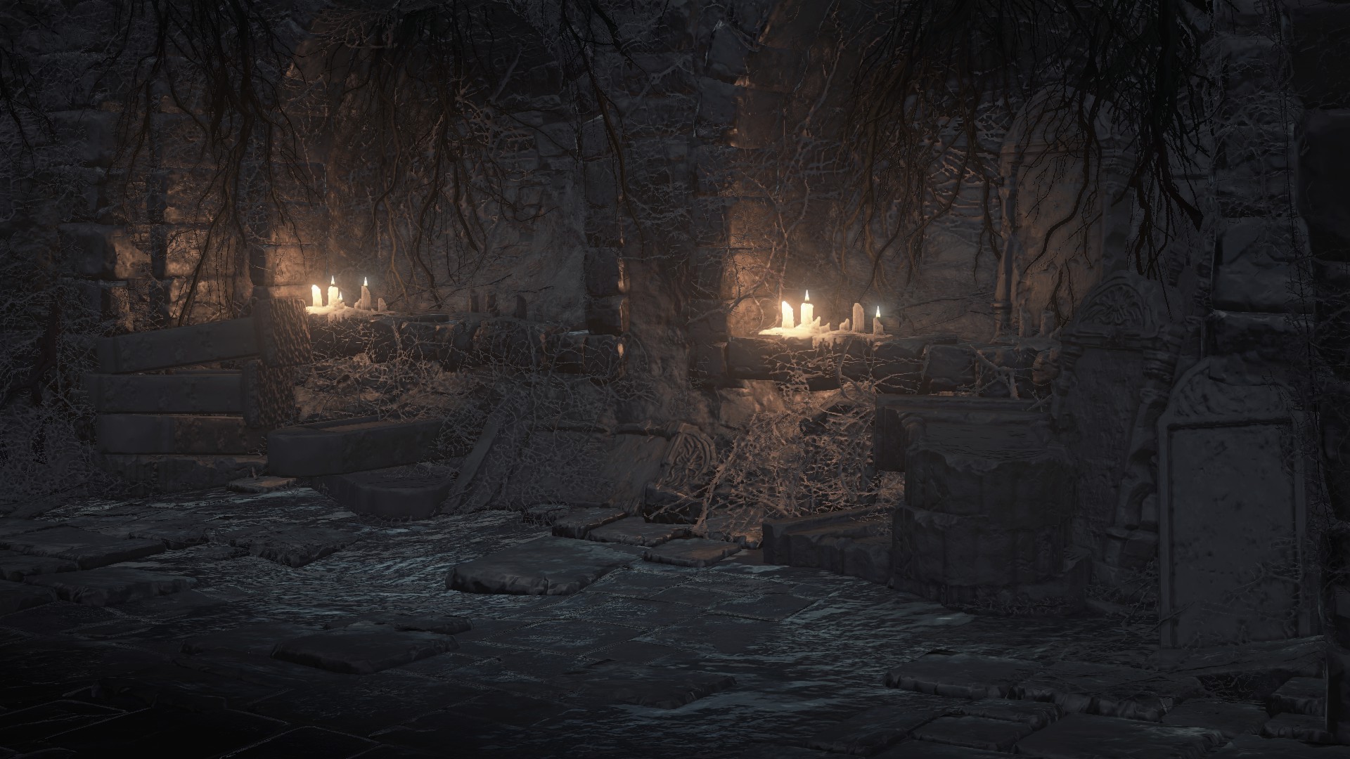 Their successor kneels whilst grasping the coiled sword of Firelink Shrine’s bonfire, which sits within a replica of the Lordvessel from DS1. The Fire Keeper overseeing the ritual then calls upon the Lords seated around to sacrifice themselves for the new inheritor, bodies burning up in flames as the light and heat are drained from the surroundings — even the candlelight. Once all the flame coalesces into the Fire Keeper’s hands, she rains the resulting ashes upon the firelinker, which sends us to the same bonfire after the shrine has become part of the Dreg Heap. From there, we can use the bonfire network to warp to the nearby Kiln from DS1; although the original temple hasn’t survived the ages, the tree base it sat upon has. We essentially use the spatial-temporal link of the shrine bonfire in combination with the ashes from a sizable mass of the First Flame to arrive at a period where the two are most closely situated. This method is certainly less practical than pathways in past games, but perhaps its architects foresaw the inevitability of this world state in the event that such an emergency situation ever actually came to pass.