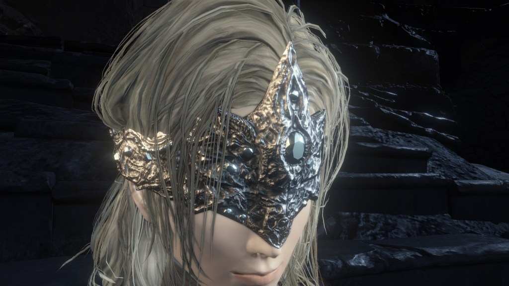 Of course, the system set up by the gods will never allow it, now willing to even use ash to keep the Flame alive — the irony. And every cog in this system plays its part. This includes our Fire Keeper, who in the midst of some sort of ritual takes a silver crown from an altar at Firelink Shrine as the bell continues to toll for — based on the accompanying narration — the Unkindled she will serve. After putting it on as a mask, she looks up as if amazed to see the light pouring into the room shine upon her face, and her in-game dialogue confirms that she is blind. The mask apparently substitutes for her sensory organs, magical energy on the backside amassing into a vortex at the nasal bridge to presumably grant her vision. This isn’t unique to her, as we learn that all Fire Keepers have lost their eyes after the “first” — specifically the first in Lothric’s system considering that this wasn’t the case for any Keeper in games prior. The reason is because this first of her line had a vision. And the sight, literally “scene of light”, (光景) she witnessed was firelinking ending and fire along with it, leaving the world in eternal darkness.