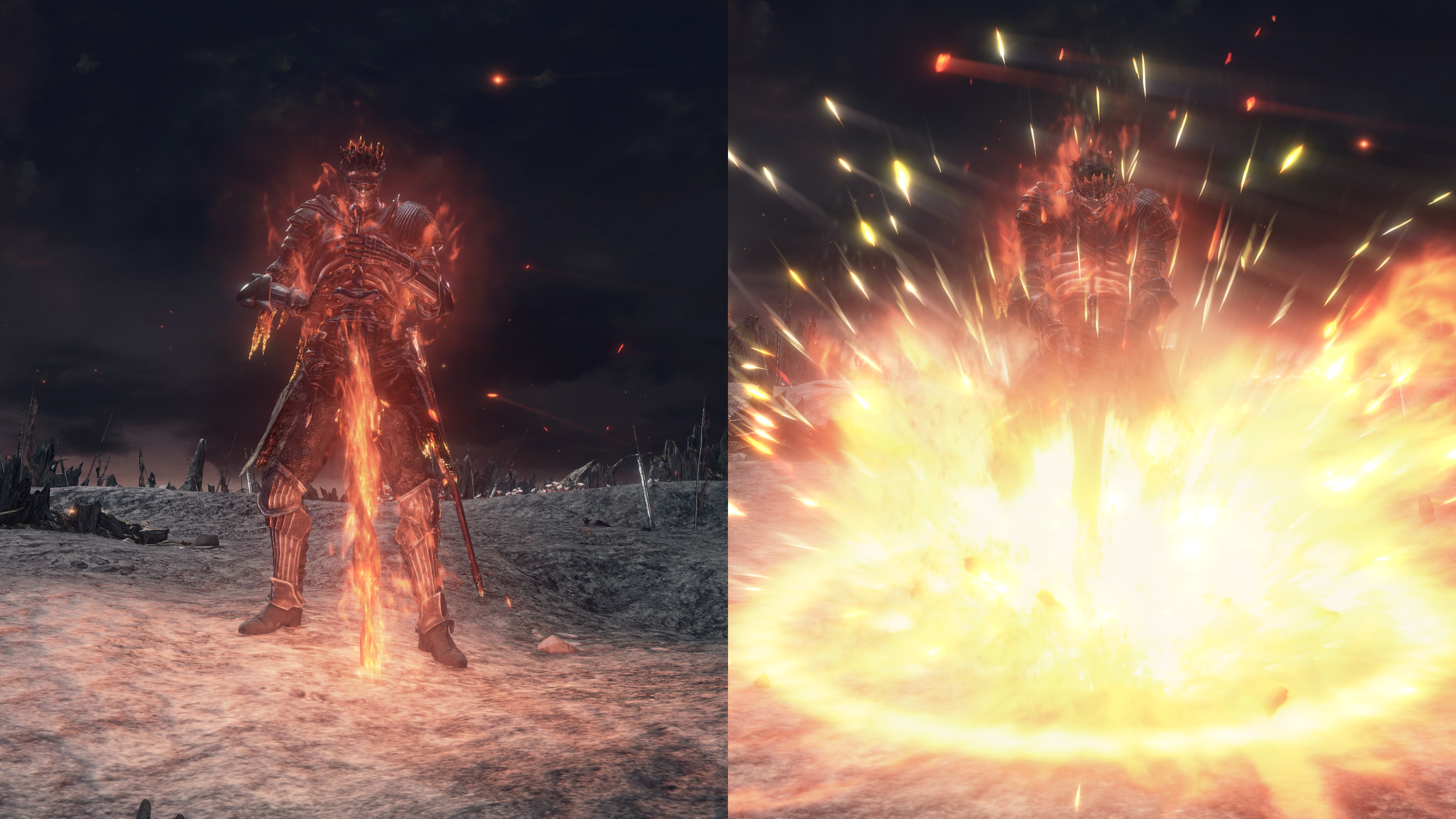 But whether required or not, fireless ash are nonetheless drawn to the fire that remains. Fire has always captivated life from which it derives, but an Unkindled’s fixation runs much deeper. Just as Dark follows light, ash follows fire, so it is only natural for unkindled ash — saved by the quirks of a Dark curse — to chase after flame; one ending to the game even has us give in to that nature. When the Fire Keeper begins to squelch the First Flame, we can backstab her, mercilessly ripping the remaining fire from her dying hands. The manner in which we raise up these pilfered embers along with the ominous refrain of the opening narration confirms our intentions. Ash seek embers, and we have been consumed by our desire to have them all. Rather than tie ourselves to the bonfire network, we have used the Fire Keeper to sever the First Flame from it, enabling us to inherit with no strings attached. Such is our treachery and our obsession, but we are only tempted because the Fire Keeper is there under the auspices of kickstarting the Age of Dark. Absent that development, an Unkindled’s nature holds great potential for the firelinking.