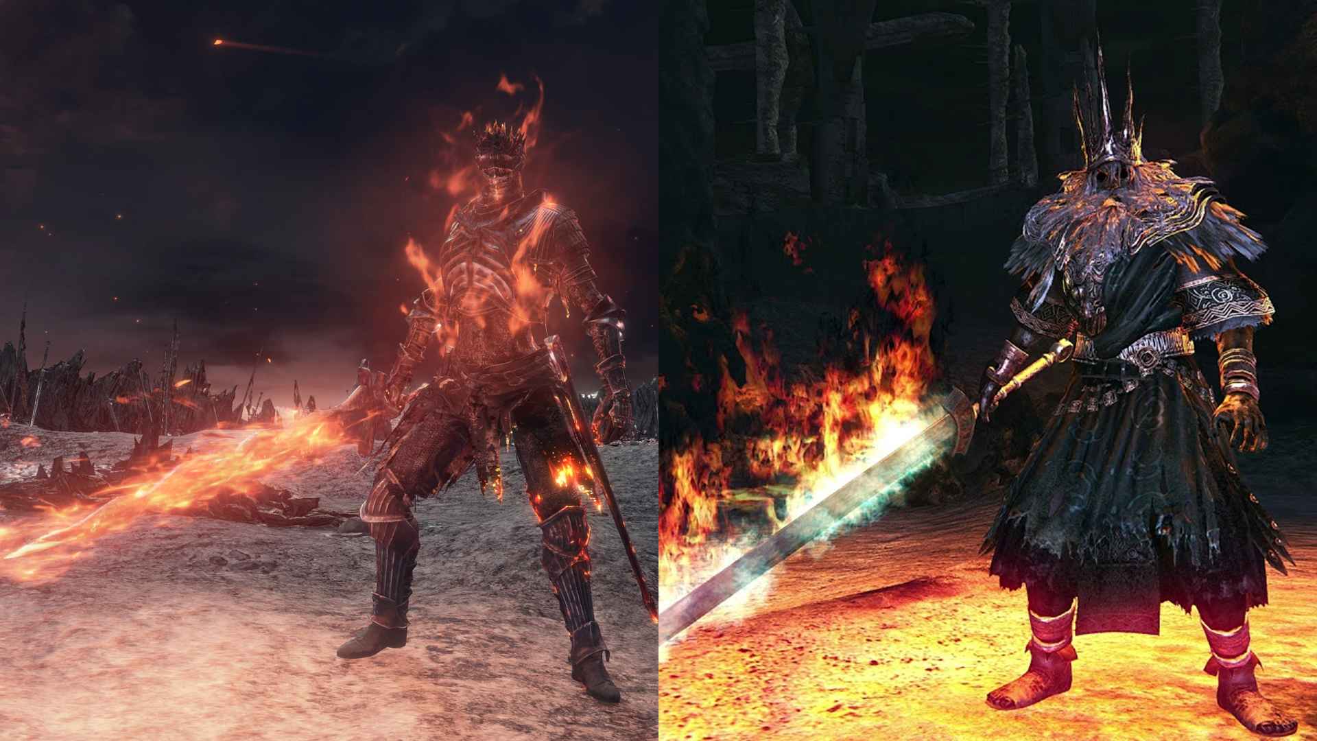Finally, we are introduced to the Soul of Cinder, or the “Kings’ Incarnation”. (王たちの化身) Rather than just a Lord of Cinder, this entity arose from the composite soul of all the Lords of Cinder. These Lords incarnate fight as one to protect the fire, wielding the very coiled sword used to link it — even using the power of that flame to change its form and thus their fighting style to those of another Lord, such as Gwyn. While this would imply that the soul of Gwyn running amok in DS2 was indeed merely a fragment, the development in itself is no surprise. With every Lord of Cinder being buried at Firelink Shrine with only a piece of the First Flame, something has to be left at the Kiln to fuel the rest. DS2 already proved that powerful souls can maintain their autonomy after death as well as coalesce due to their shared will despite varying histories. So, after directly absorbing the souls of Gwyn, the Chosen Undead, the Bearer of the Curse, and countless more with strong wills, there is no individual — only the Lords personified into a singular being, a collective consciousness united by mutual desire to preserve flame.
