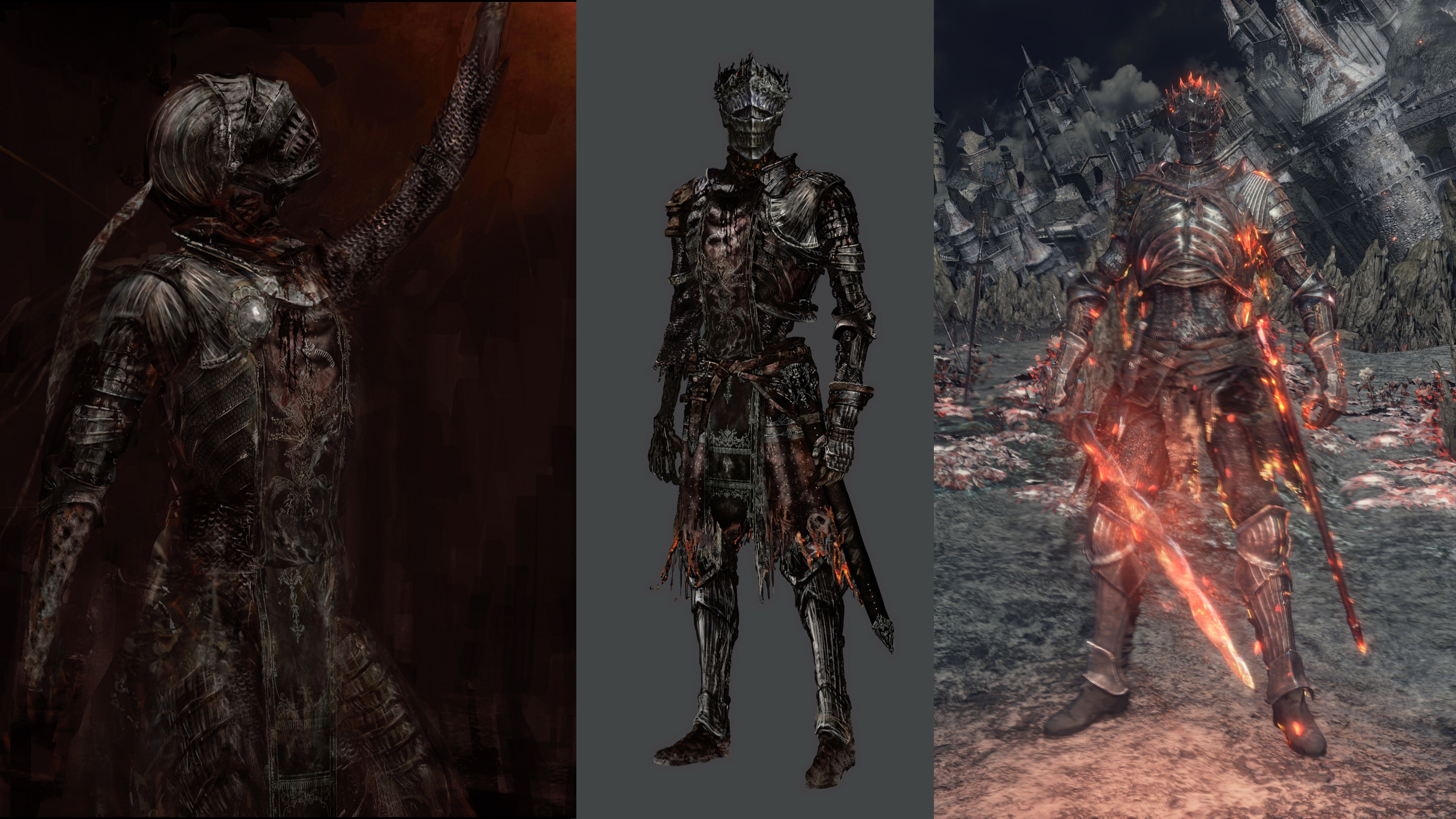It is this Soul of Cinder who we see dragging a corpse — an Unkindled if the accompanying narration is any indication — past a bonfire in the final sequence. Looking at the surrounding stone architecture and ash in the air, the setting is Firelink Shrine. If so, it suggests that the Lords’ incarnation personally brings back these failures, perhaps implying that Unkindled can also result from the boss slaying challengers with the coiled sword bearing the First Flame. However, this corpse-dragger is wielding an ordinary sword matching the style of the armor, so this may not even be the same character. The Soul of Cinder is portrayed with various swords in official artwork, and the character even takes on the role of the player in concept art. Indeed, the cinematic ends with this entity kneeling whilst showered with ashes the same as us during the Kiln ritual, only grasping said ordinary sword. This final sequence may thus be designed to be more artistically provocative than narratively informative, presenting a duality between the one who pursues firelinking and the one who ultimately attains it.