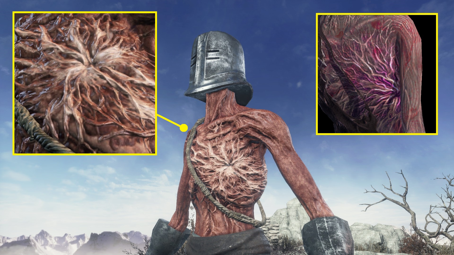 Close inspection of certain skeletons reveals that what flesh remains has turned to stone while the bones themselves have sprouted tree branches or roots. Some bodies in the Undead Settlement also exhibit this petrification and dendrification. The latter has also occurred in Lothric, adulating Hollows seeming to turn into trees. These human trees often have peculiar grass sprouting at their base, and the same is true for the pilgrims furthest inside the city — in other words, who entered earliest before collapsing dead. The dendrification doesn’t just occur with the dead though, as some long-living Undead are similarly overgrown with roots. Since we can see that certain non-humans have petrified but not dendrified, the latter probably relates to humanity. Indeed, roots have always commonly sprouted from the hearts of Hollows, and trace amounts of dark souls might lace the earth where their bearers die. But no previous game had petrification occurring at seemingly random, nor dendrification manifesting to this degree, so they must be another byproduct of the world’s stagnation.