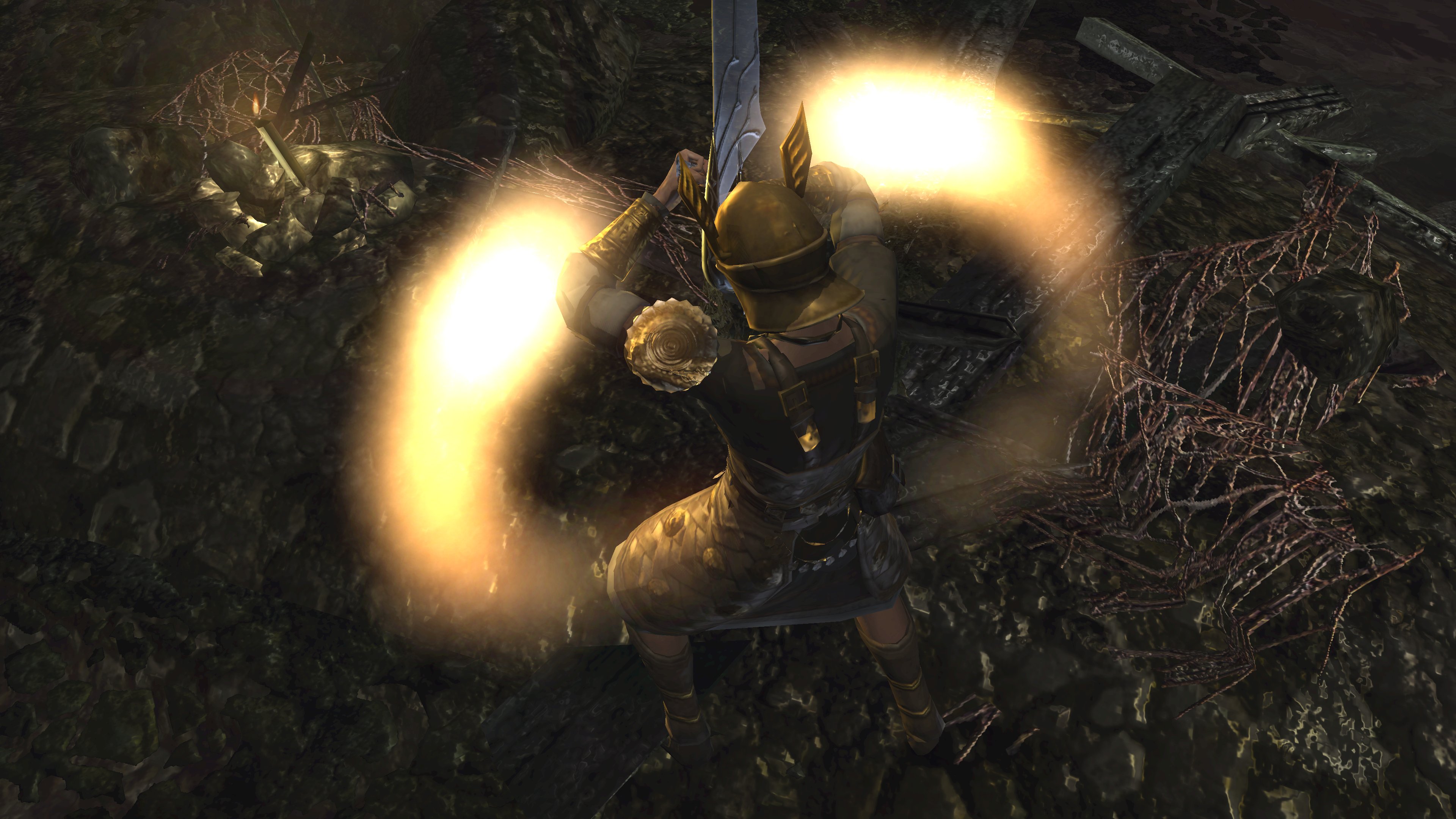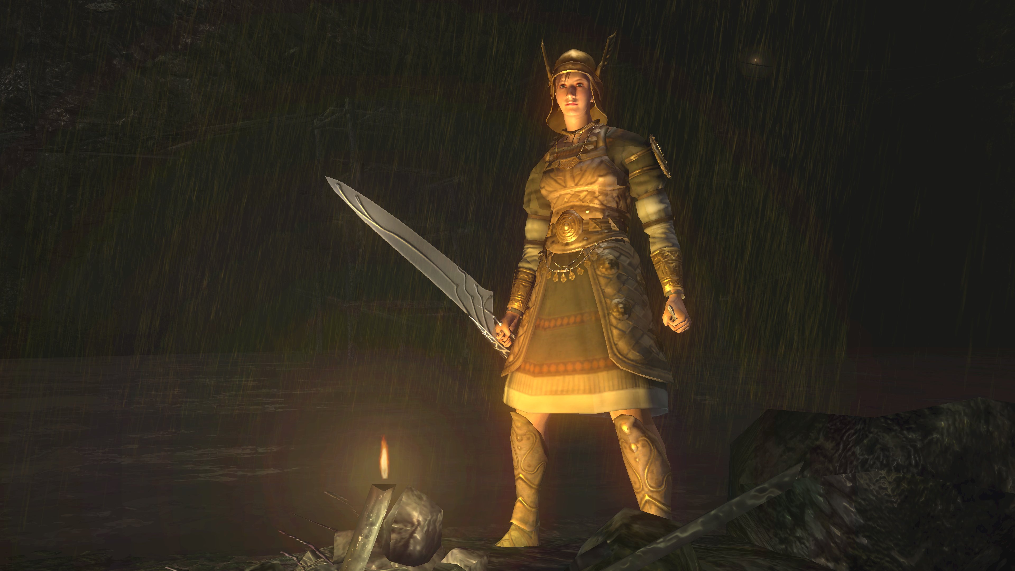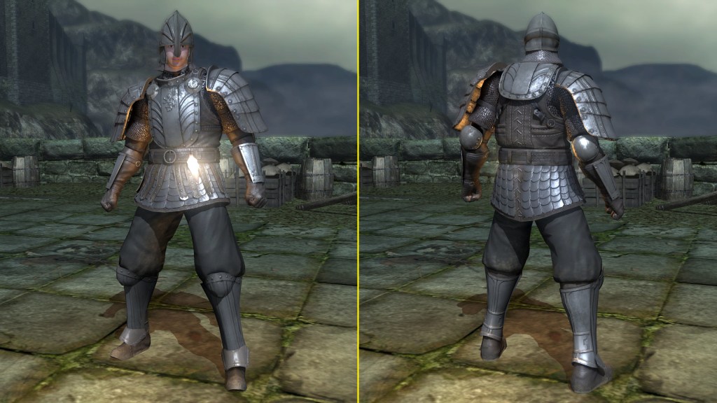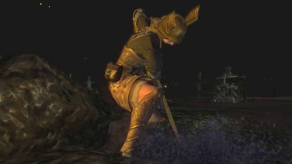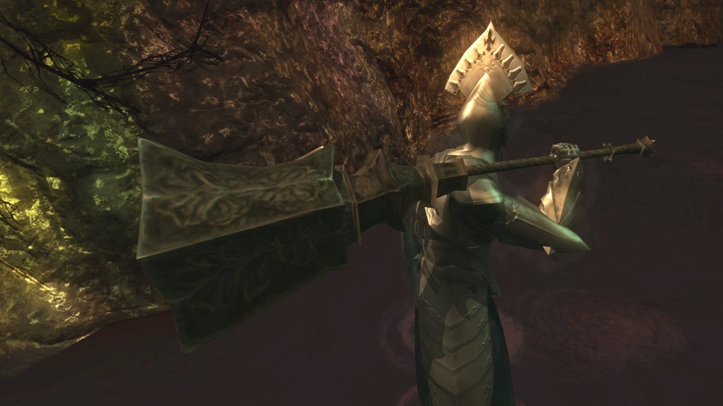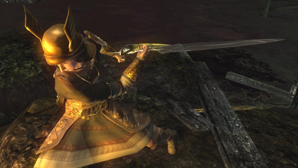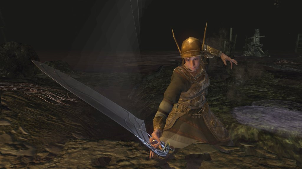 Unlike the Vinland siblings, Vito and Risaia are associated with their weapons instead of family names, both Istarelle and the Large Sword of Moonlight — or “Moonlight Greatsword” (月明かりの大剣) to be consistent with later FromSoftware titles — considered “revelations” from God. In other words, these weapons are their property, known for what they have accomplished in battle while wielding them. One might think that the two knights had no background to rely upon, rising through the ranks through sheer faith and the providence. However, we can loot the dull gold set from a slug on an island in the Valley of Defilement’s swamp, adjacent to many more slugs clamoring for the Moonlight Greatsword hanging from the local village’s infrastructure. Based on the proximity, the armor most likely belongs to Vito, which would imply that the Moonlight Knight is both female and nobility like Selen. And if Vito is noblewoman, then the probability is that Risaia is one, too. Perhaps they did obtain their weapons through their own merit or providence, but lineage almost certainly played a role.