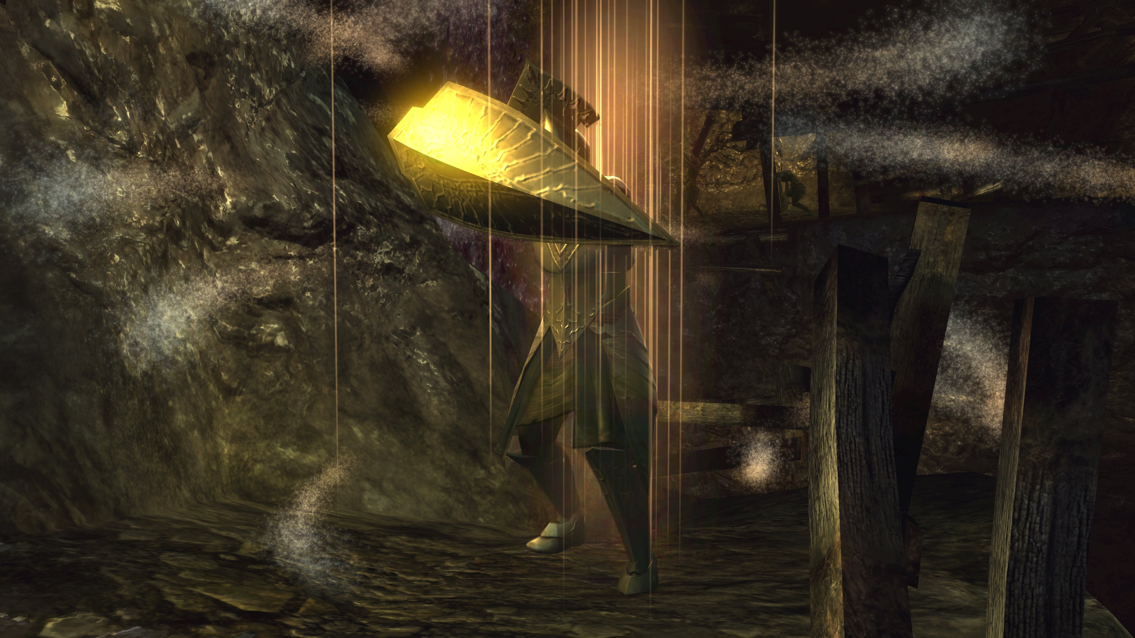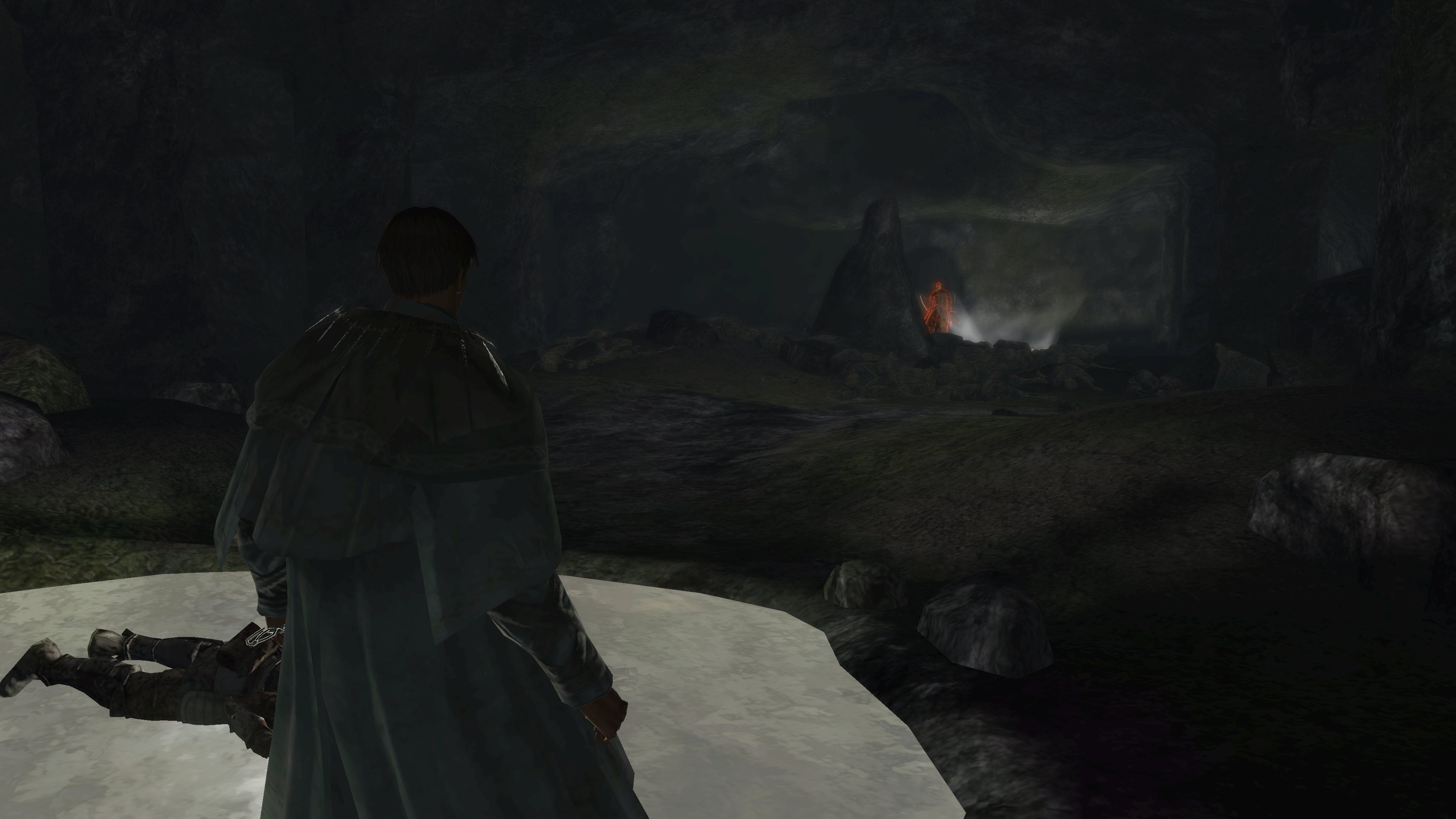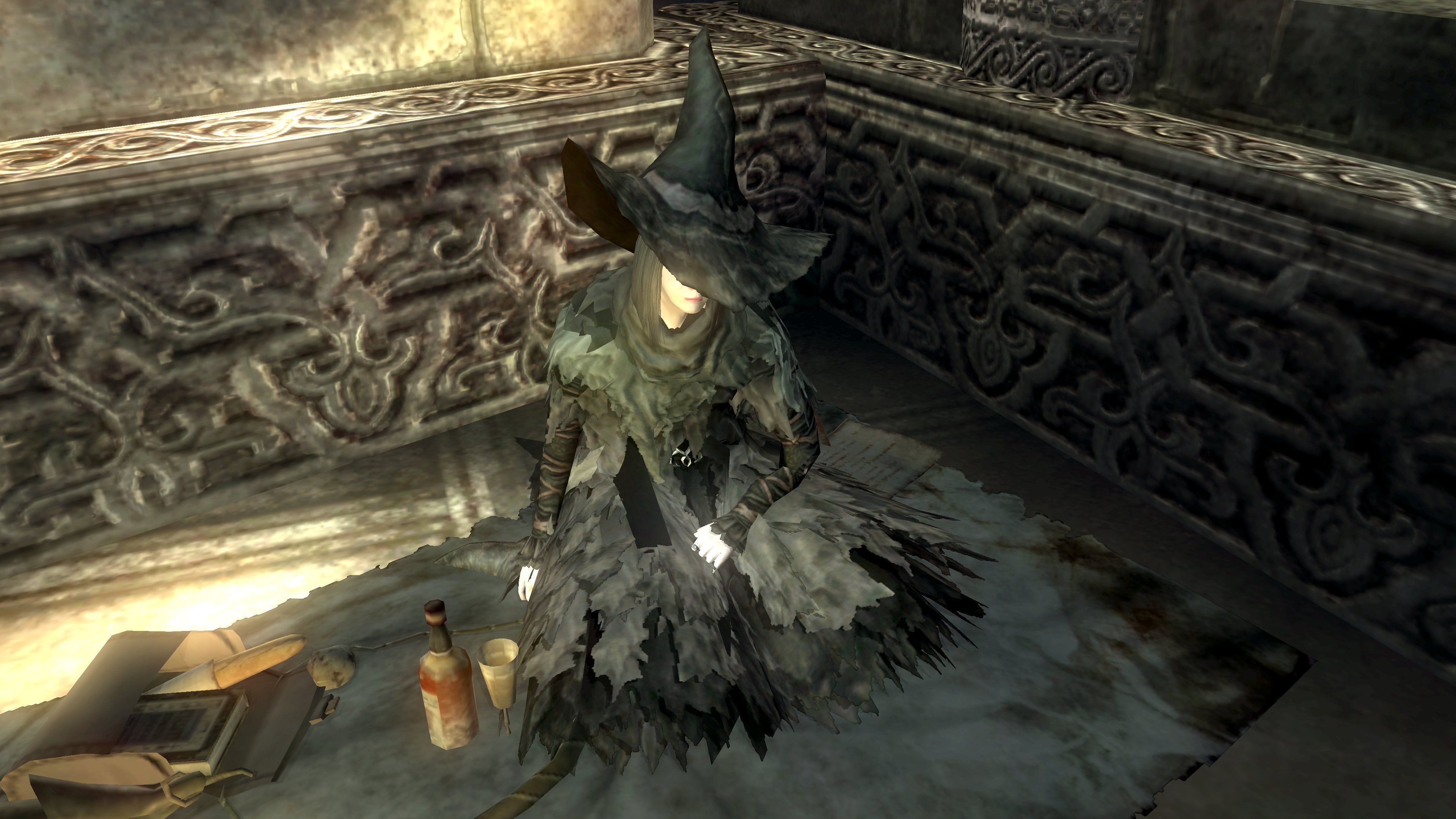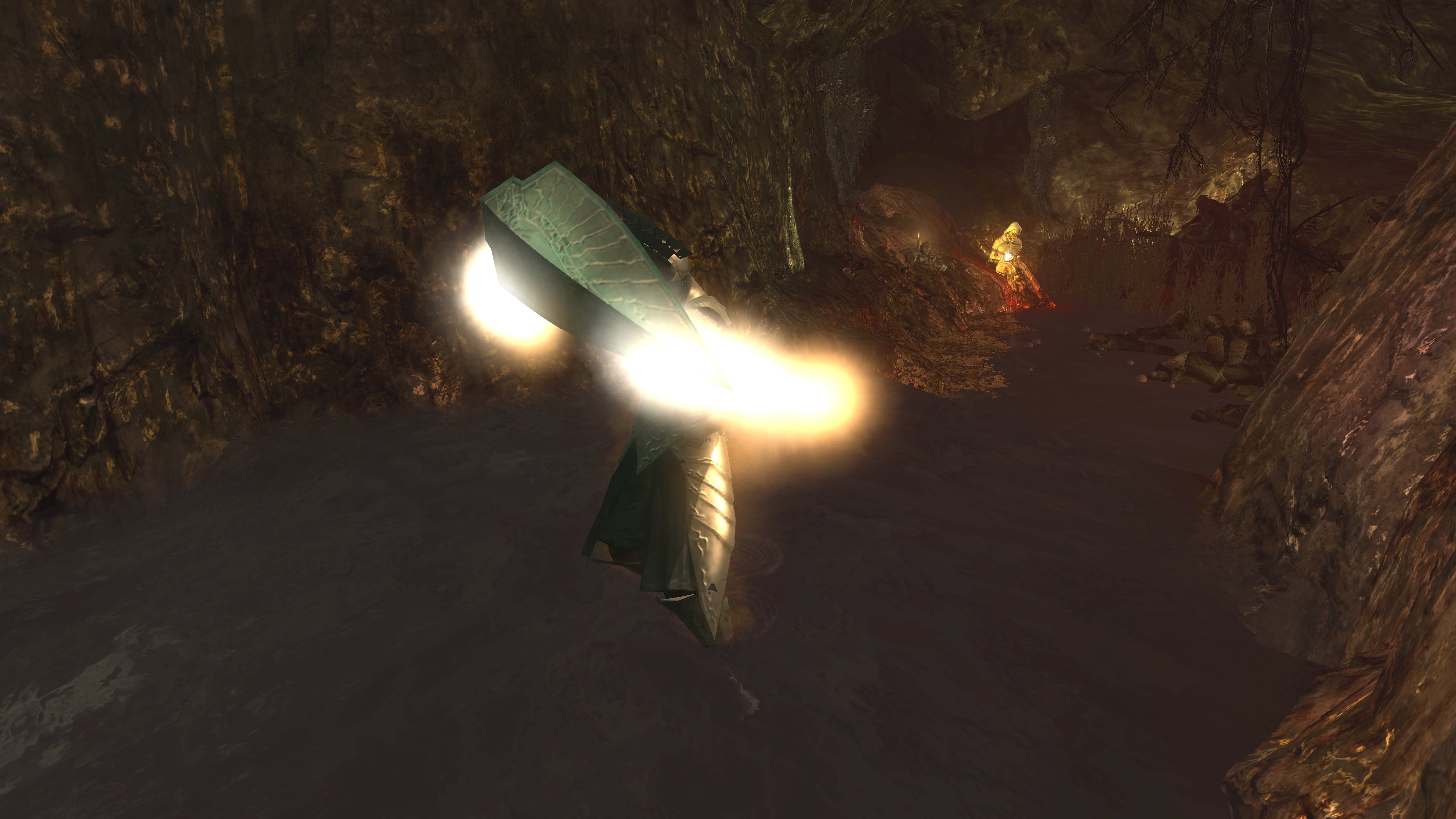 The priesthood invites such disingenuous clerics to have a platform, and Urbain is very much the rule and not the exception. Blocking exit from the pit is a black phantom dressed in the venerable sage’s set. Despite the localization claiming the outfit to be the dirty clothes of a sage, it is actually the garment of a holy man, hence why it looks almost identical to Urbain’s robes. Evidently, Urbain wasn’t the first high-ranking priest to be kicked down by Patches. This prior victim was apparently unable to either find the exit in the darkness, even though Urbain identified it by the echo, or physically leave. Whatever the reason, the fact he is a black phantom in “corrupted” robes dual wielding blades native to the area speaks to his ultimate fate, one which may well visit Urbain if he is never saved. The temple has failed to train its most devoted priests to resist temptation or remain resolute in the face of real adversity — their faith all too easily folds when it is no longer convenient. The priesthood’s idea of purity is far too superficial in every capacity.