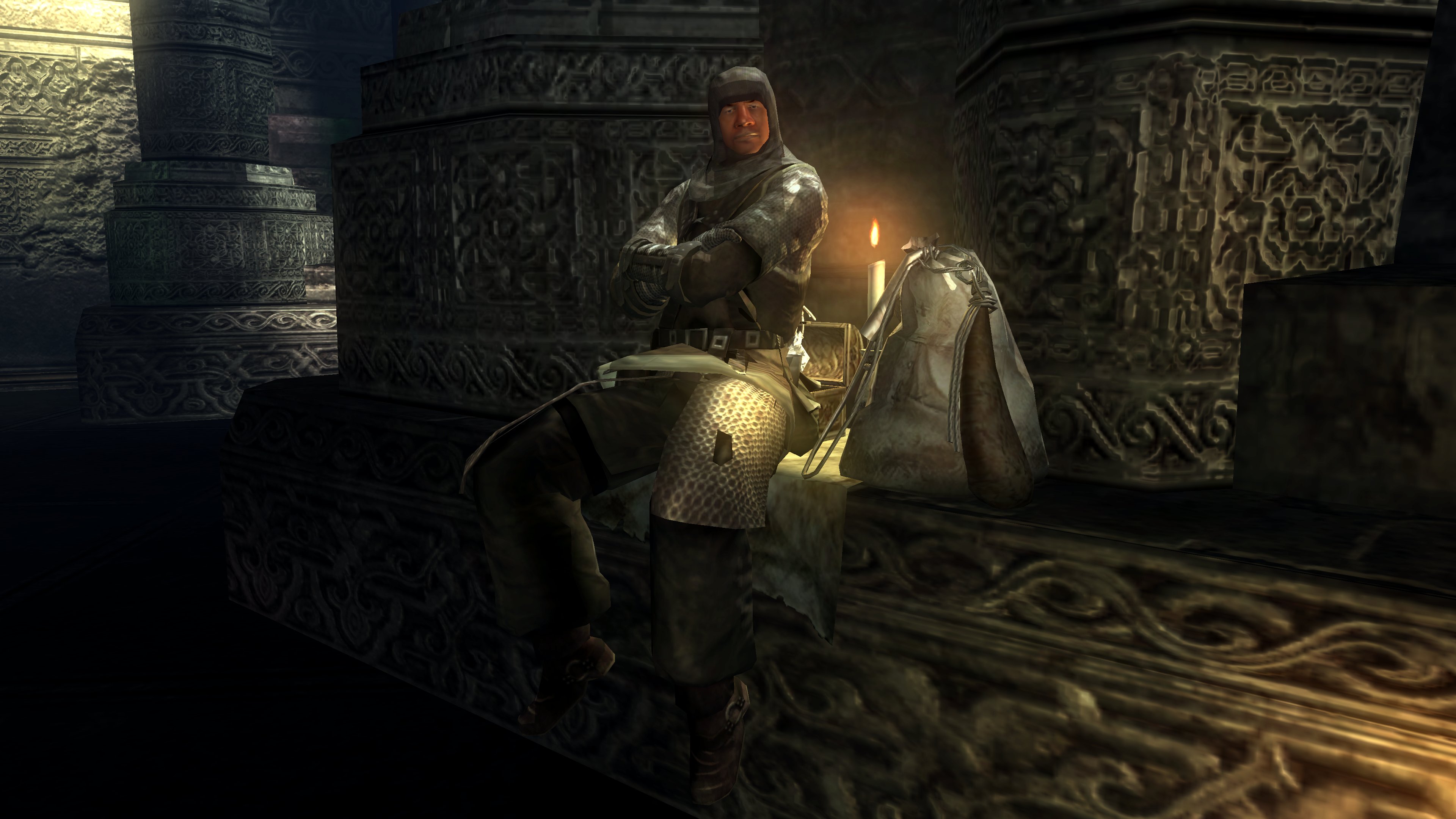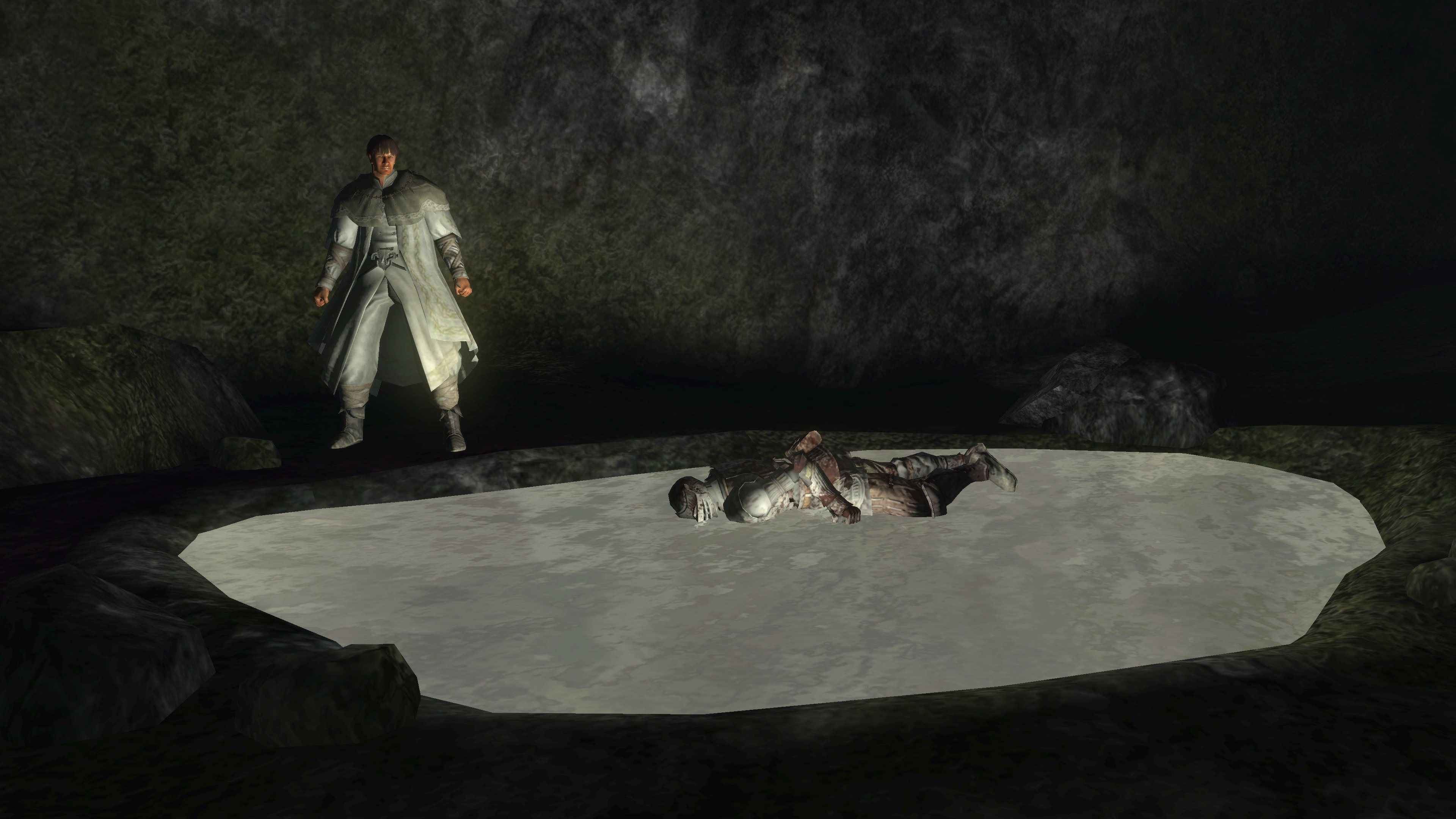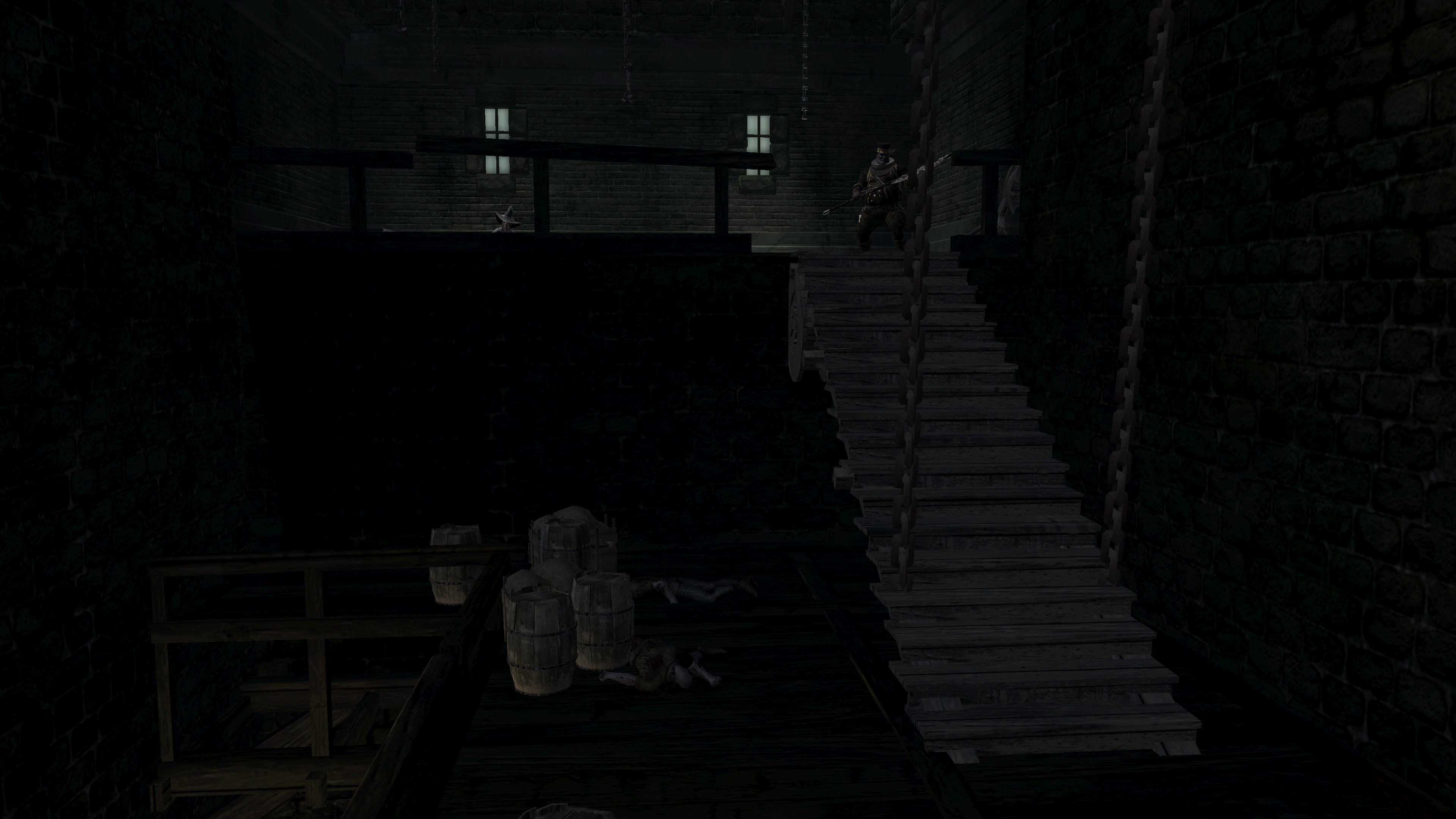 The priesthood invites such disingenuous clerics to have a platform, and Urbain is very much the rule and not the exception. Blocking exit from the pit is a black phantom dressed in the venerable sage’s set. Despite the localization claiming the outfit to be the dirty clothes of a sage, it is actually the garment of a holy man, hence why it looks almost identical to Urbain’s robes. Evidently, Urbain wasn’t the first high-ranking priest to be kicked down by Patches. This prior victim was apparently unable to either find the exit in the darkness, even though Urbain identified it by the echo, or physically leave. Whatever the reason, the fact he is a black phantom in “corrupted” robes dual wielding blades native to the area speaks to his ultimate fate, one which may well visit Urbain if he is never saved. The temple has failed to train its most devoted priests to resist temptation or remain resolute in the face of real adversity — their faith all too easily folds when it is no longer convenient. The priesthood’s idea of purity is far too superficial in every capacity.
