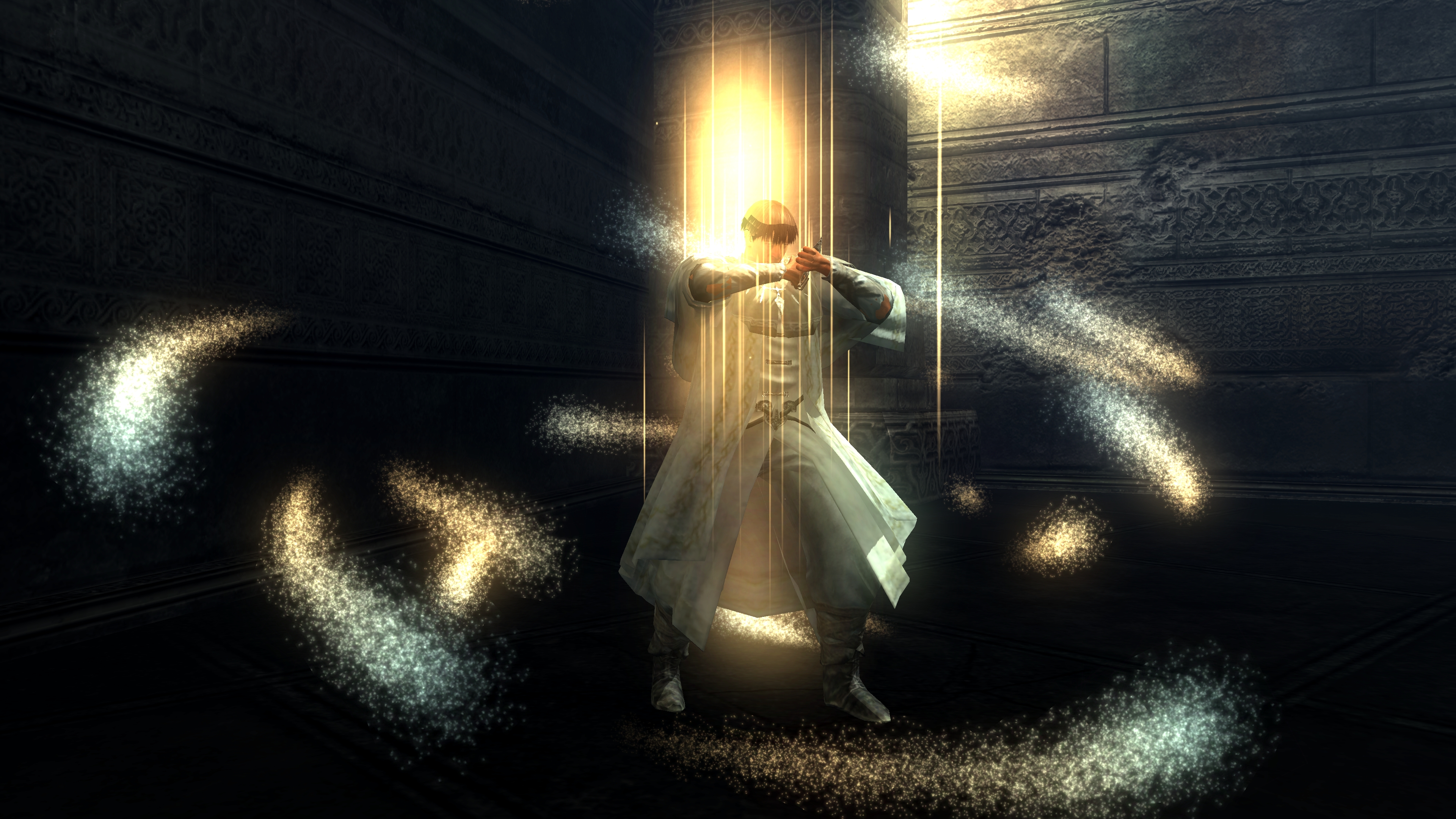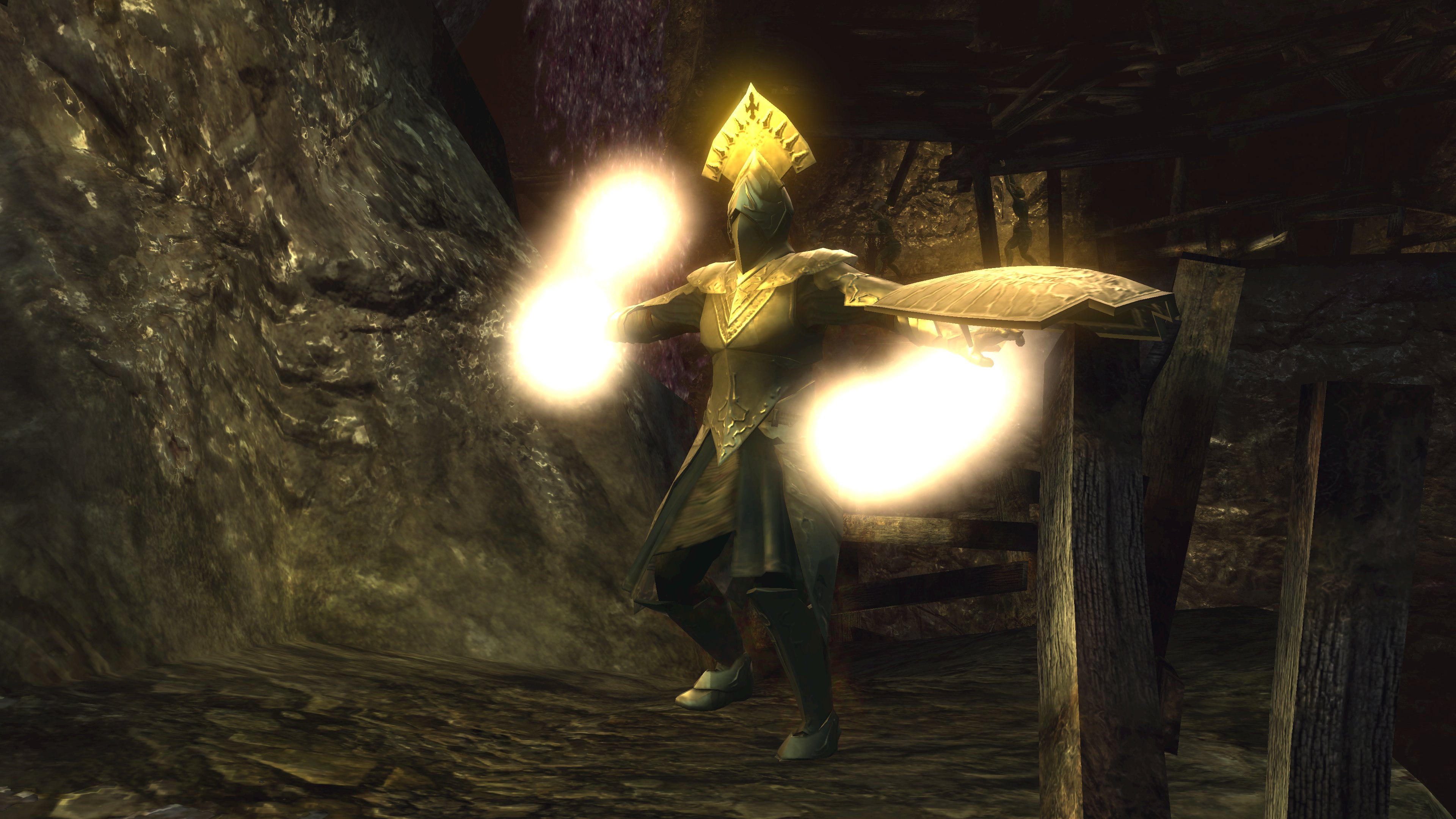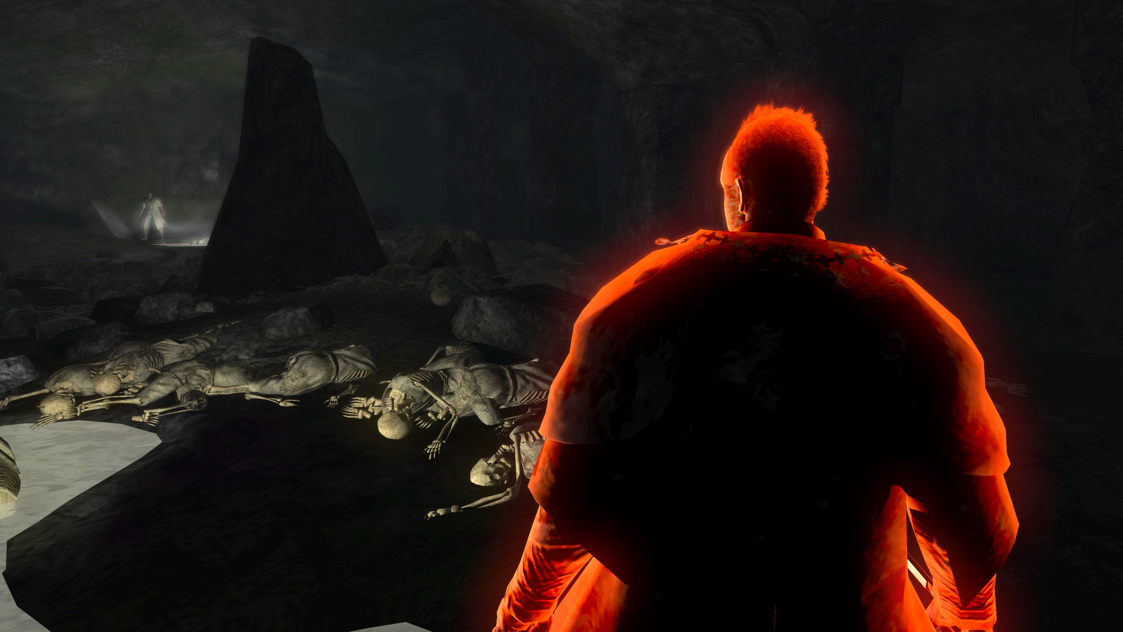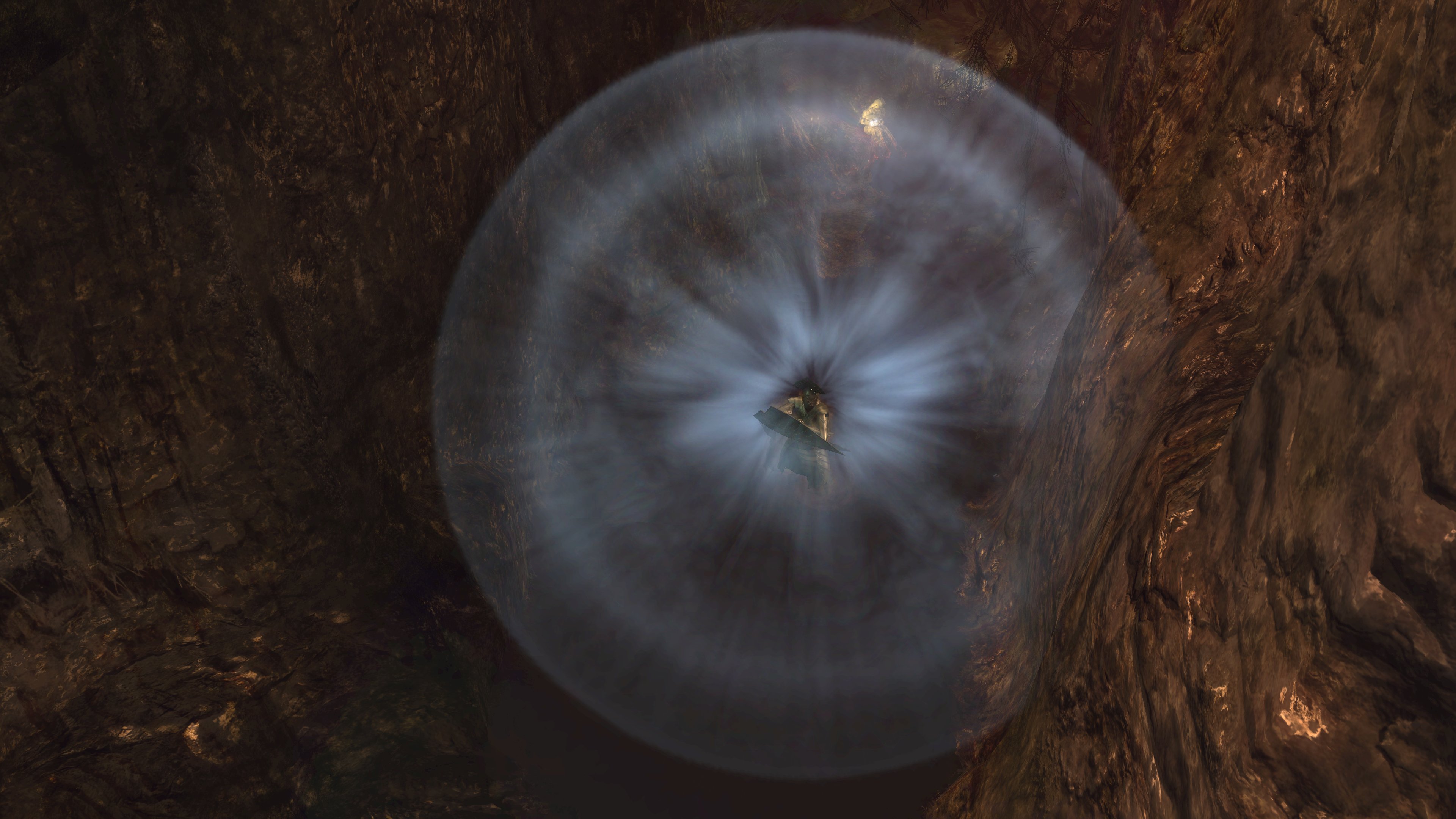 The priesthood invites such disingenuous clerics to have a platform, and Urbain is very much the rule and not the exception. Blocking exit from the pit is a black phantom dressed in the venerable sage’s set. Despite the localization claiming the outfit to be the dirty clothes of a sage, it is actually the garment of a holy man, hence why it looks almost identical to Urbain’s robes. Evidently, Urbain wasn’t the first high-ranking priest to be kicked down by Patches. This prior victim was apparently unable to either find the exit in the darkness, even though Urbain identified it by the echo, or physically leave. Whatever the reason, the fact he is a black phantom in “corrupted” robes dual wielding blades native to the area speaks to his ultimate fate, one which may well visit Urbain if he is never saved. The temple has failed to train its most devoted priests to resist temptation or remain resolute in the face of real adversity — their faith all too easily folds when it is no longer convenient. The priesthood’s idea of purity is far too superficial in every capacity.