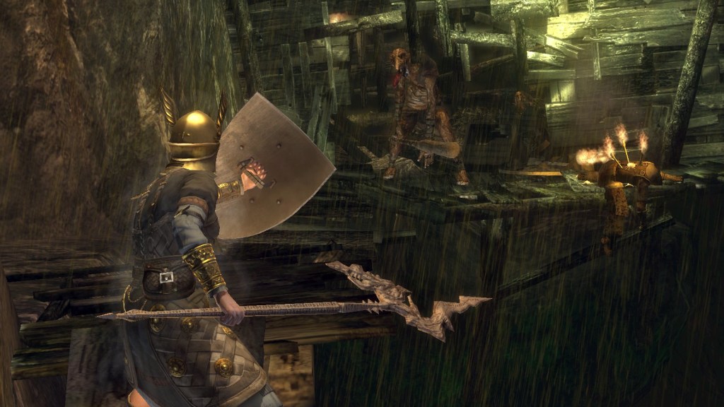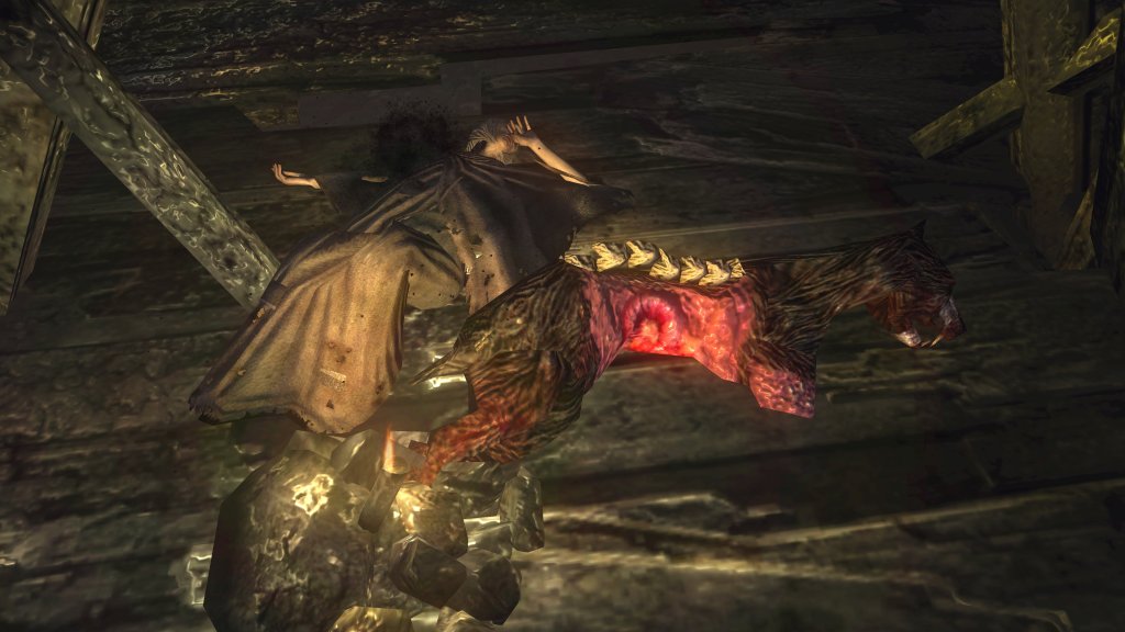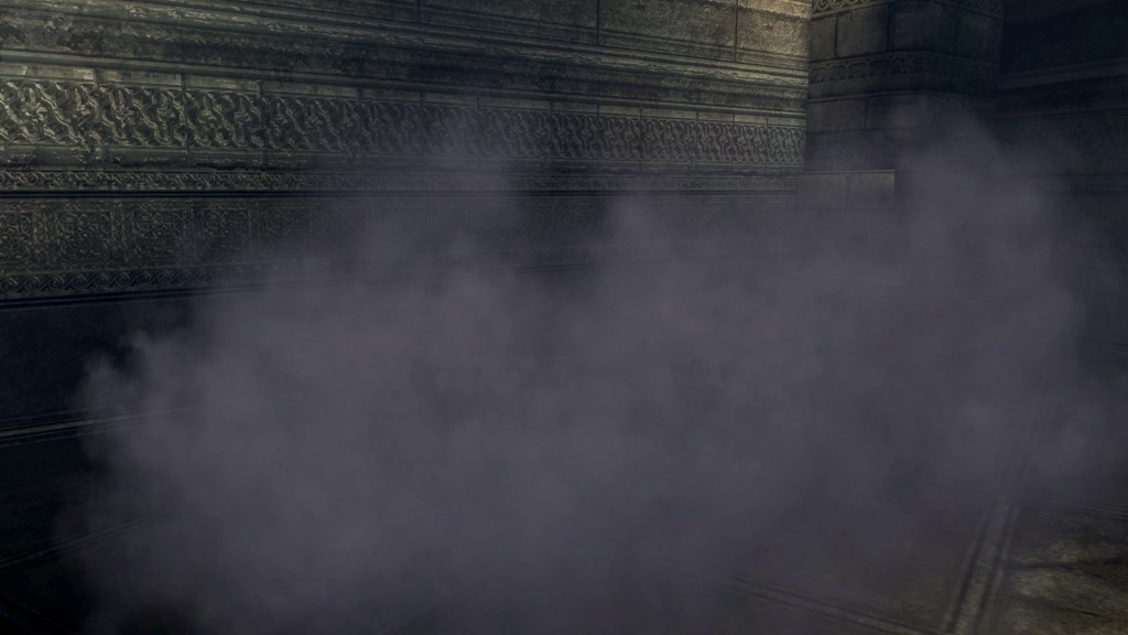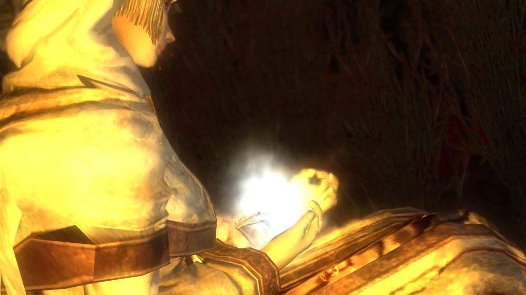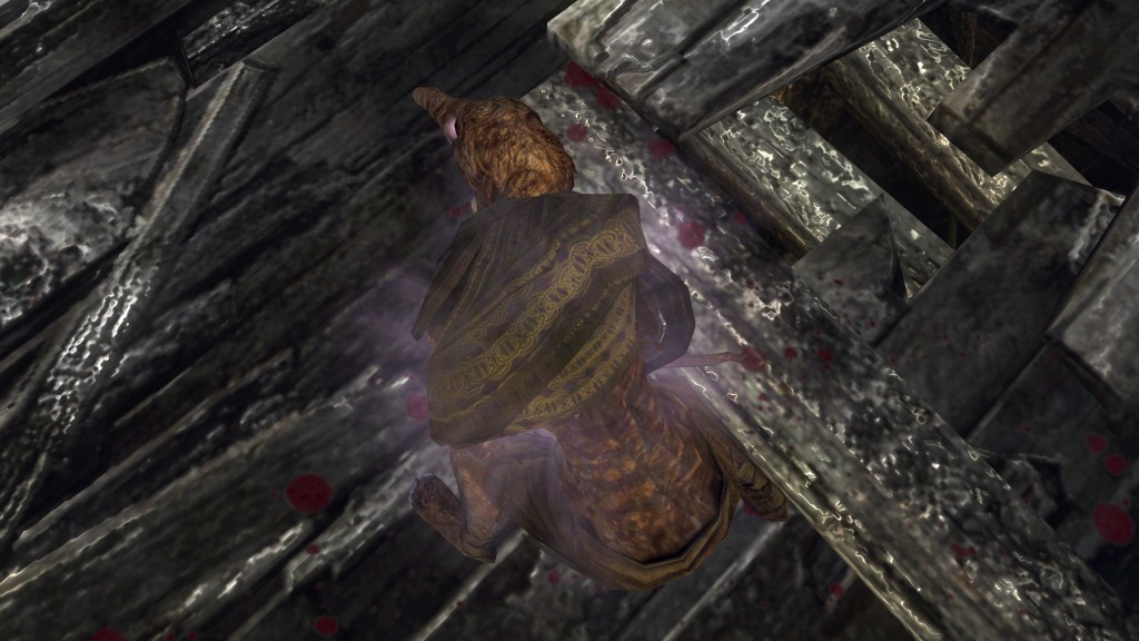 And so, the pair set off for Boletaria. According to the filthy woman’s Japanese dialogue, Astraea and Garl first came to the valley several years ago, implying that they had already been performing their relief efforts for a few years by that point. And for a holy woman raised pure in every sense of the word, seeing how people on the opposite end of the spectrum lived must have come as quite a shock. The contrast is highlighted by the filthy woman, who chides us for treating her like a “maiden” in her Japanese dialogue should we try to kill her. This is a woman who bore child and is well-versed in the ways of the world thanks to her hard life, so she is insulted to be thought of as an innocent, helpless girl who doesn’t know that we mean her harm. That lived experience is a stark contrast to the life of privilege afforded to Astraea, who had probably been ignorant of such strife — luck also governs one’s resistance to diseases, after all.