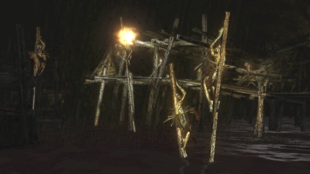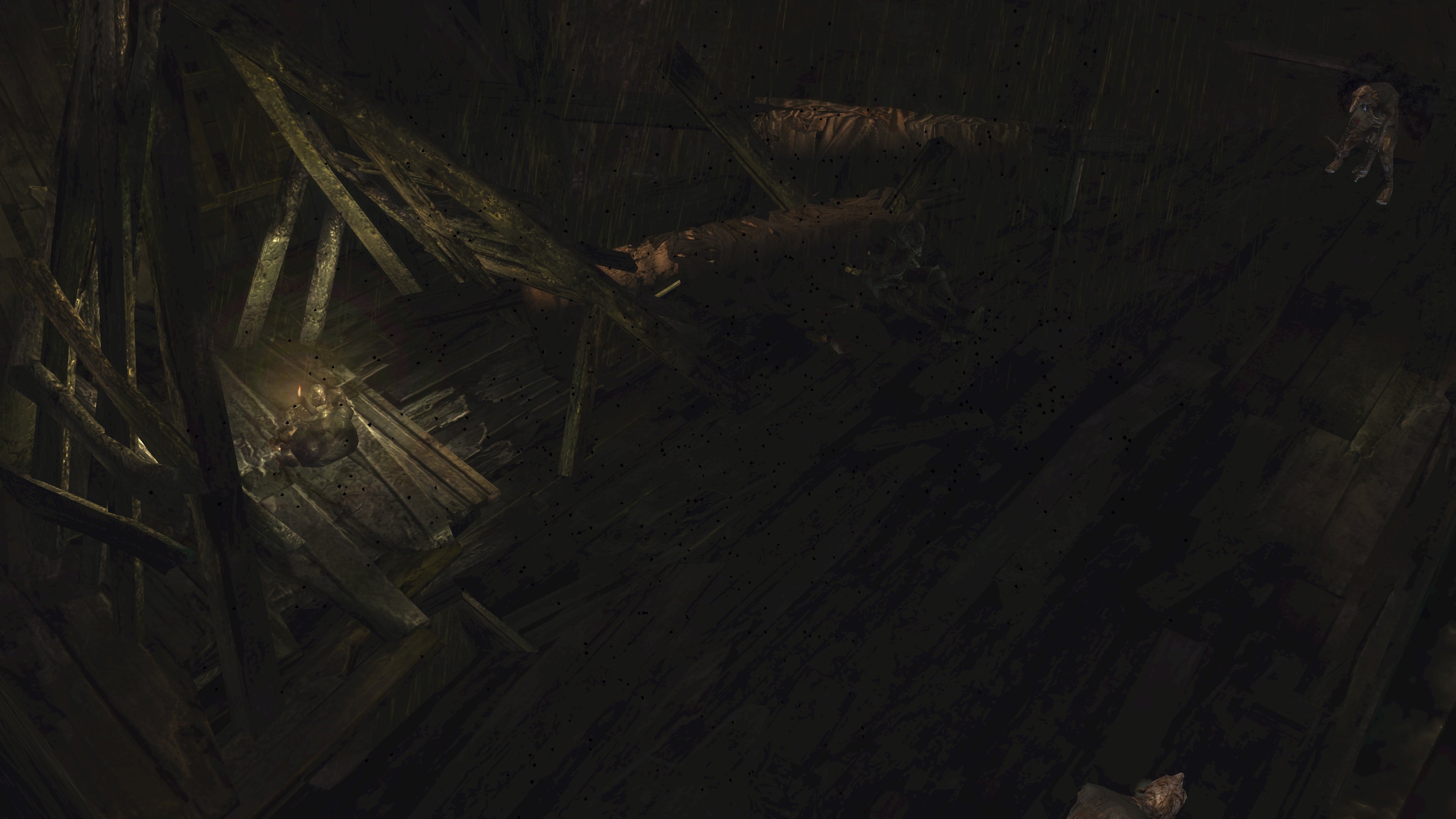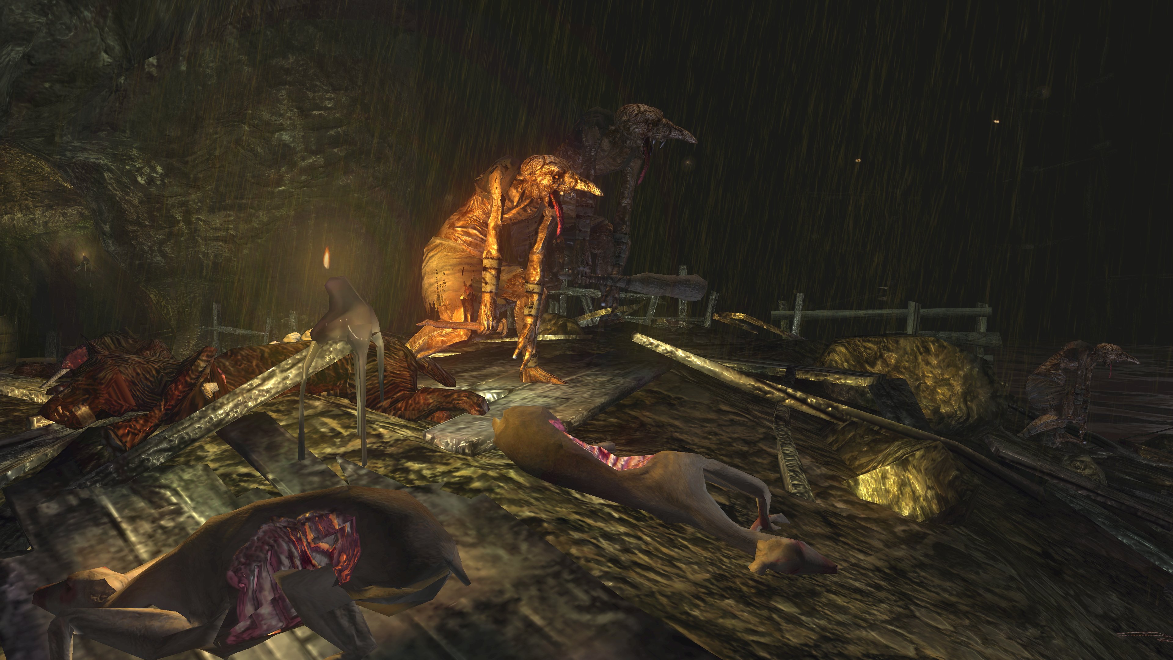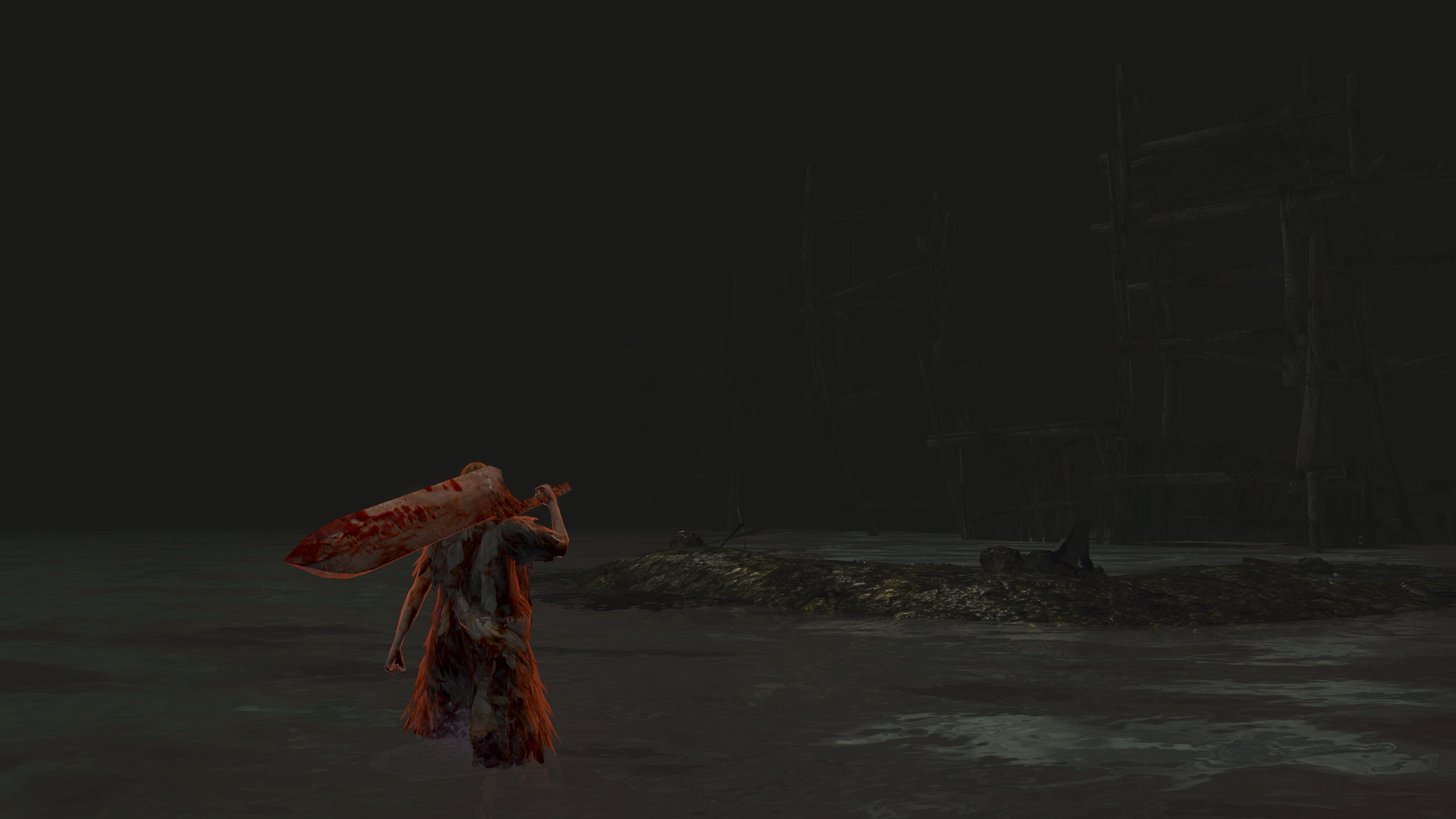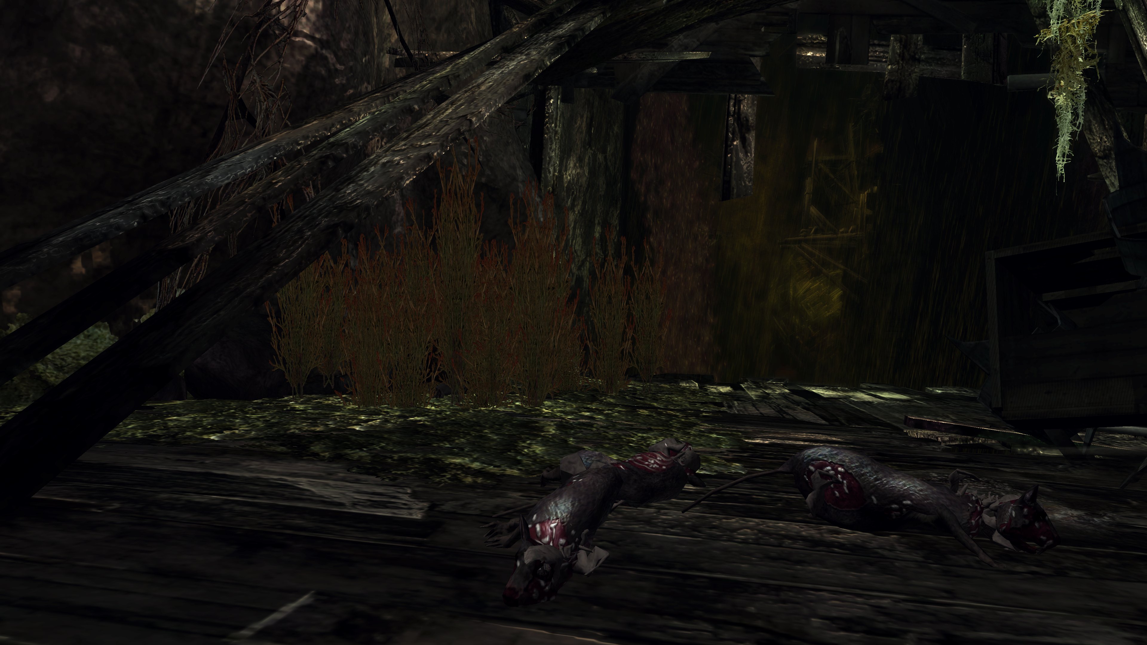 While the filthy woman is trying to make an honest living, some are desperate enough to resort to more dubious means to get by. Piles of bodies around the village, some of which are already partially skinned, indicate the some have gone so far as to eat rats and dogs to get by despite the obvious health risks. Among some piles are even residents’ corpses, so the villagers seem to be fighting amongst themselves for a share, or worse. A female black phantom lurking in the swamp wears old raggedy robes indicative of another villager but wields the giant meat cleaver primarily used by the man-eating Adjudicator. Evidently, some have descended to cannibalism and hunt their fellow villagers scavenging the wetland — meat is meat, and it is survival of the fittest down there.