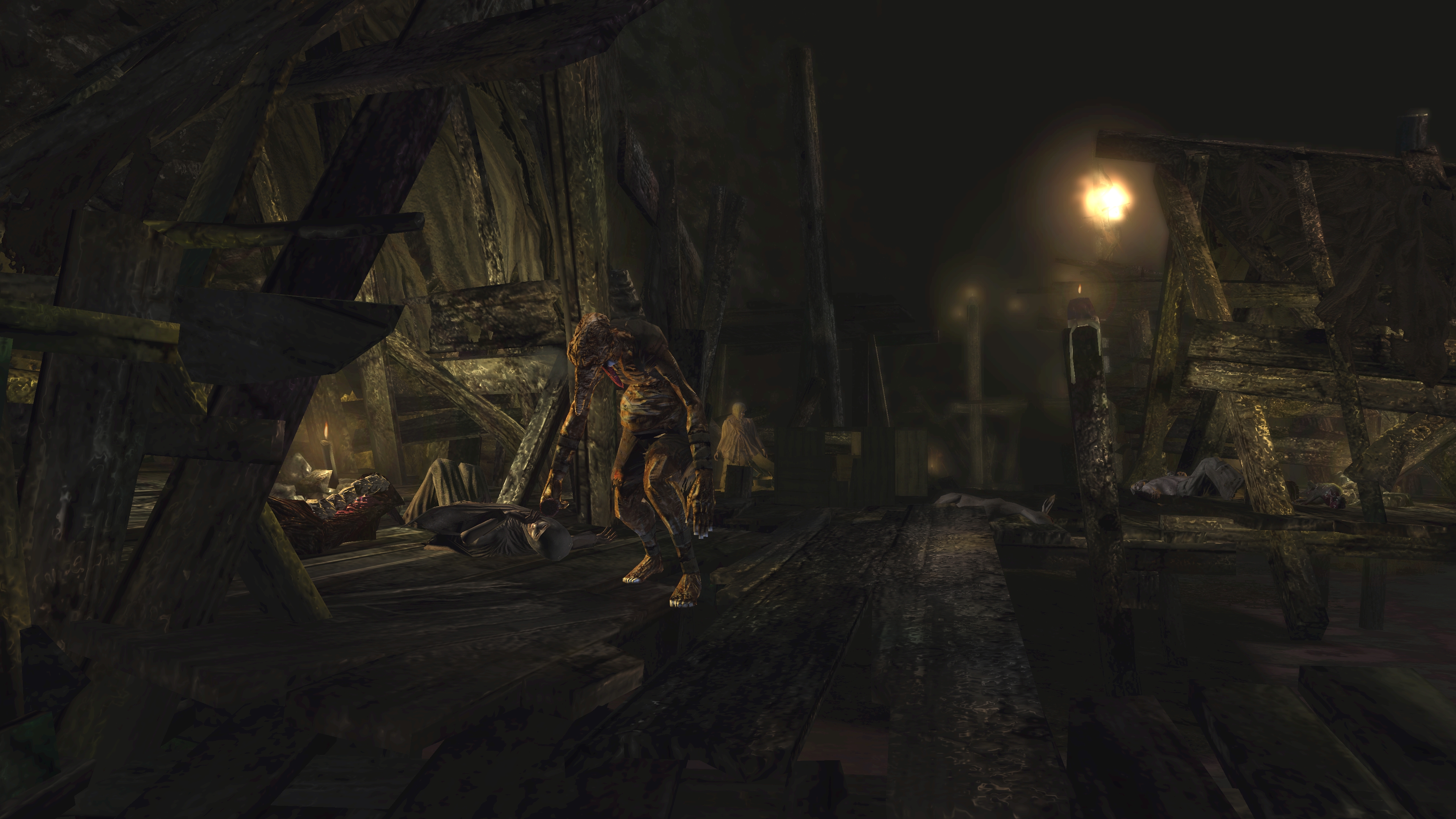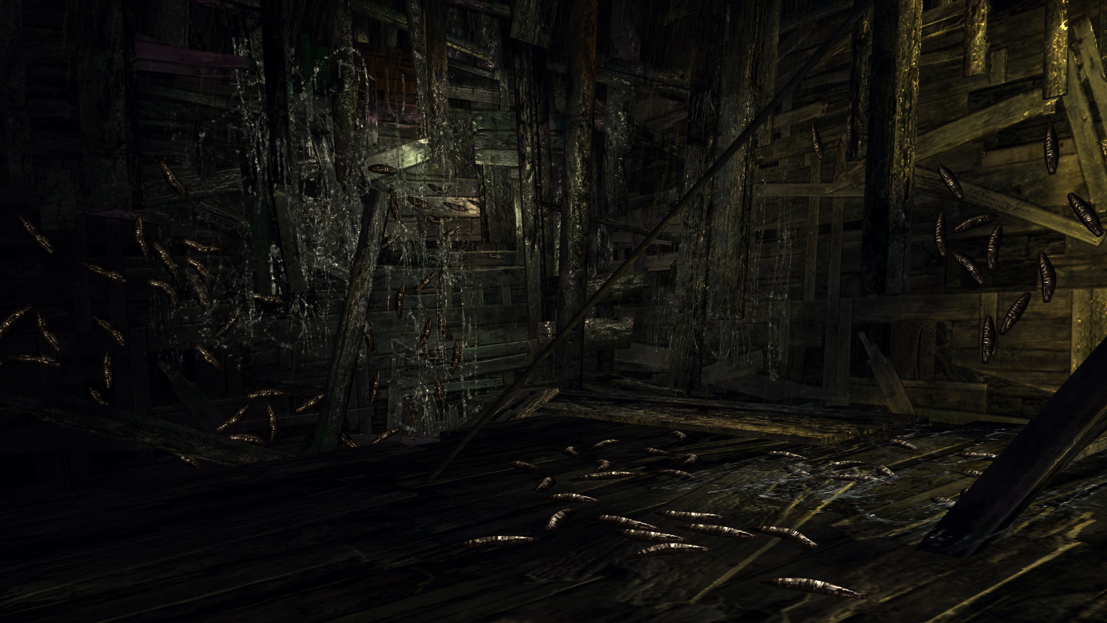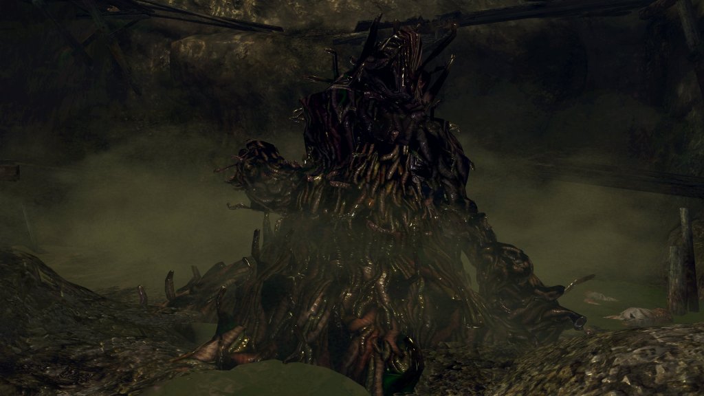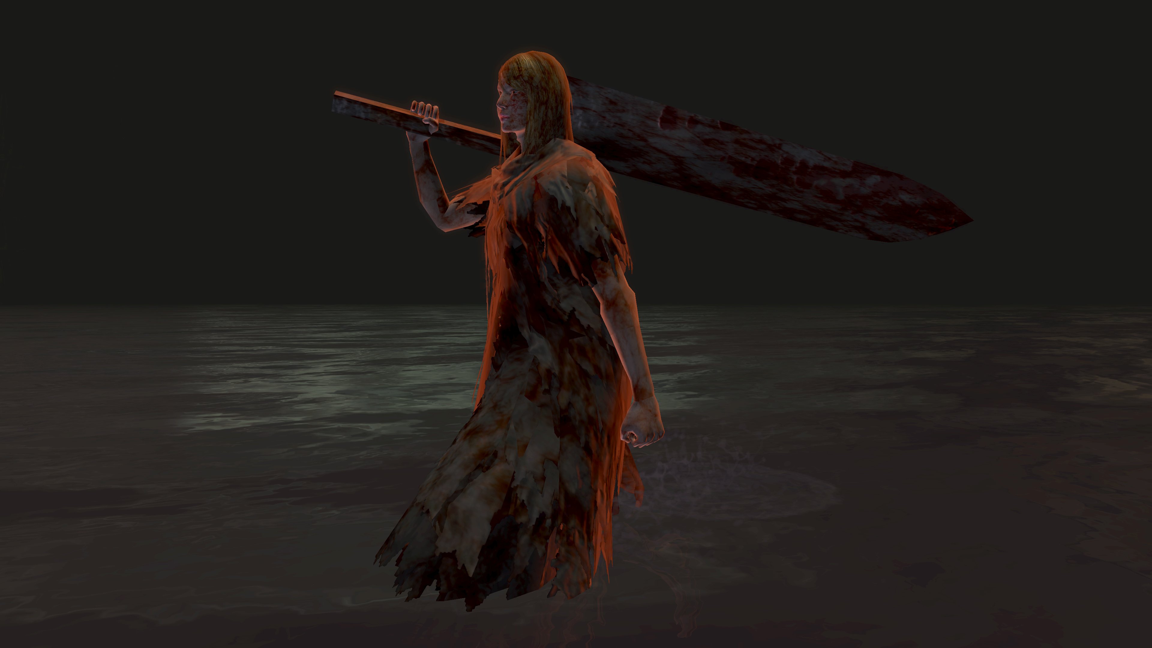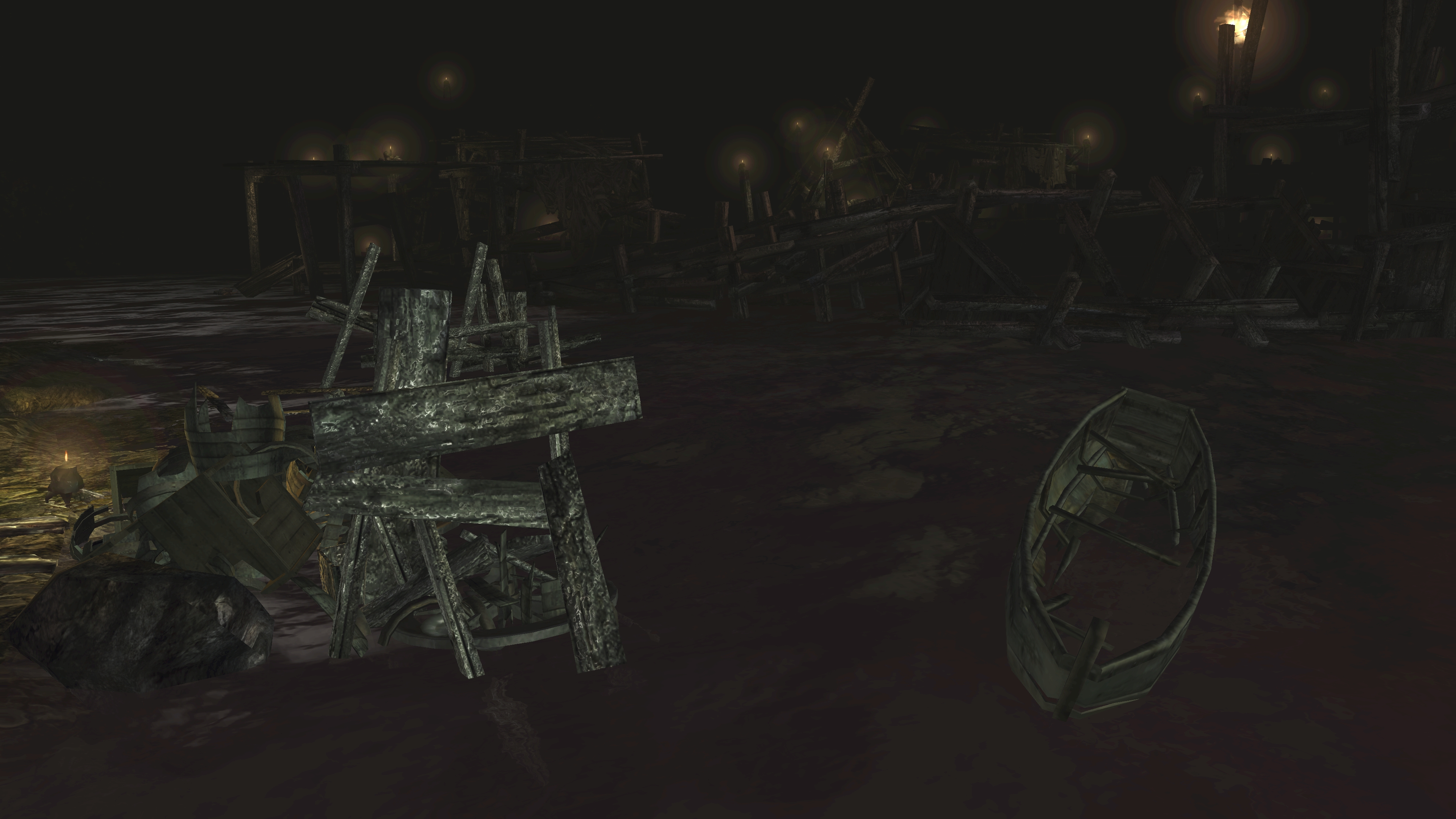 While the filthy woman is trying to make an honest living, some are desperate enough to resort to more dubious means to get by. Piles of bodies around the village, some of which are already partially skinned, indicate the some have gone so far as to eat rats and dogs to get by despite the obvious health risks. Among some piles are even residents’ corpses, so the villagers seem to be fighting amongst themselves for a share, or worse. A female black phantom lurking in the swamp wears old raggedy robes indicative of another villager but wields the giant meat cleaver primarily used by the man-eating Adjudicator. Evidently, some have descended to cannibalism and hunt their fellow villagers scavenging the wetland — meat is meat, and it is survival of the fittest down there.