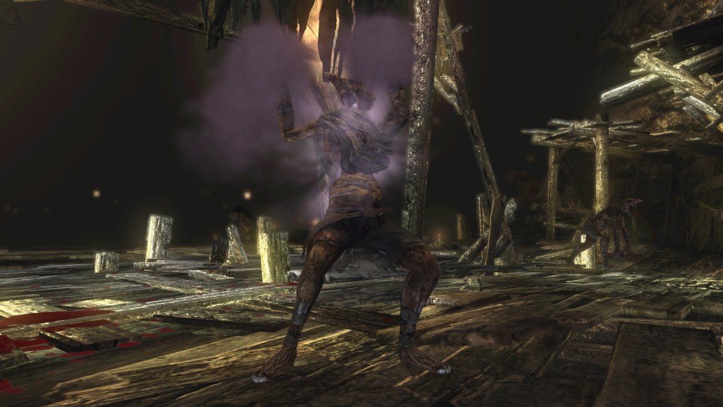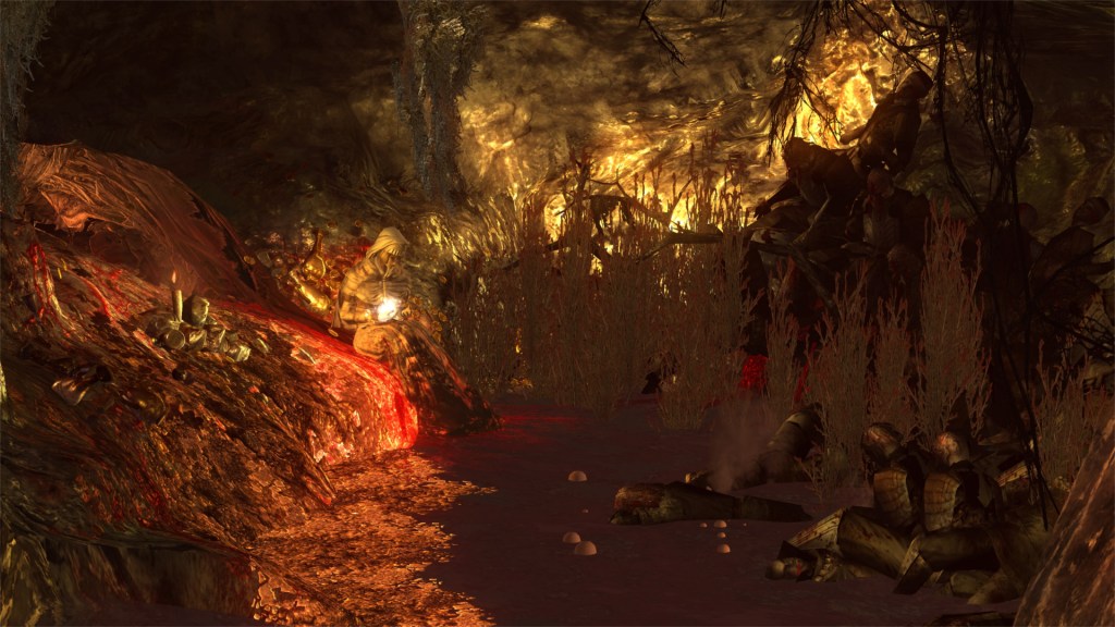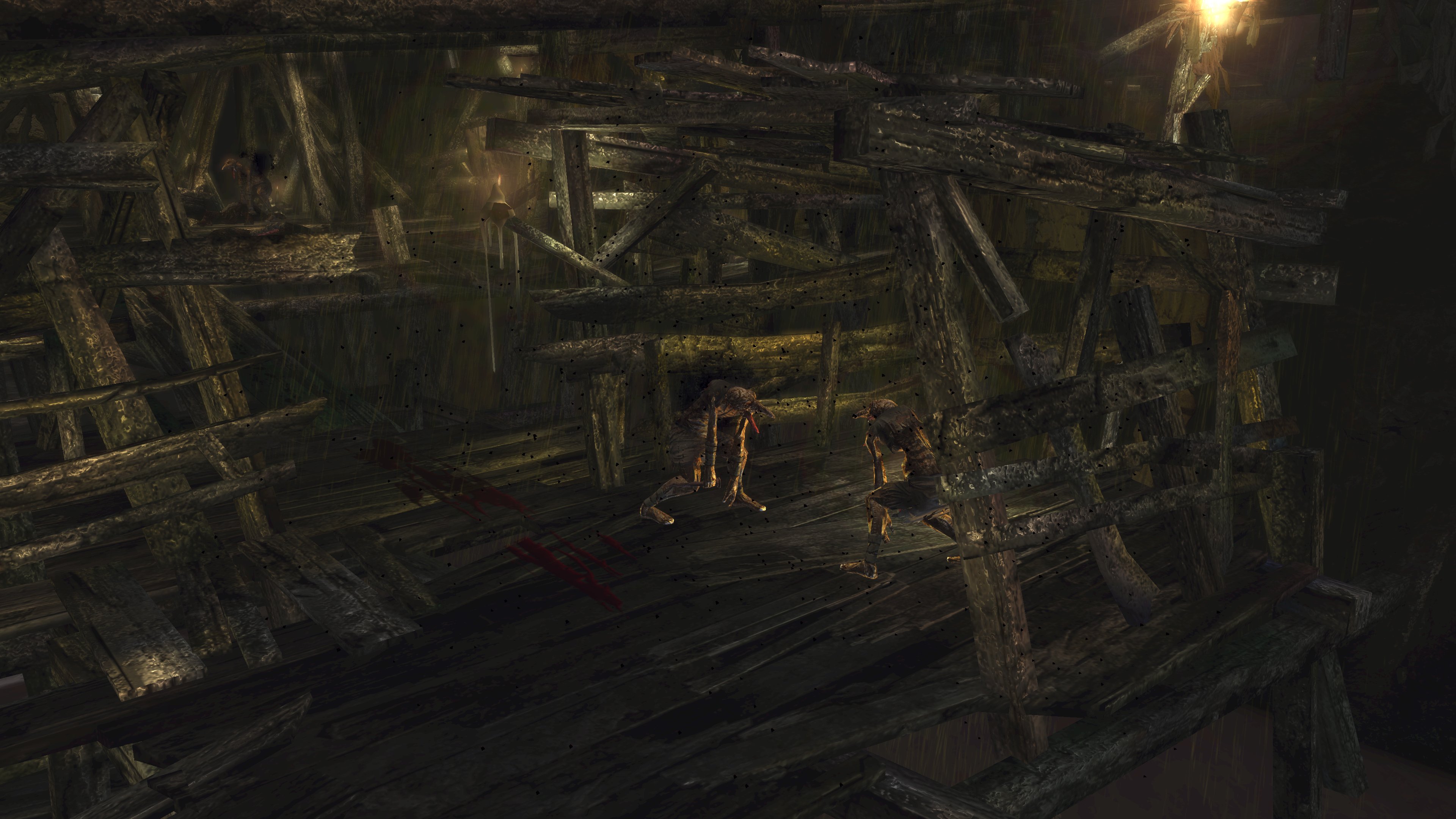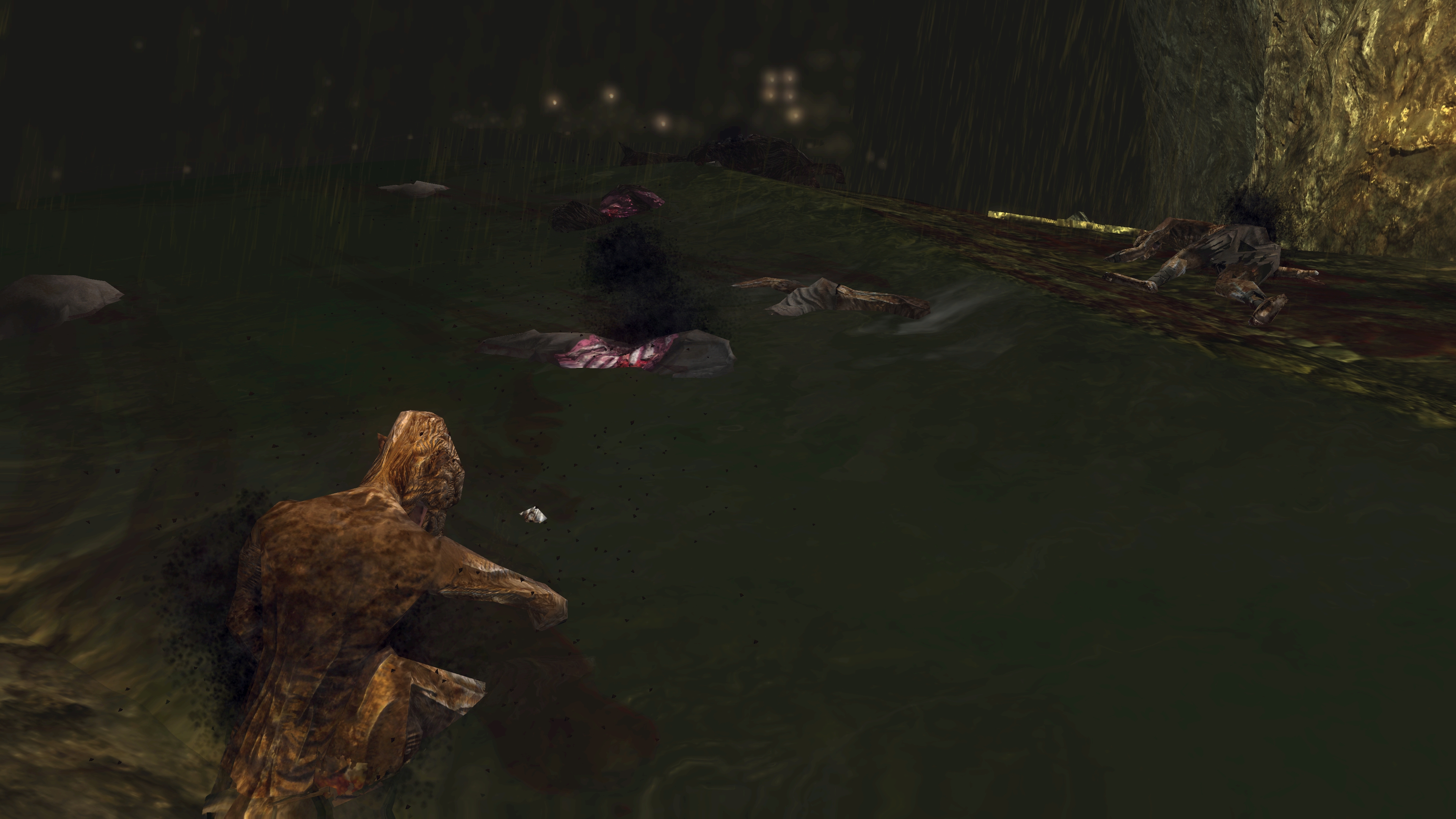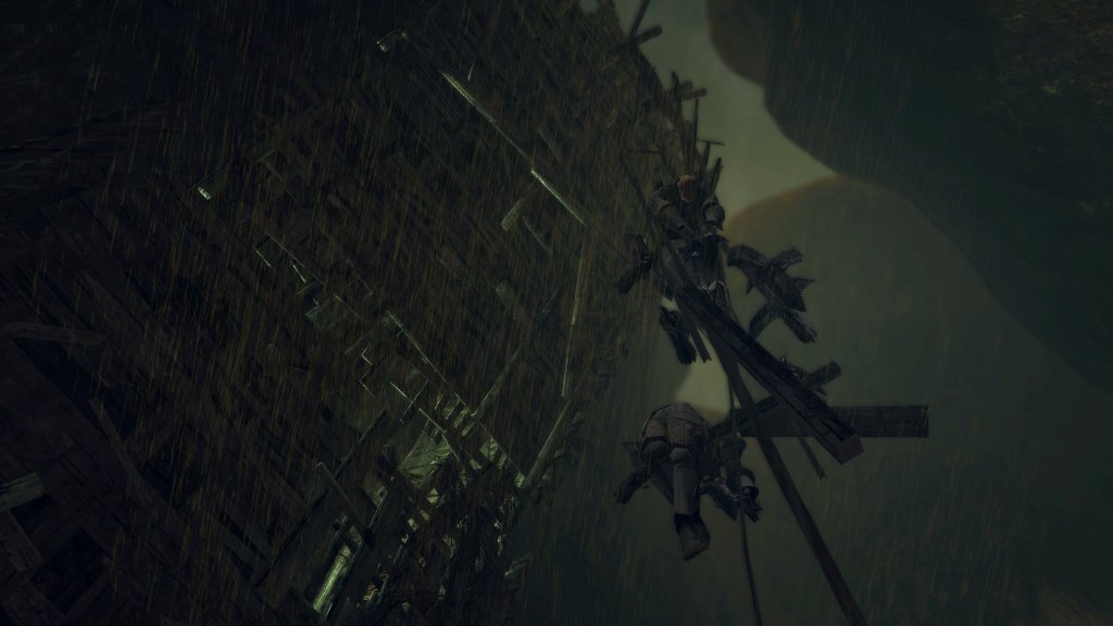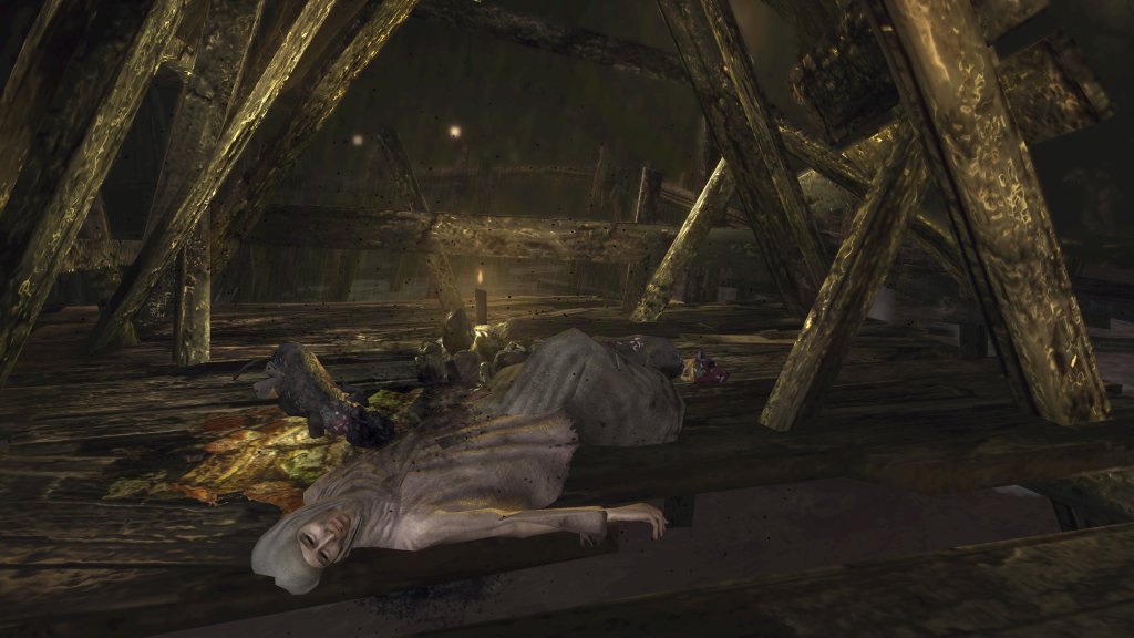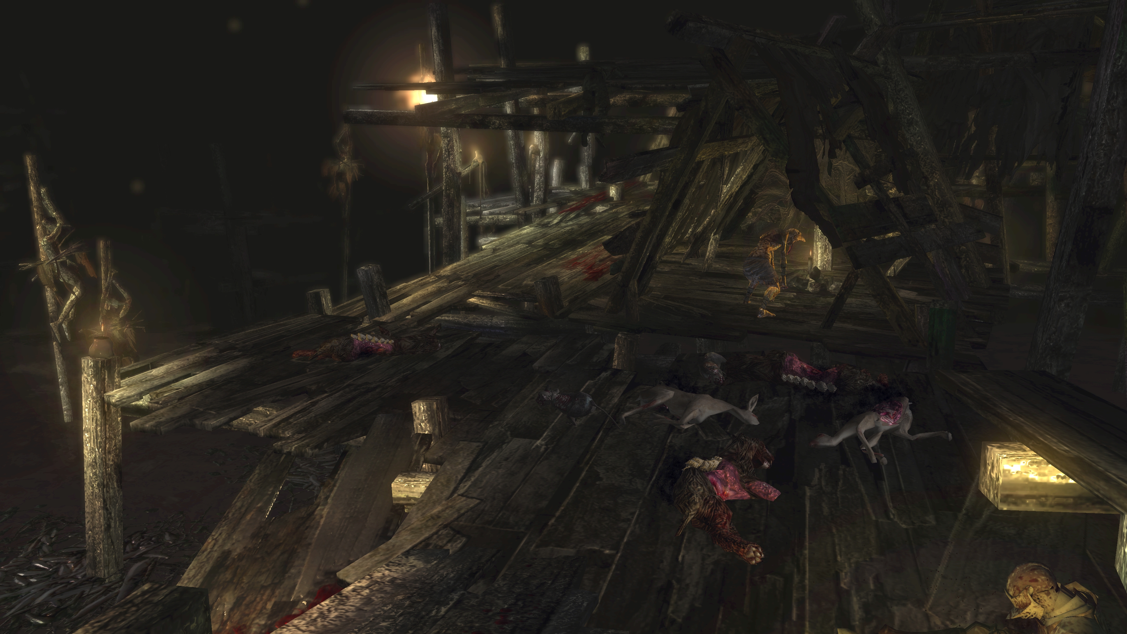 While the filthy woman is trying to make an honest living, some are desperate enough to resort to more dubious means to get by. Piles of bodies around the village, some of which are already partially skinned, indicate the some have gone so far as to eat rats and dogs to get by despite the obvious health risks. Among some piles are even residents’ corpses, so the villagers seem to be fighting amongst themselves for a share, or worse. A female black phantom lurking in the swamp wears old raggedy robes indicative of another villager but wields the giant meat cleaver primarily used by the man-eating Adjudicator. Evidently, some have descended to cannibalism and hunt their fellow villagers scavenging the wetland — meat is meat, and it is survival of the fittest down there.