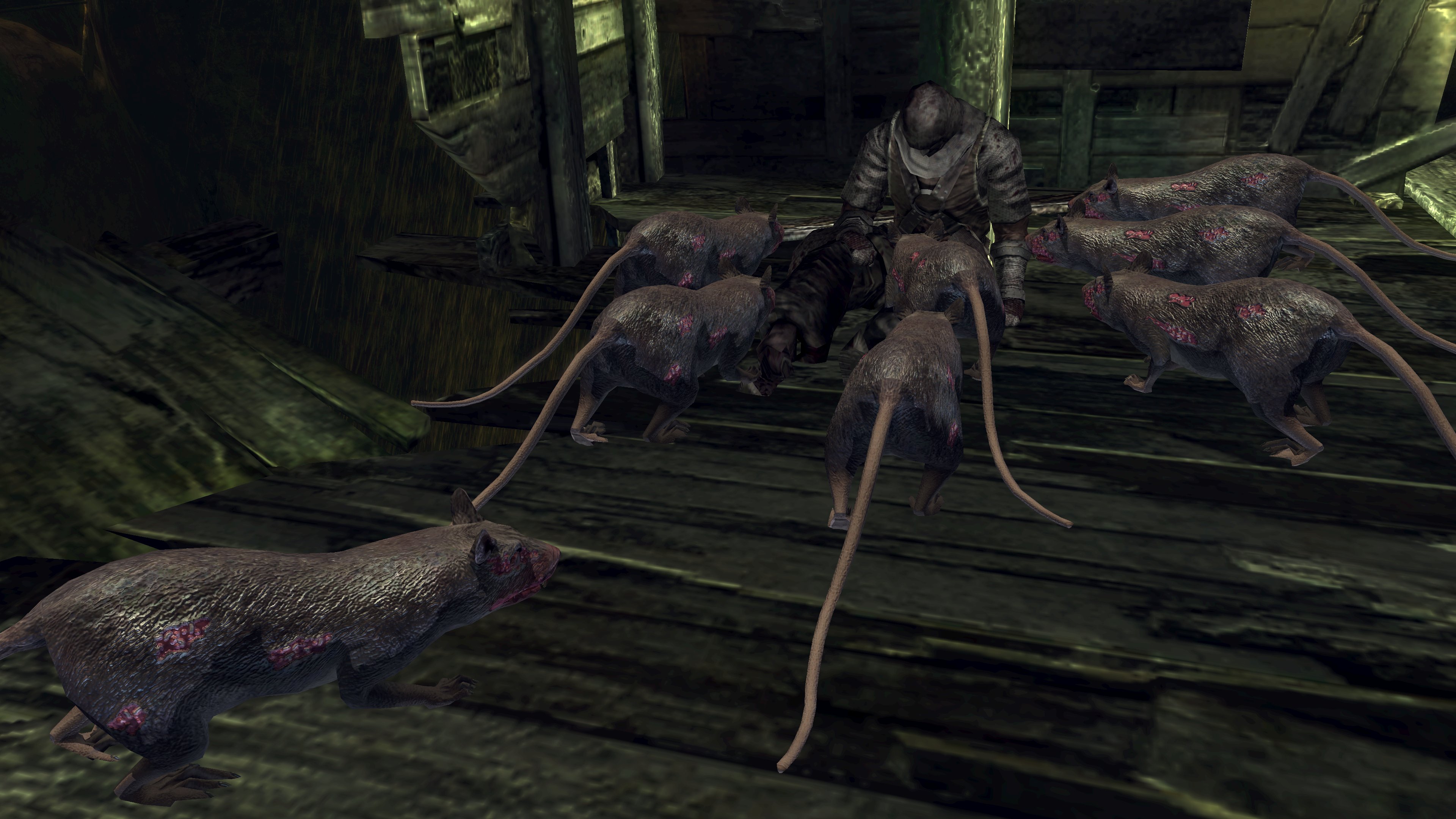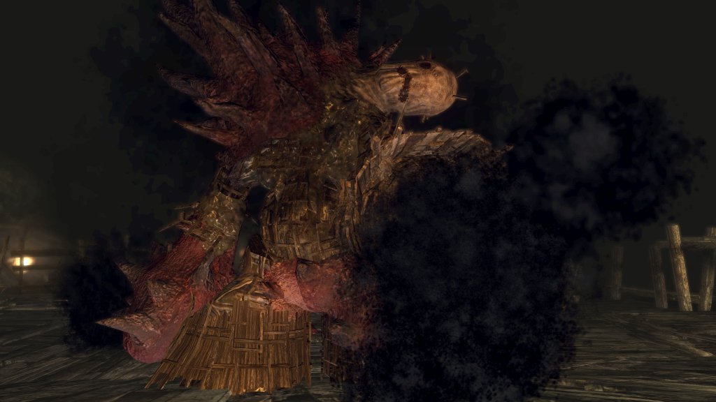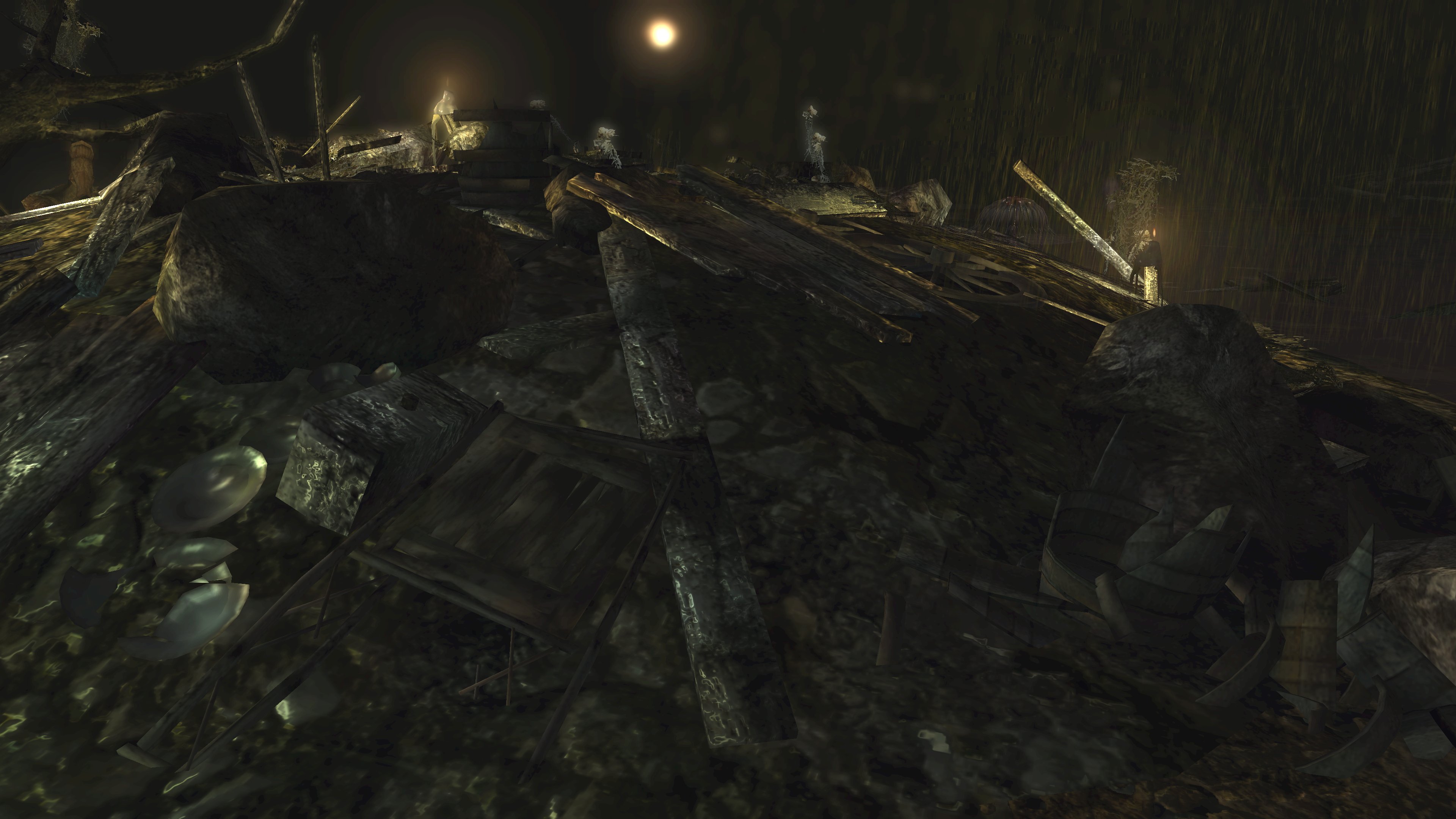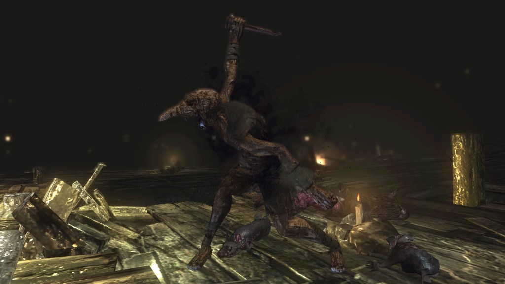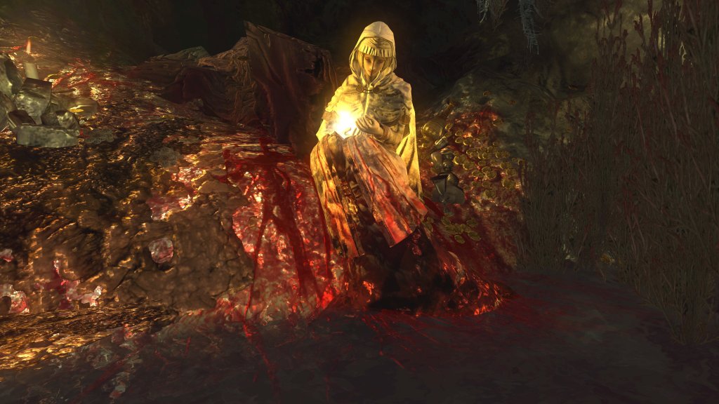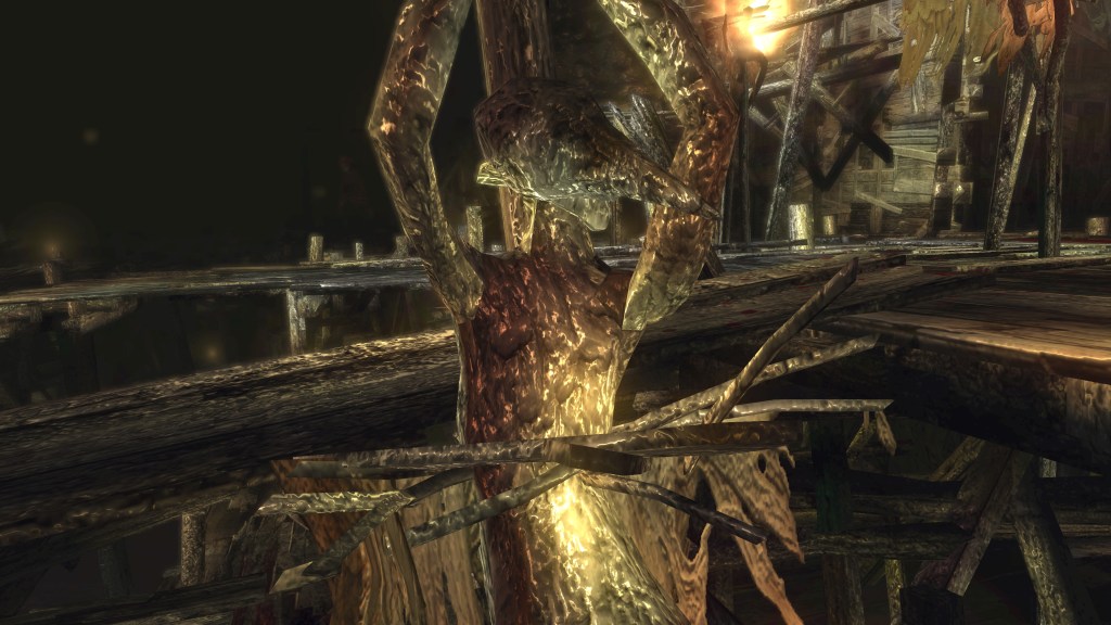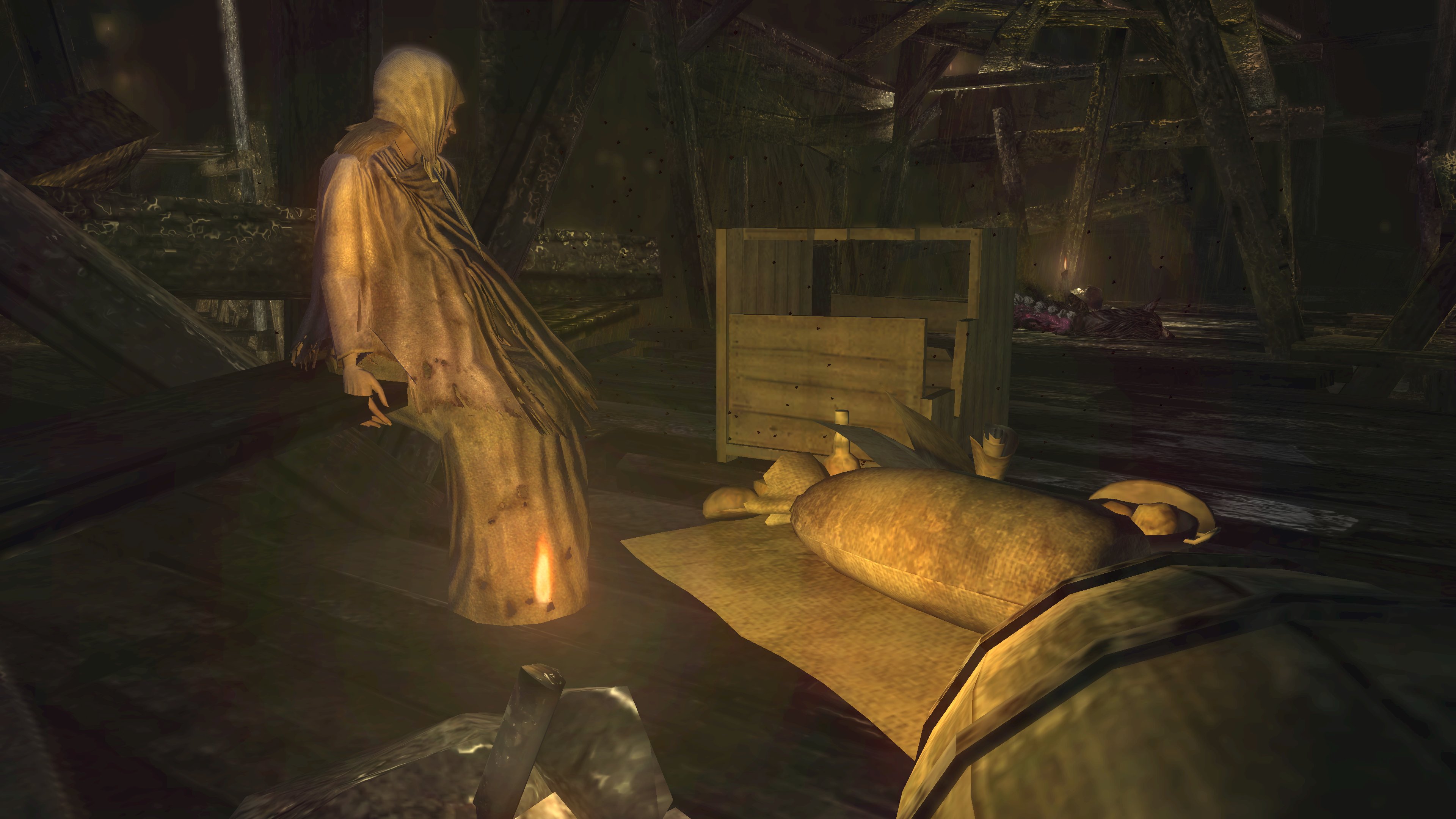 While the filthy woman is trying to make an honest living, some are desperate enough to resort to more dubious means to get by. Piles of bodies around the village, some of which are already partially skinned, indicate the some have gone so far as to eat rats and dogs to get by despite the obvious health risks. Among some piles are even residents’ corpses, so the villagers seem to be fighting amongst themselves for a share, or worse. A female black phantom lurking in the swamp wears old raggedy robes indicative of another villager but wields the giant meat cleaver primarily used by the man-eating Adjudicator. Evidently, some have descended to cannibalism and hunt their fellow villagers scavenging the wetland — meat is meat, and it is survival of the fittest down there.