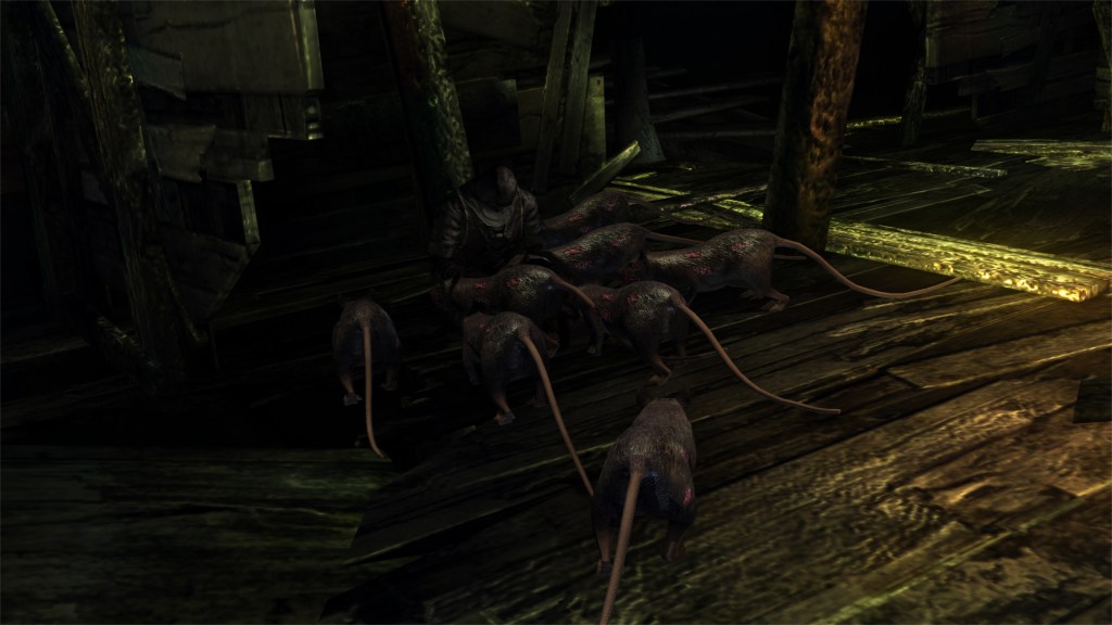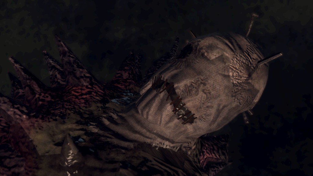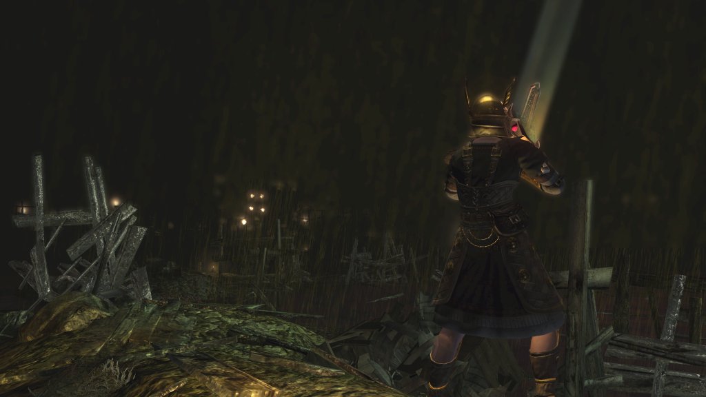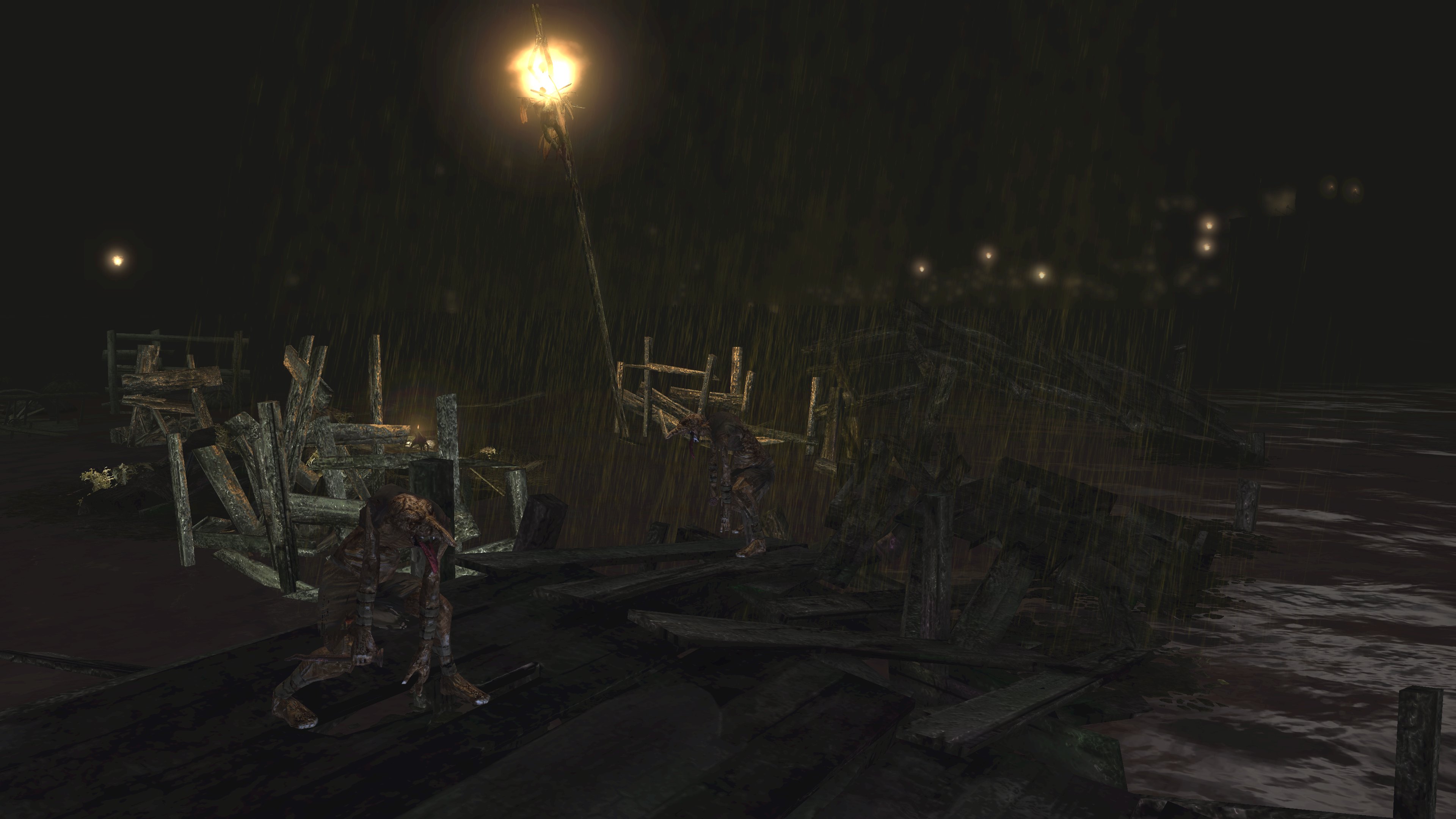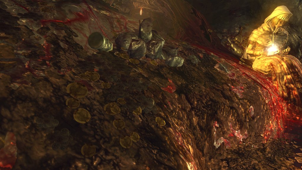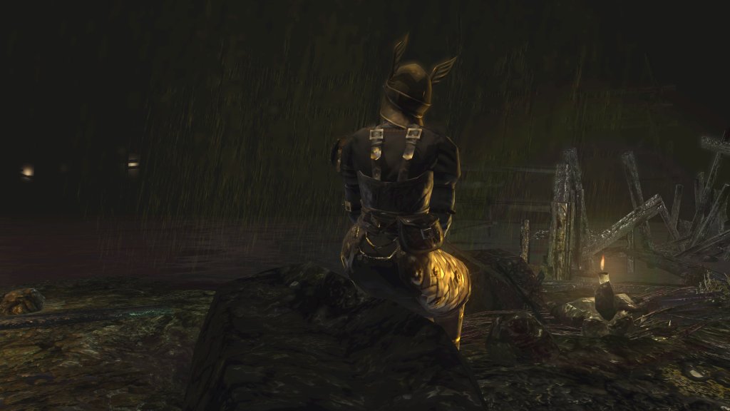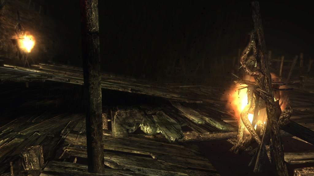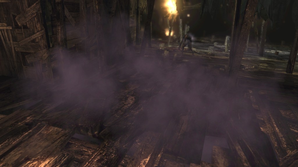 While the filthy woman is trying to make an honest living, some are desperate enough to resort to more dubious means to get by. Piles of bodies around the village, some of which are already partially skinned, indicate the some have gone so far as to eat rats and dogs to get by despite the obvious health risks. Among some piles are even residents’ corpses, so the villagers seem to be fighting amongst themselves for a share, or worse. A female black phantom lurking in the swamp wears old raggedy robes indicative of another villager but wields the giant meat cleaver primarily used by the man-eating Adjudicator. Evidently, some have descended to cannibalism and hunt their fellow villagers scavenging the wetland — meat is meat, and it is survival of the fittest down there.