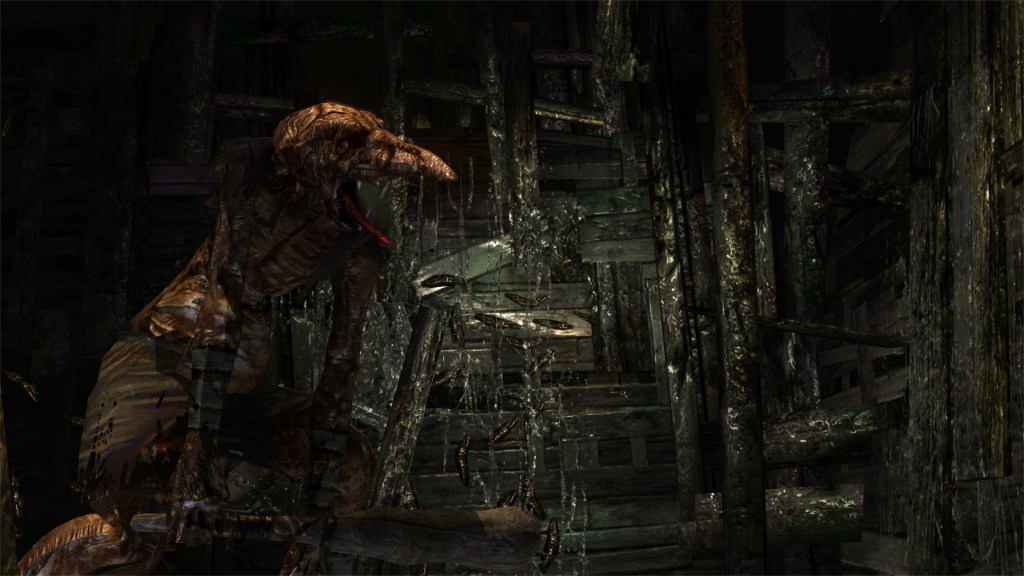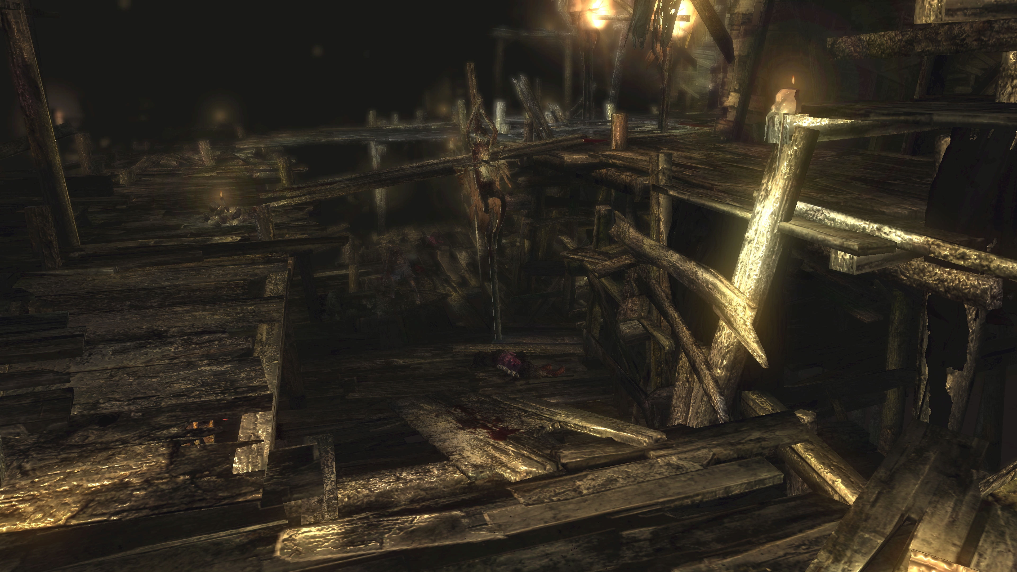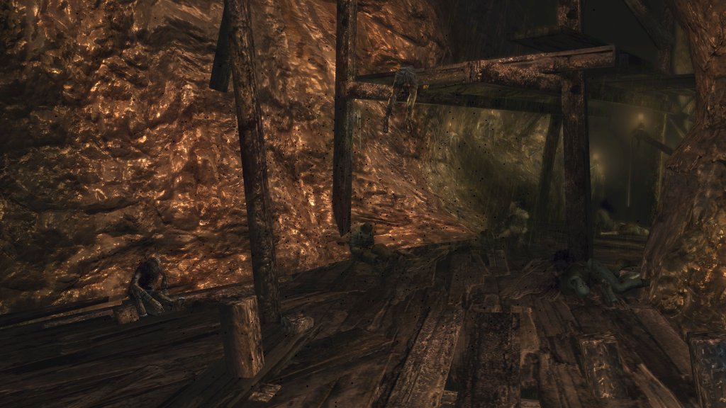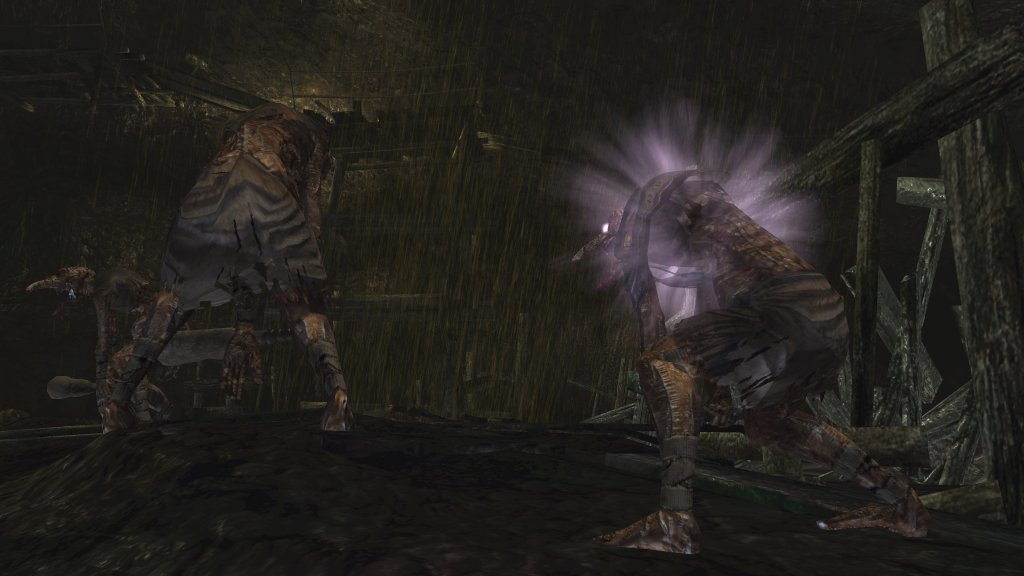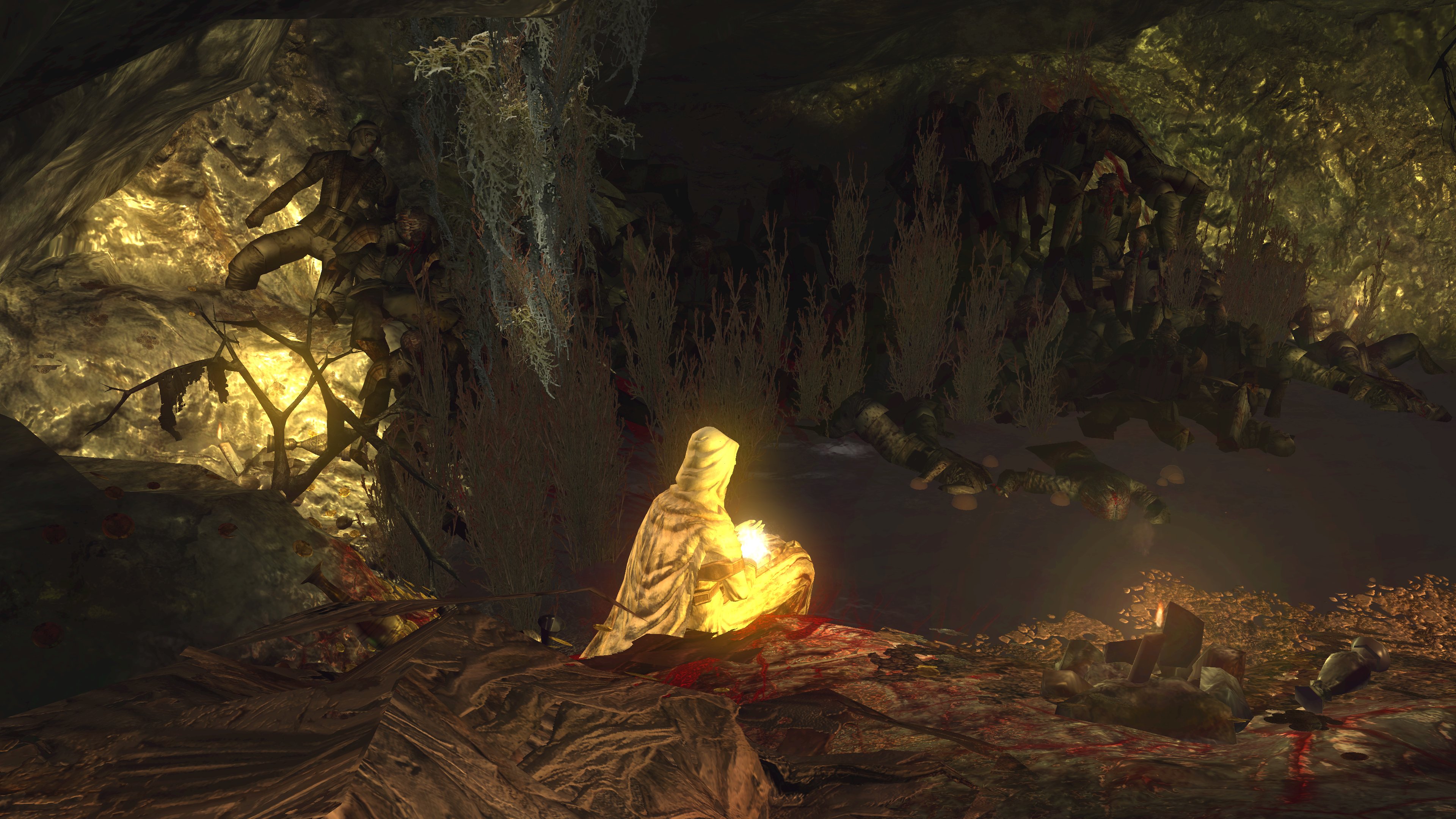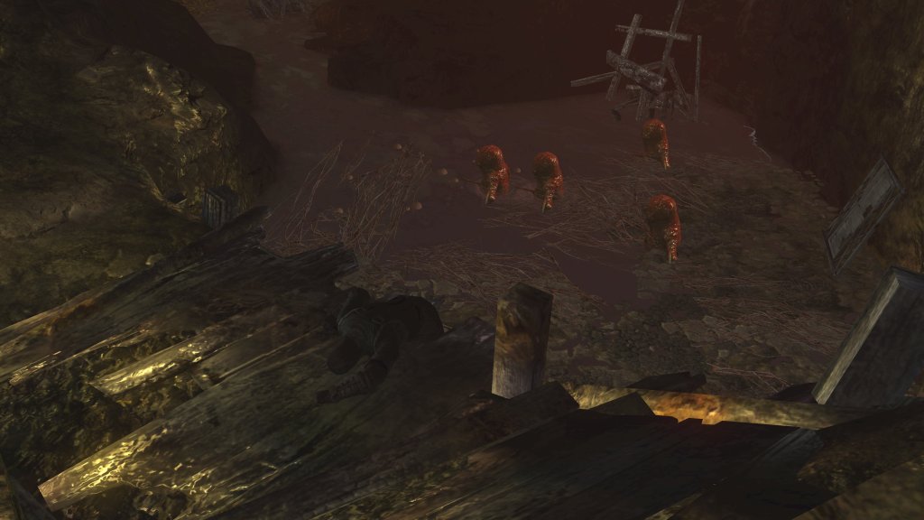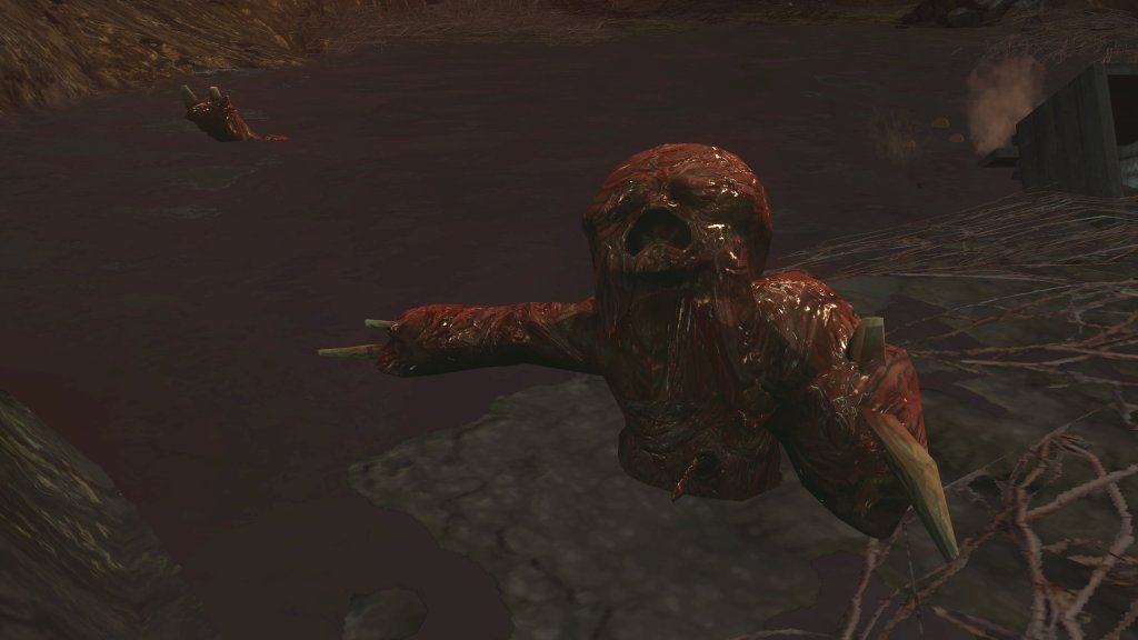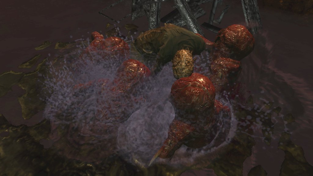While the filthy woman is trying to make an honest living, some are desperate enough to resort to more dubious means to get by. Piles of bodies around the village, some of which are already partially skinned, indicate the some have gone so far as to eat rats and dogs to get by despite the obvious health risks. Among some piles are even residents’ corpses, so the villagers seem to be fighting amongst themselves for a share, or worse. A female black phantom lurking in the swamp wears old raggedy robes indicative of another villager but wields the giant meat cleaver primarily used by the man-eating Adjudicator. Evidently, some have descended to cannibalism and hunt their fellow villagers scavenging the wetland — meat is meat, and it is survival of the fittest down there.