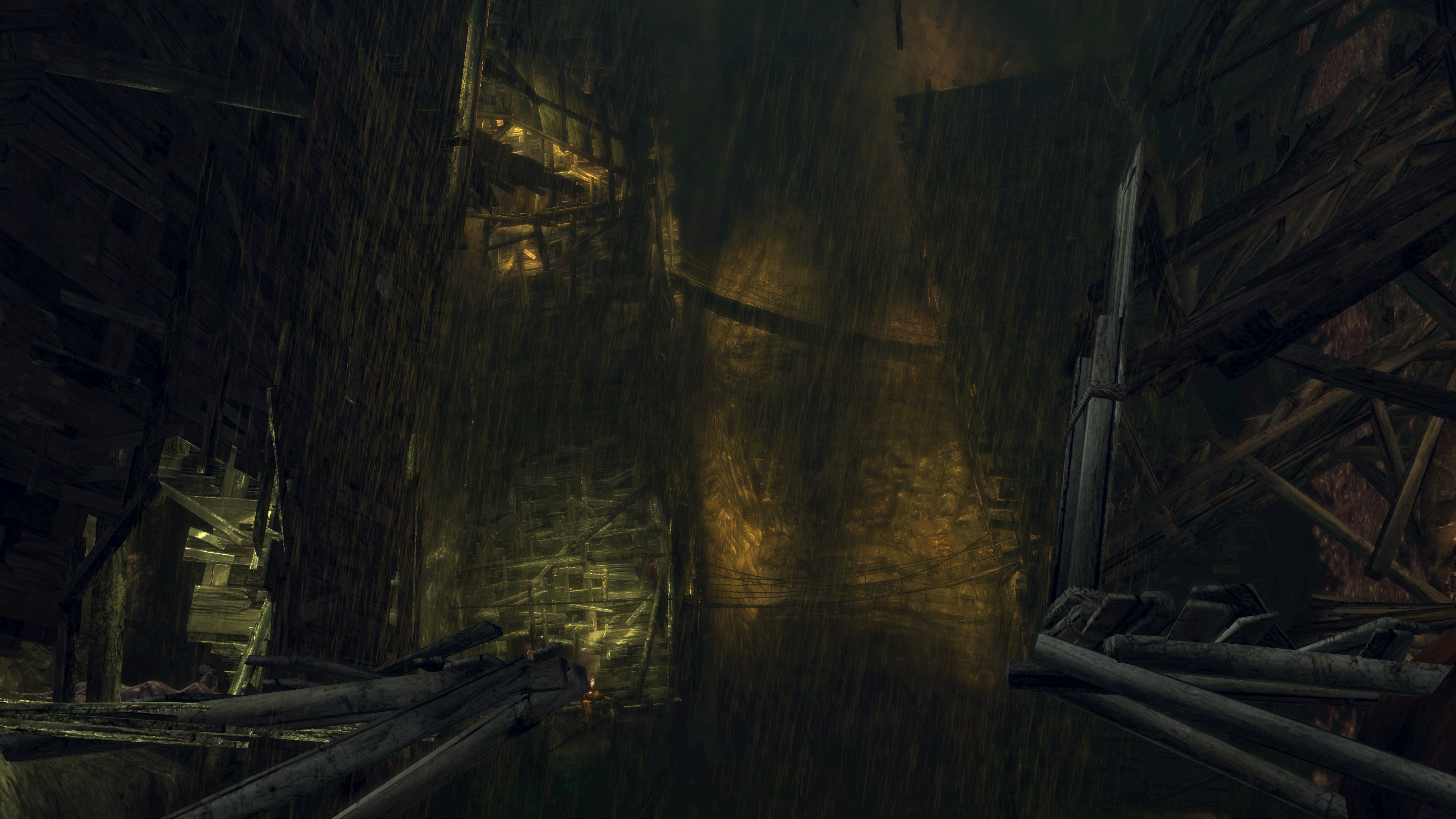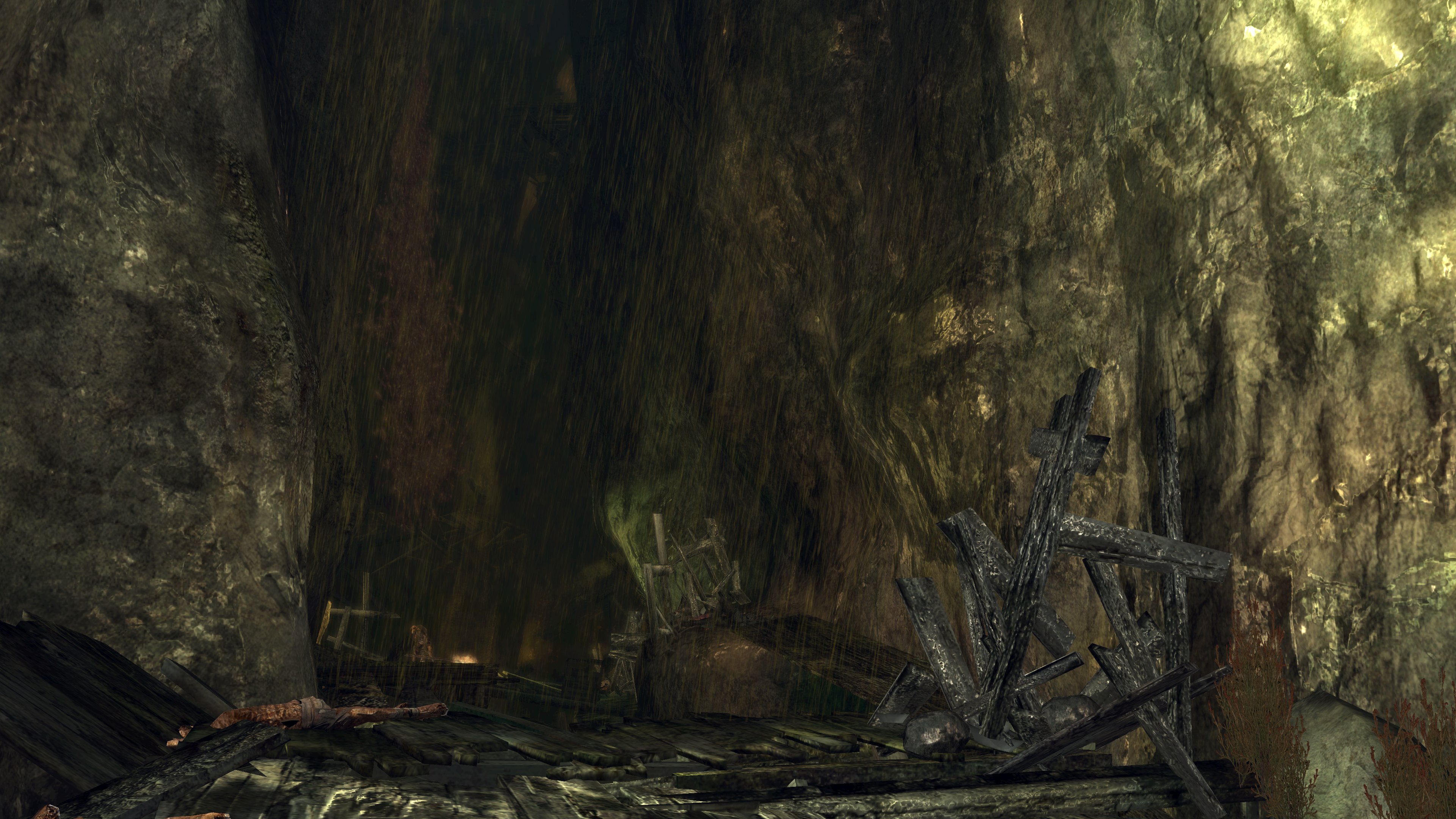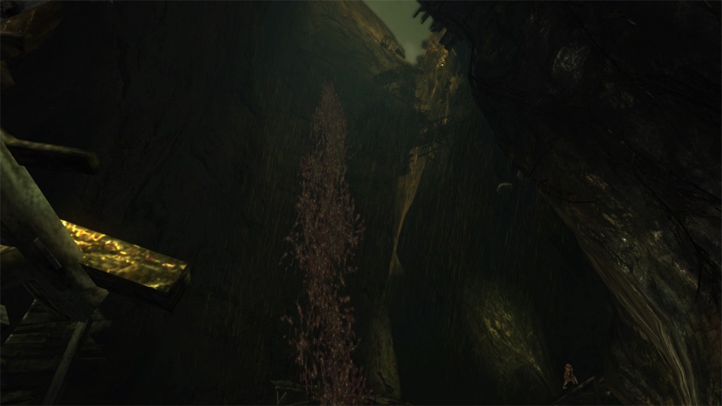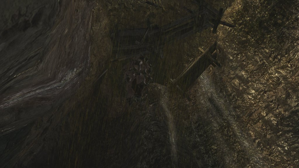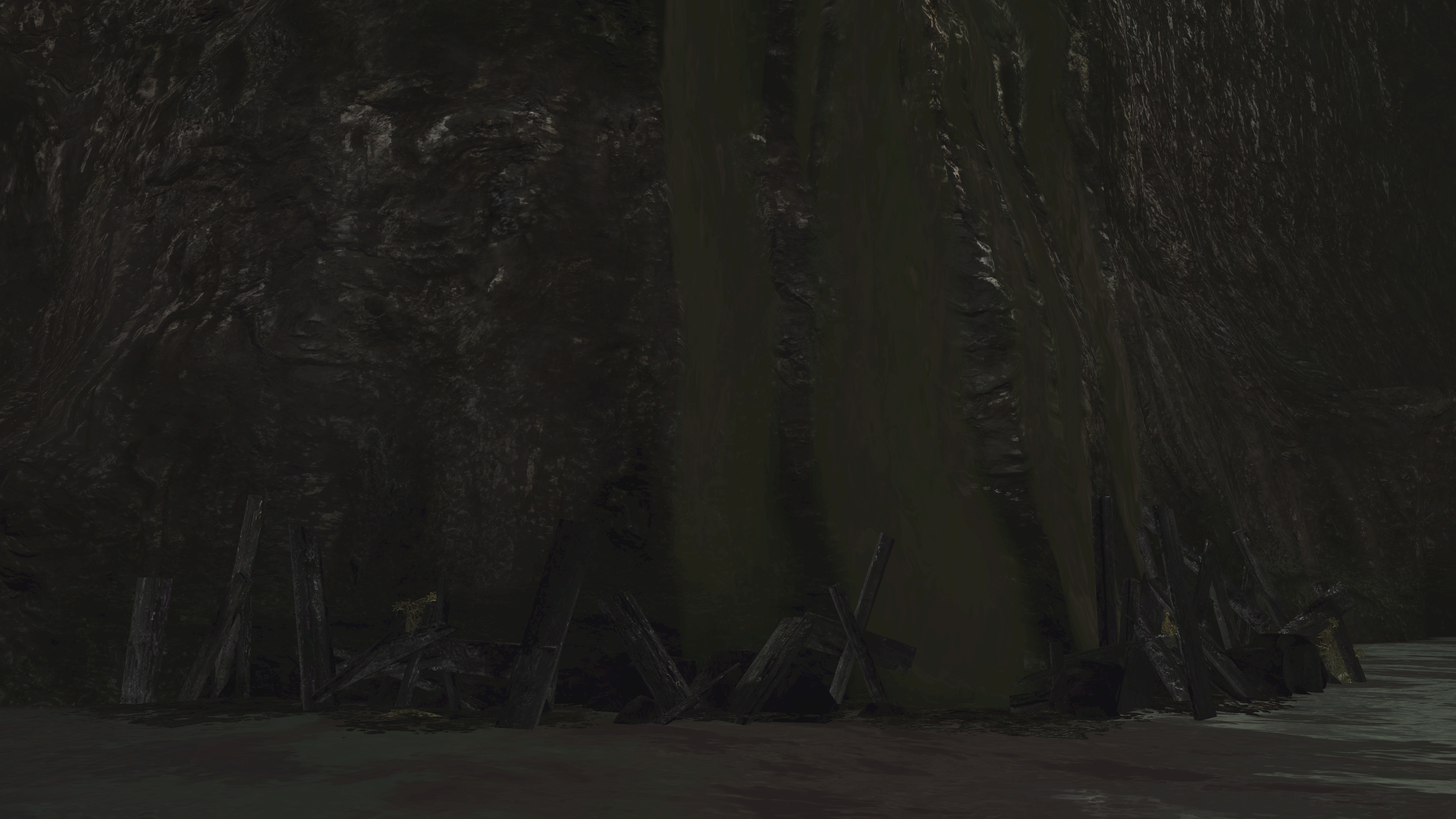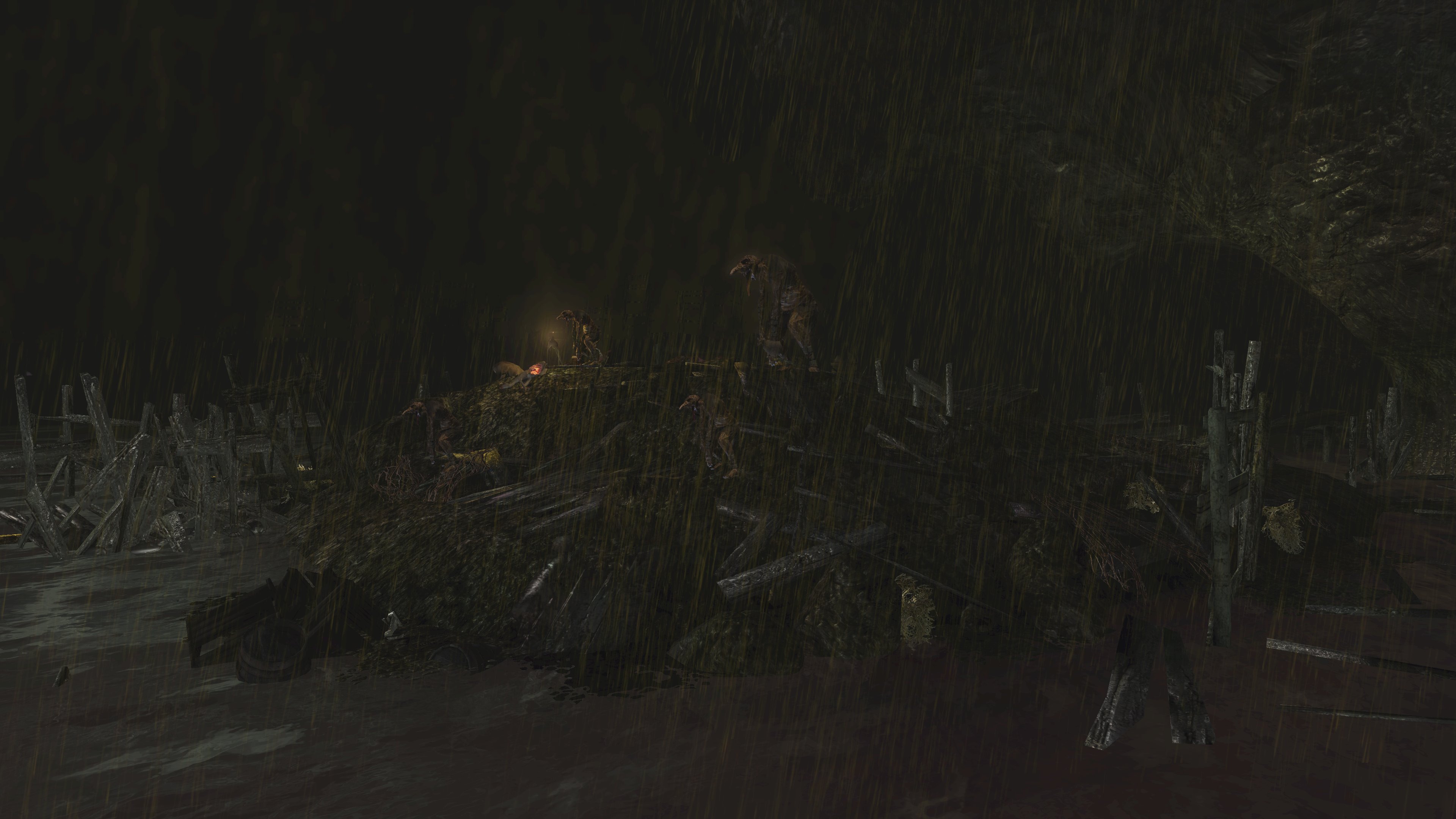 The Valley of Defilement has earned its name “rotten valley” (腐れ谷) as a consequence of all the decay it has accumulated over time. When we visit the area, it is pouring rain that causes entire waterfalls to stream over its cliffs and down to the very bottom. This weather naturally allows all manner of things to flow into the gorge, which apparently happens rather frequently if the swamp at its base is any indication. But it is not just water that has been flowing into this basin but everything unclean. Plants and filth; wooden beams, planks, barrels, and wheels; rope and straw; metal pieces and clay bowls; uneaten fruits and meat — every one of these things have ended up in the valley, drifting into the giant swamp before finally settling into a graben in the depths of the marsh. As the filthy woman puts it, this damp place is a trash dump, with refuse flowing in from nearby countries via rivers and the like. These likely includes Boletaria given that the valley is engulfed by the deep fog, and we can see a branching gorge on the western side of the world map. It is a naturally-formed trash bin, and what does trash do if not rot?