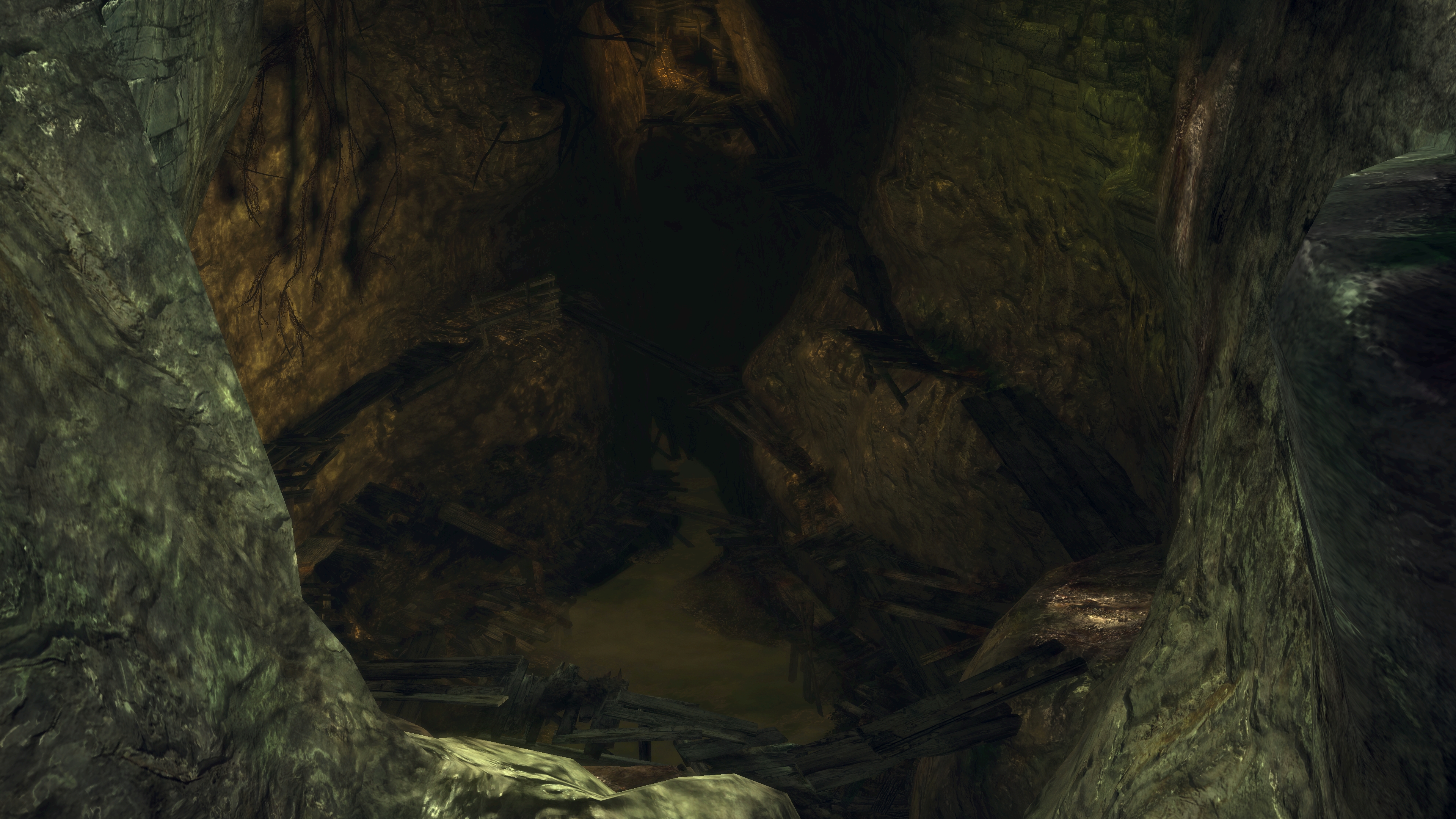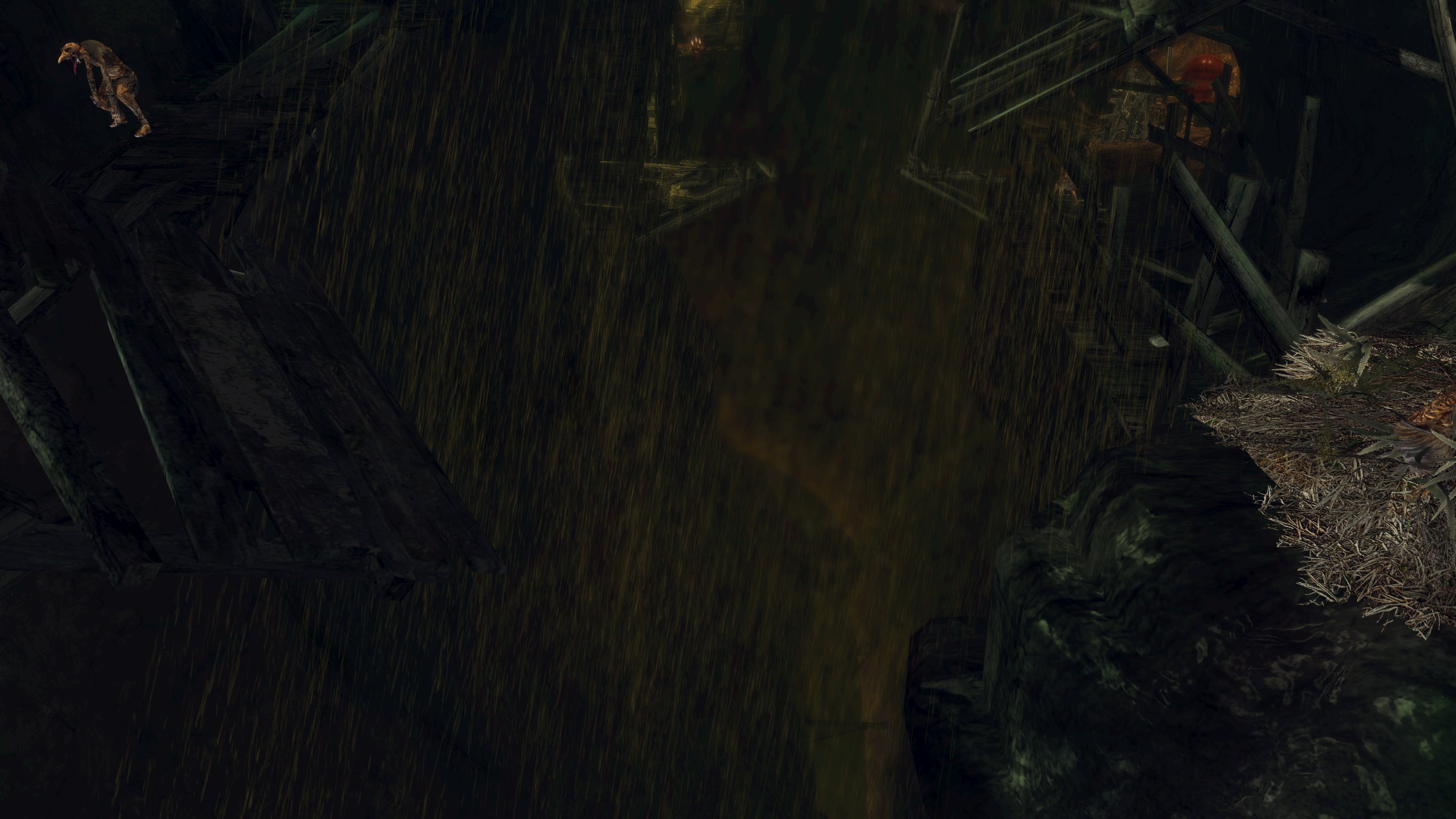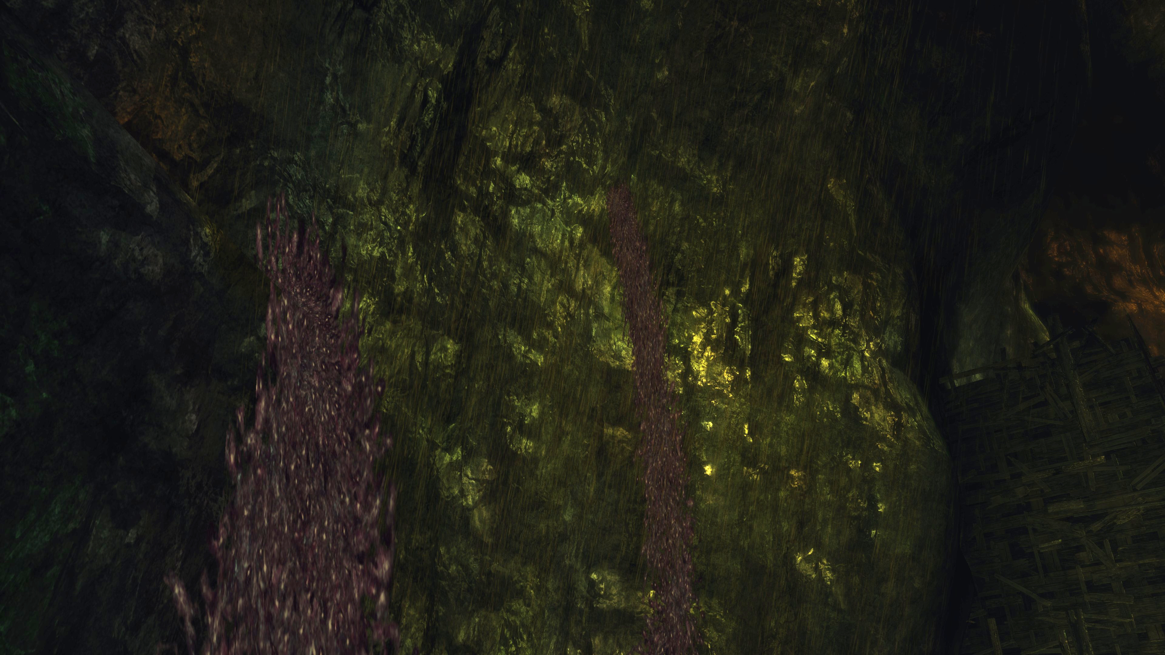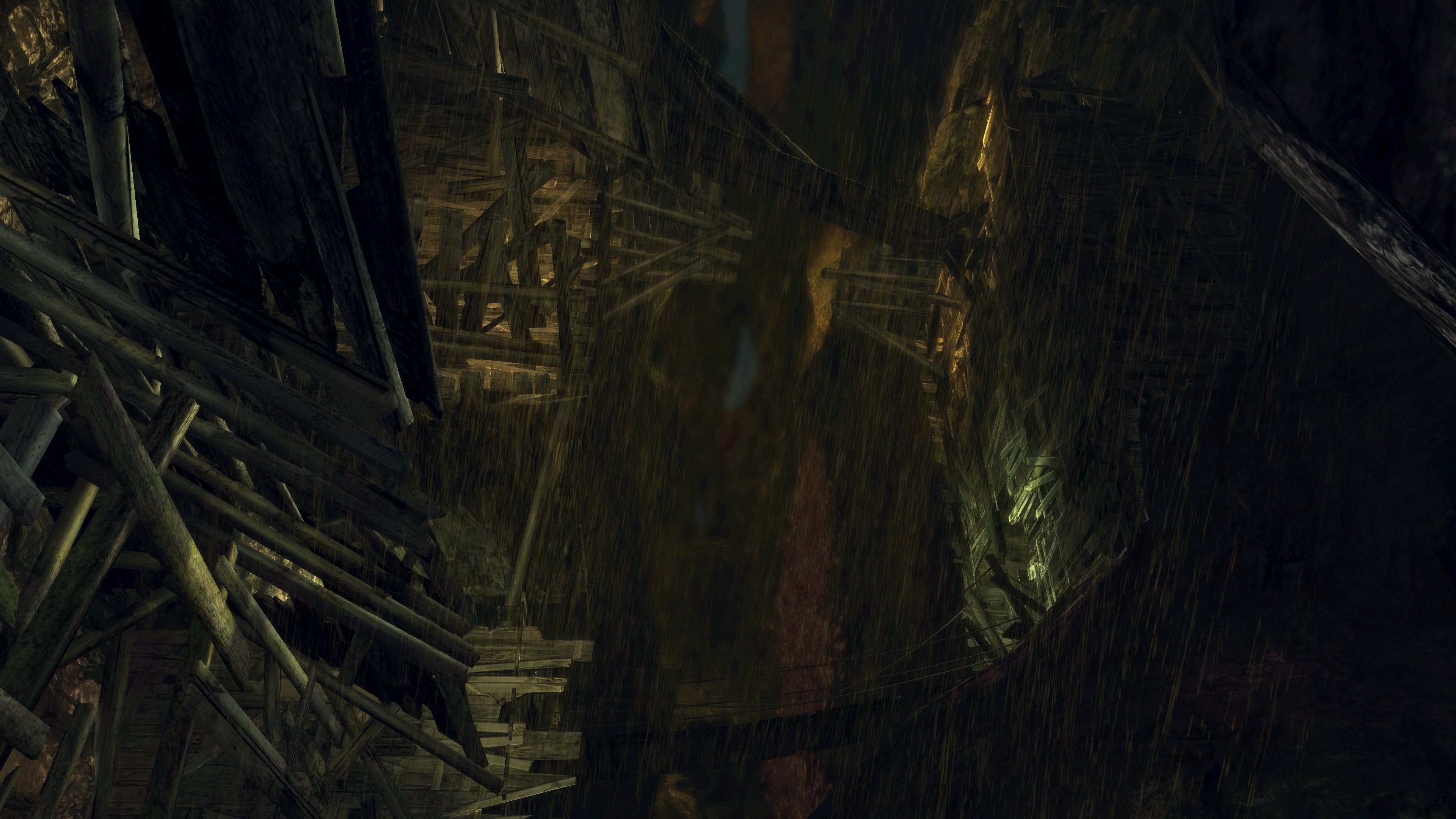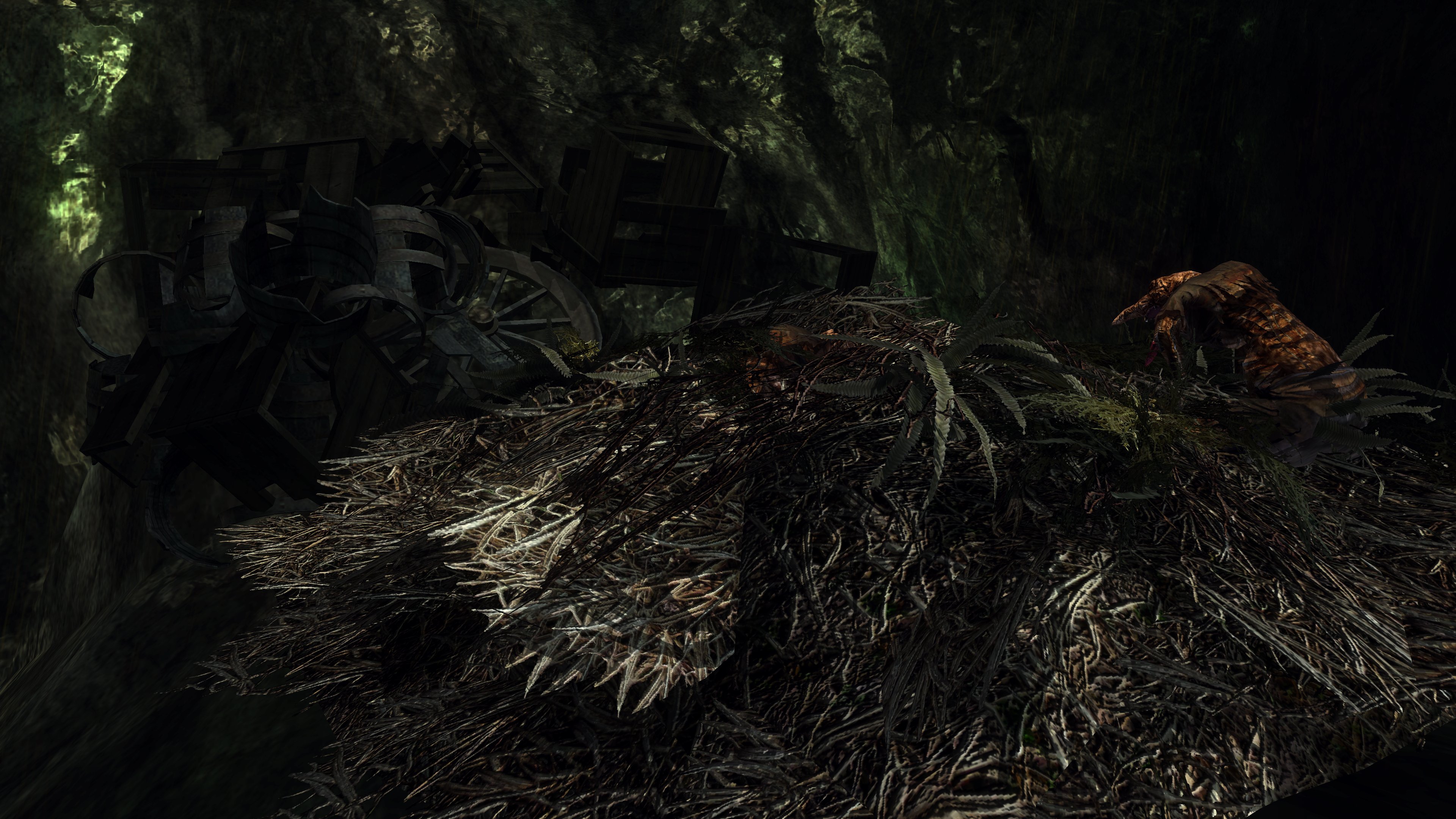 The Valley of Defilement has earned its name “rotten valley” (腐れ谷) as a consequence of all the decay it has accumulated over time. When we visit the area, it is pouring rain that causes entire waterfalls to stream over its cliffs and down to the very bottom. This weather naturally allows all manner of things to flow into the gorge, which apparently happens rather frequently if the swamp at its base is any indication. But it is not just water that has been flowing into this basin but everything unclean. Plants and filth; wooden beams, planks, barrels, and wheels; rope and straw; metal pieces and clay bowls; uneaten fruits and meat — every one of these things have ended up in the valley, drifting into the giant swamp before finally settling into a graben in the depths of the marsh. As the filthy woman puts it, this damp place is a trash dump, with refuse flowing in from nearby countries via rivers and the like. These likely includes Boletaria given that the valley is engulfed by the deep fog, and we can see a branching gorge on the western side of the world map. It is a naturally-formed trash bin, and what does trash do if not rot?