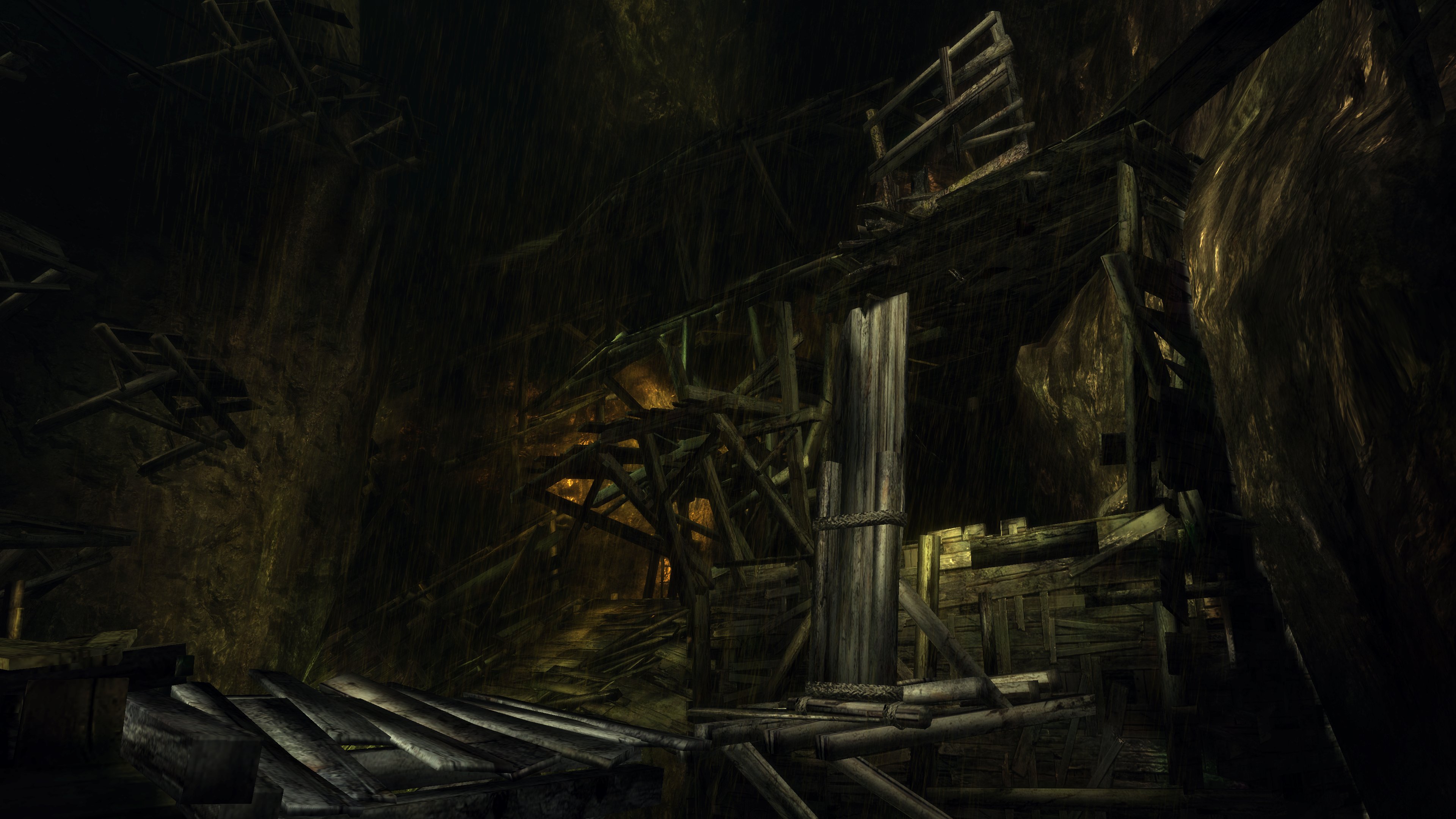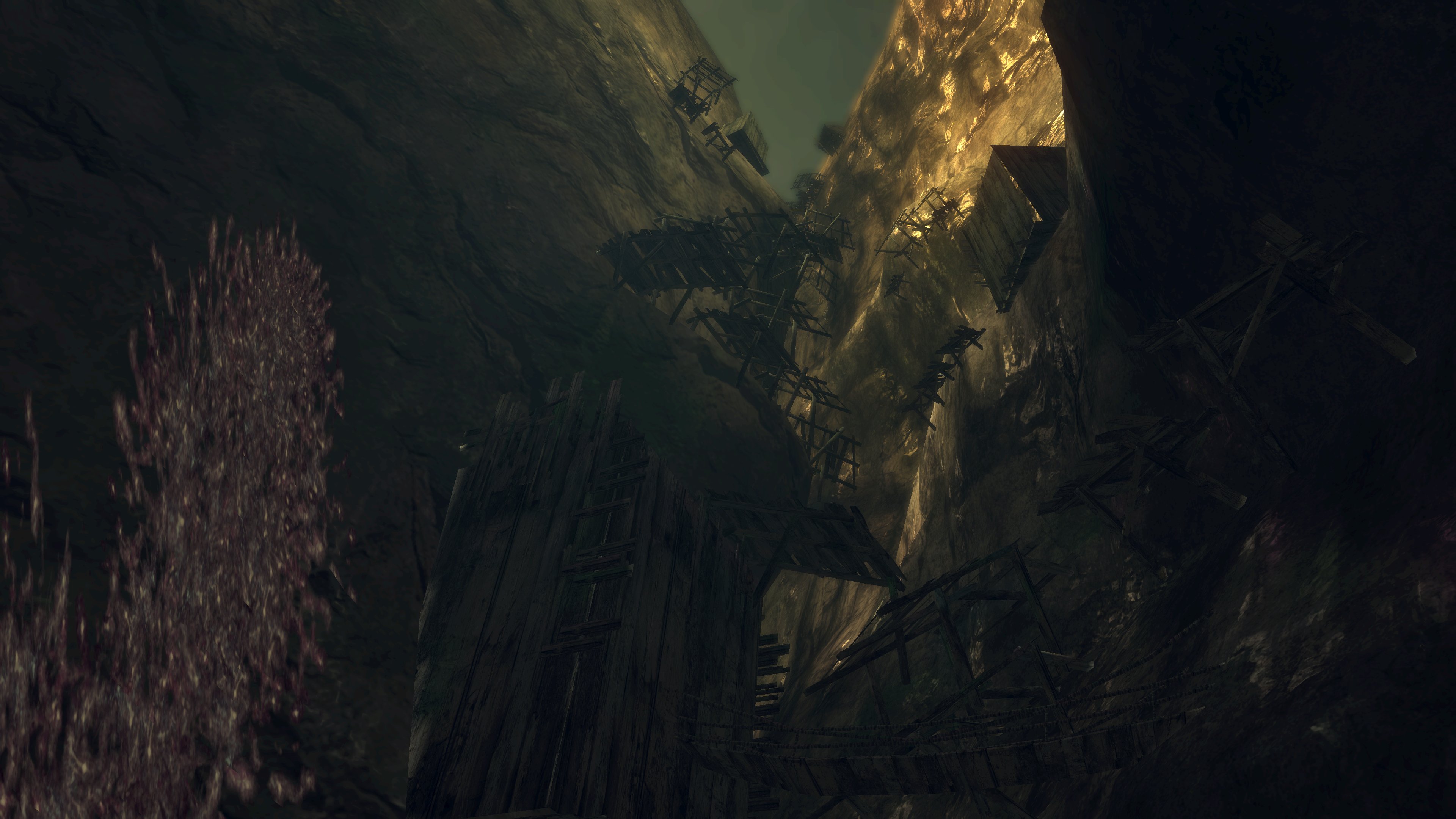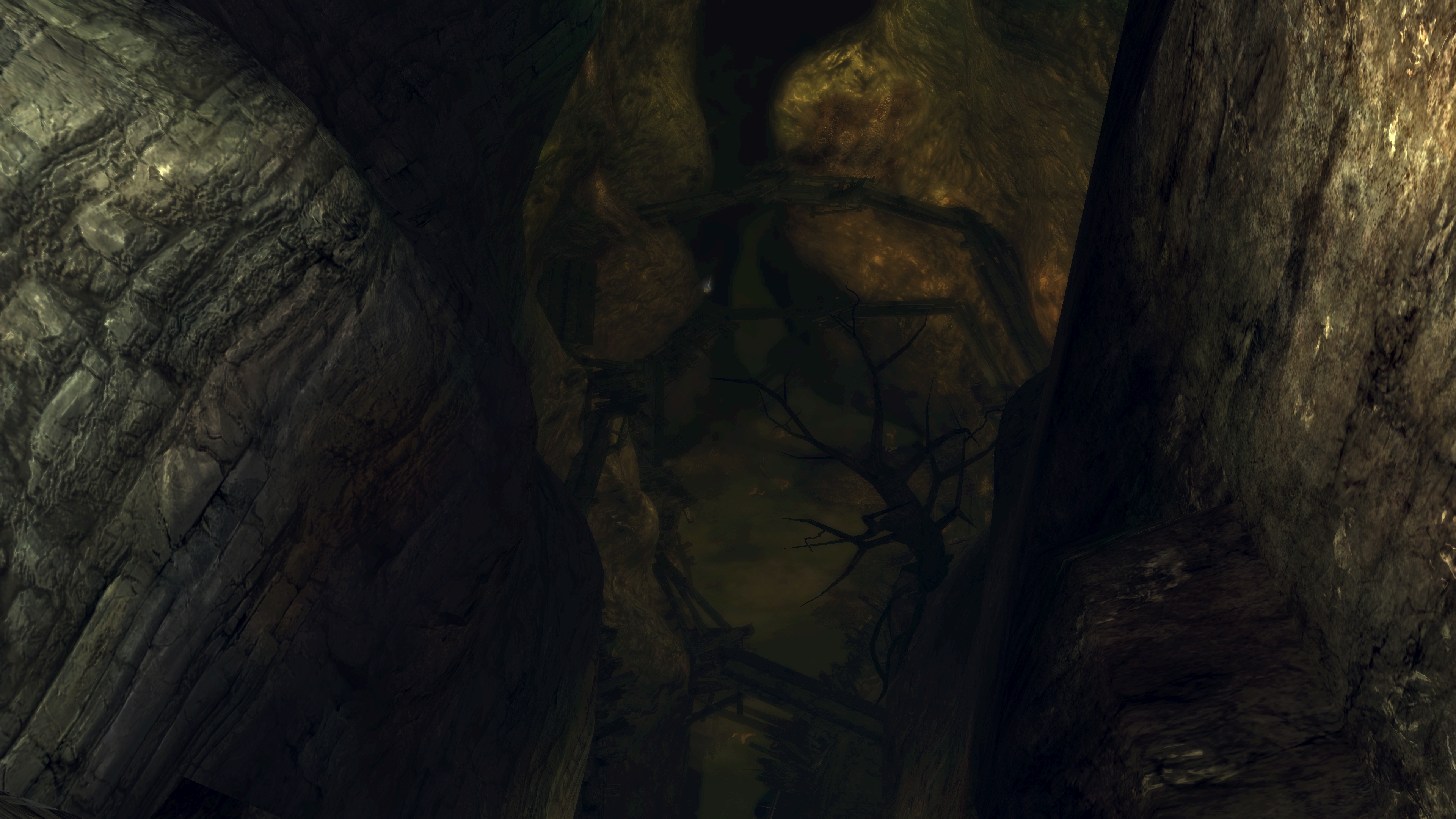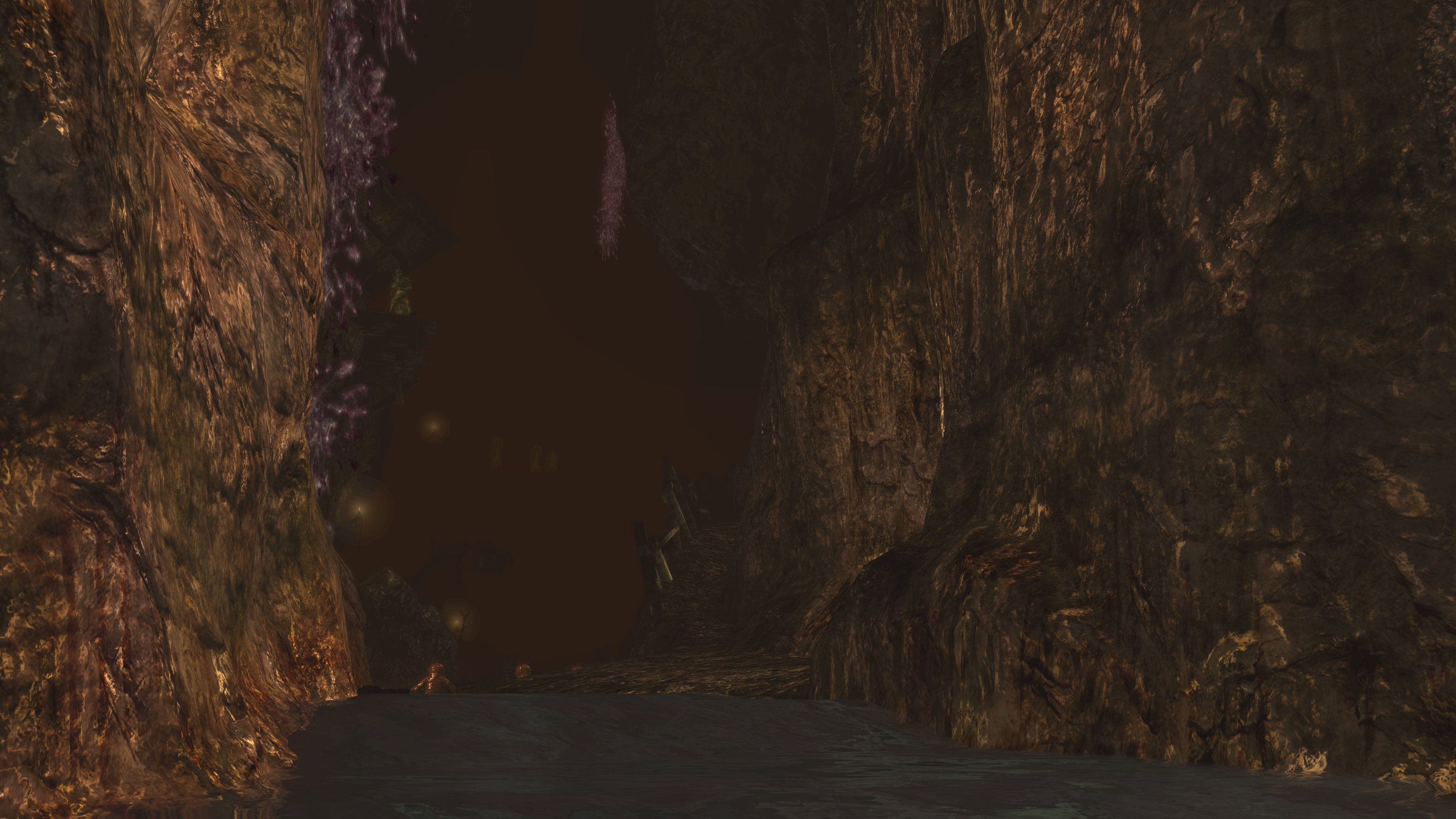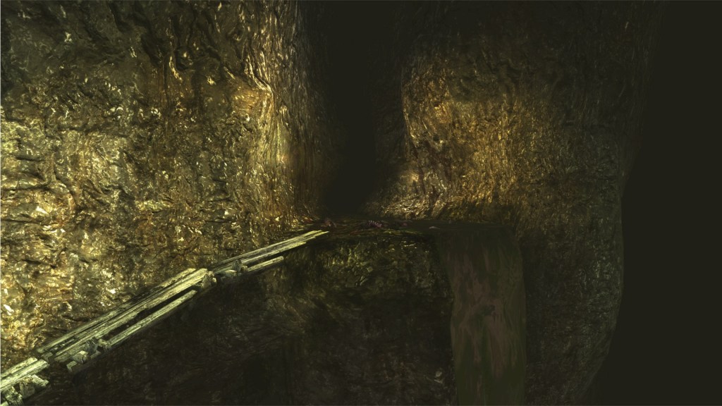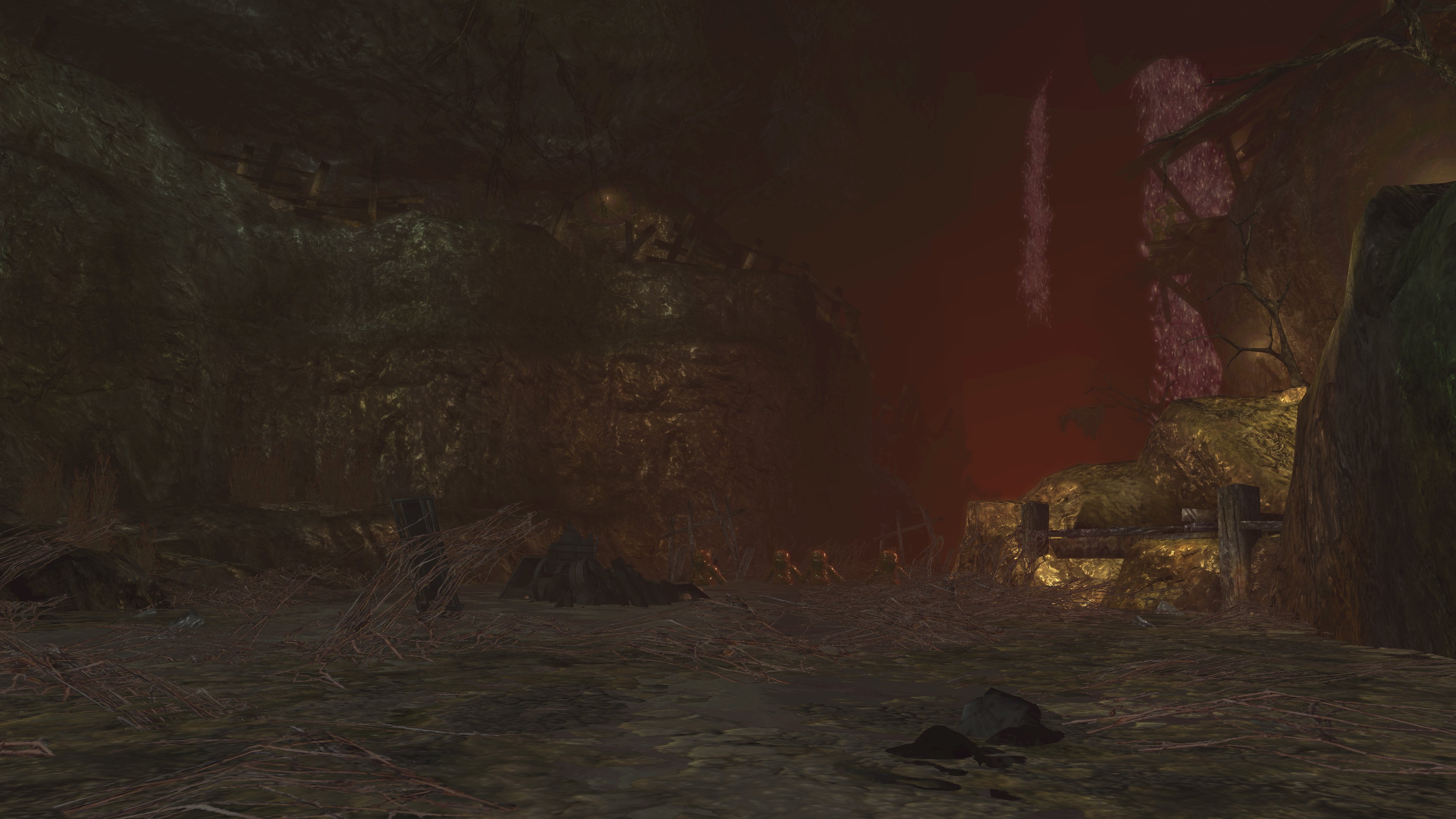 The Valley of Defilement has earned its name “rotten valley” (腐れ谷) as a consequence of all the decay it has accumulated over time. When we visit the area, it is pouring rain that causes entire waterfalls to stream over its cliffs and down to the very bottom. This weather naturally allows all manner of things to flow into the gorge, which apparently happens rather frequently if the swamp at its base is any indication. But it is not just water that has been flowing into this basin but everything unclean. Plants and filth; wooden beams, planks, barrels, and wheels; rope and straw; metal pieces and clay bowls; uneaten fruits and meat — every one of these things have ended up in the valley, drifting into the giant swamp before finally settling into a graben in the depths of the marsh. As the filthy woman puts it, this damp place is a trash dump, with refuse flowing in from nearby countries via rivers and the like. These likely includes Boletaria given that the valley is engulfed by the deep fog, and we can see a branching gorge on the western side of the world map. It is a naturally-formed trash bin, and what does trash do if not rot?