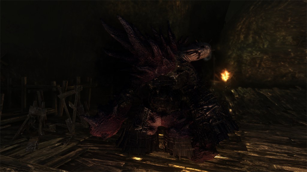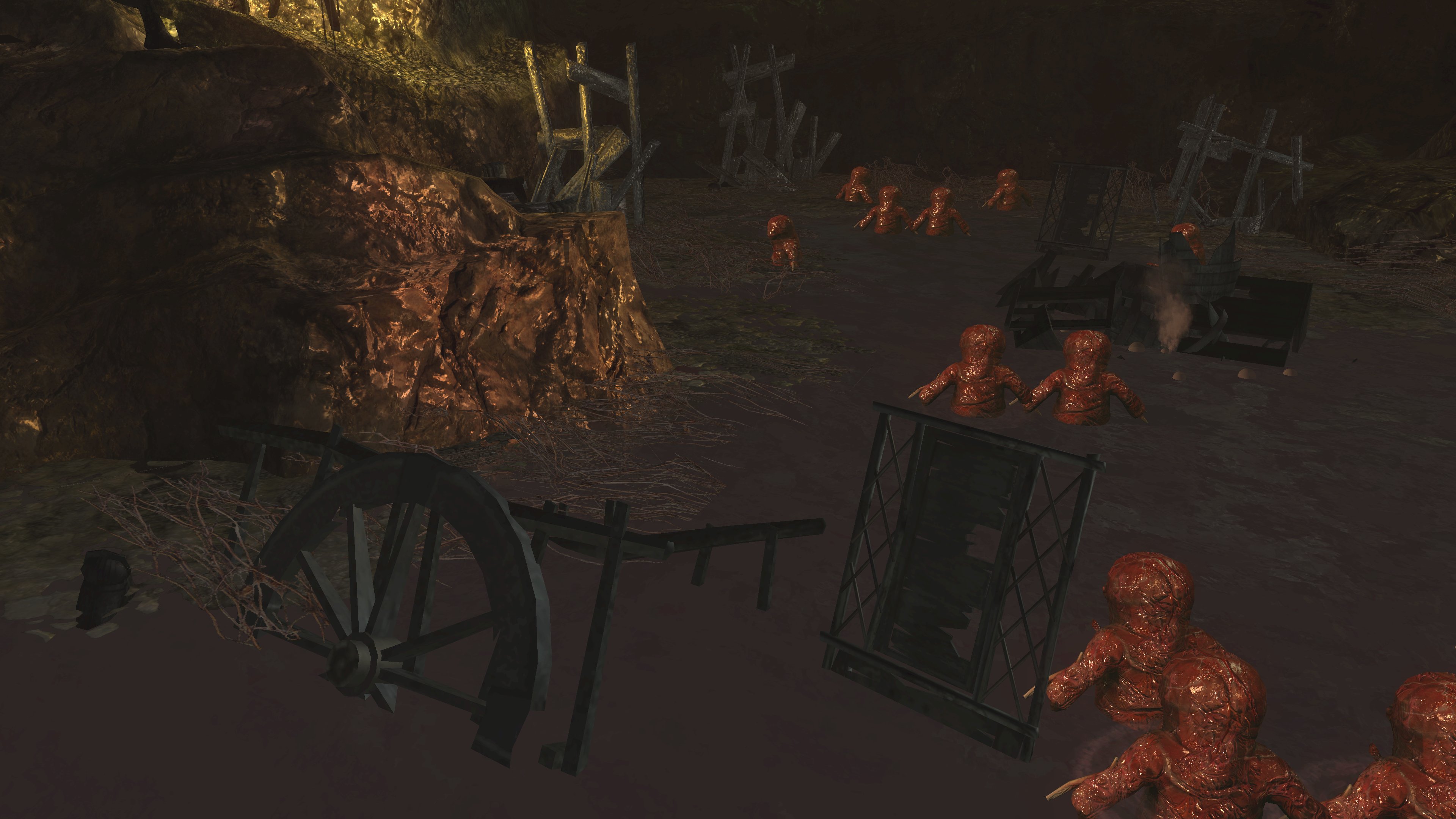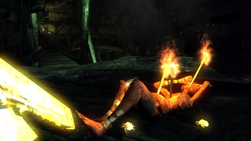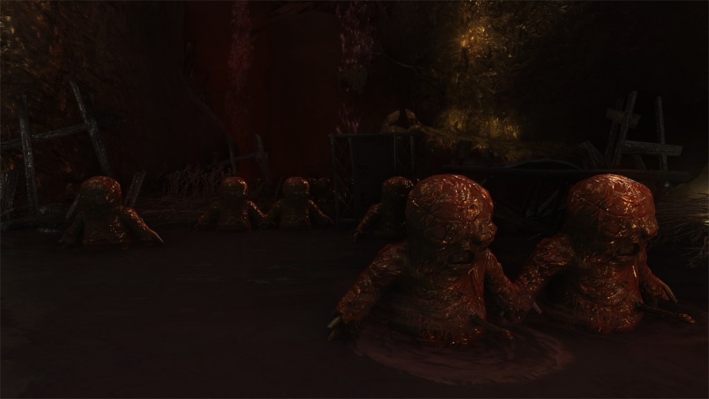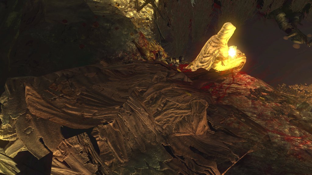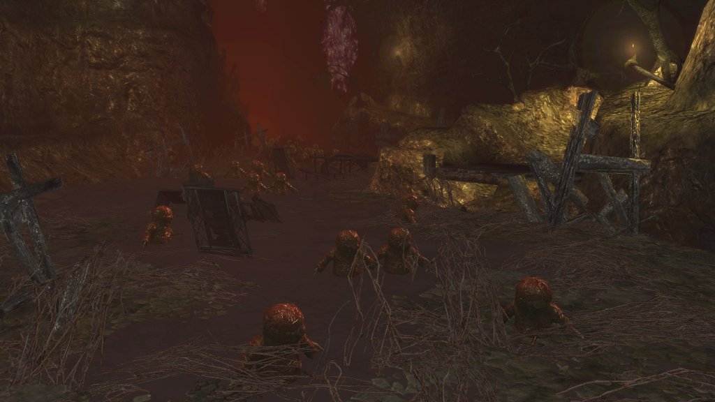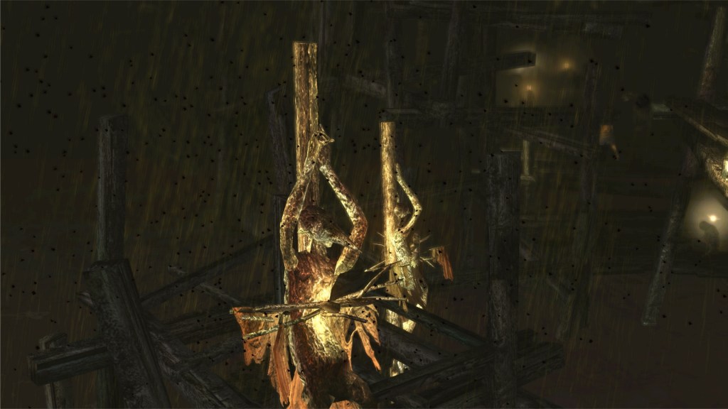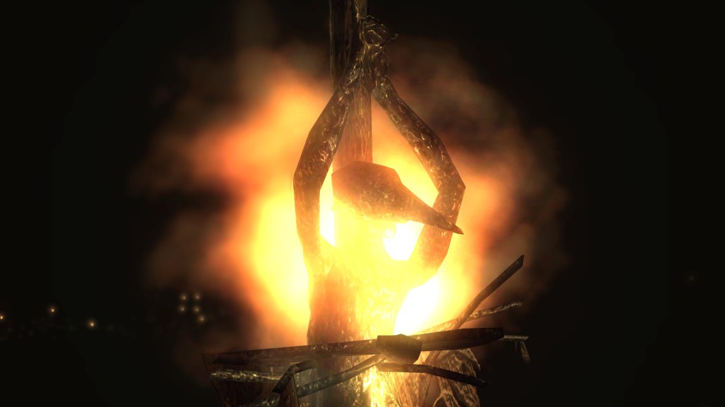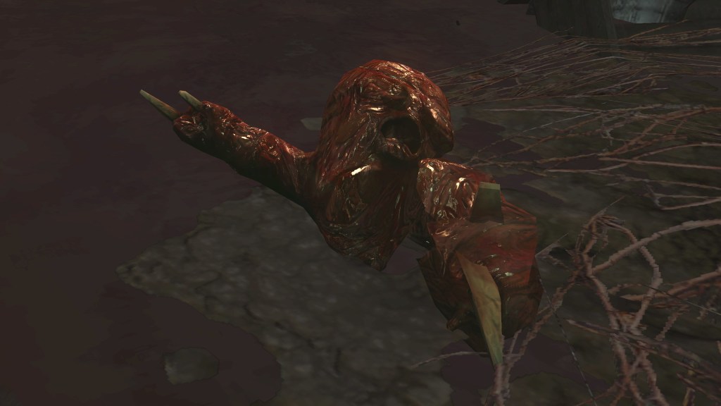 And so, the valley became a living hell. A number of men have been impaled upon long pikes with many metal bits jabbed into them. As if that was tortuous enough, these corpses have been set aflame to light various areas of the valley in lieu of torches, especially in the area directly leading up to Astraea’s temple. Moreover, several of the twisted residents we face use long firelit pikes, leaving no doubt to who caused this. If there were any men who didn’t convert to the worship of the maiden, they met a tortuous end soon enough — and not just them. More than just have her child snatched away as the localization iterates, the filthy woman states that both she and her son will be attacked if they are spotted by Astraea’s followers. The two of them weren’t alone either, as none of the other locals still alive are women and children, only the male zealots and the dark spirit of a cannibal in the swamp. The Nexus Archstone text further reveals that anyone who happens to wander into the valley will also be attacked. The land has been taken over by a mob of “depraved” fanatics killing anyone including each other, leaving ominous implications for the rotten flesh fueling their campfires.