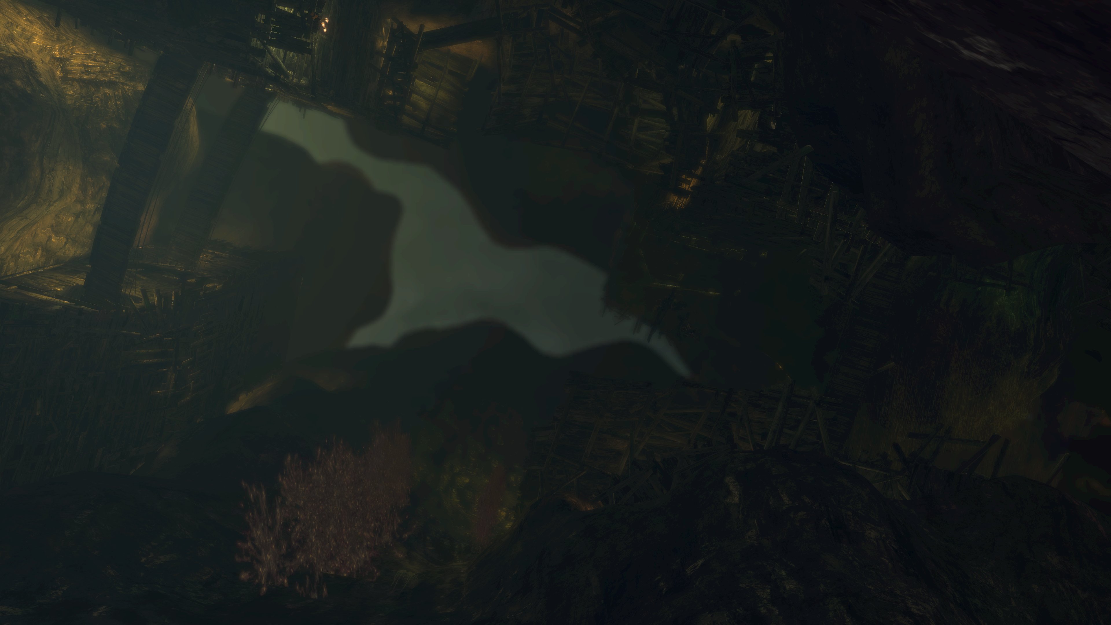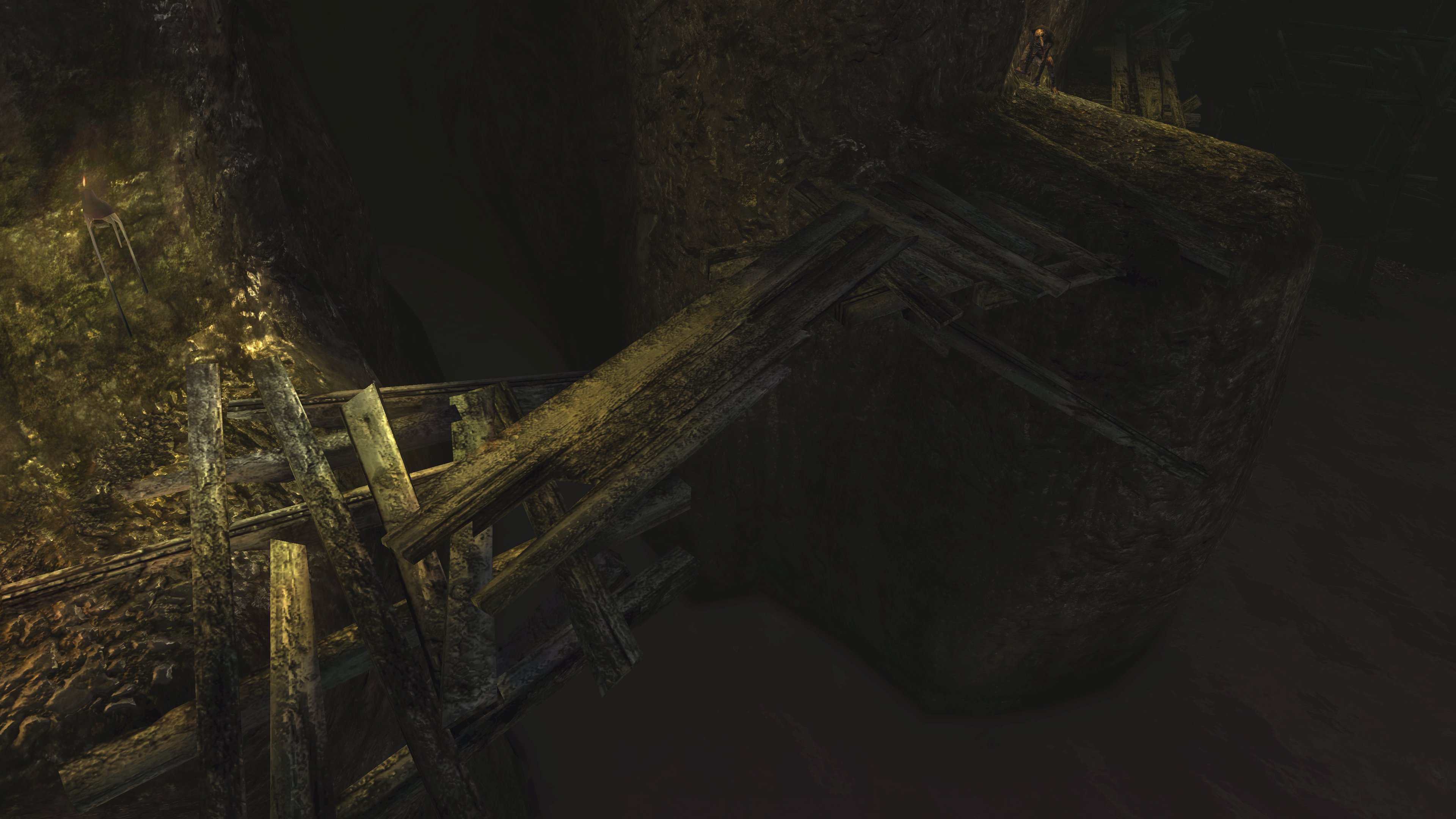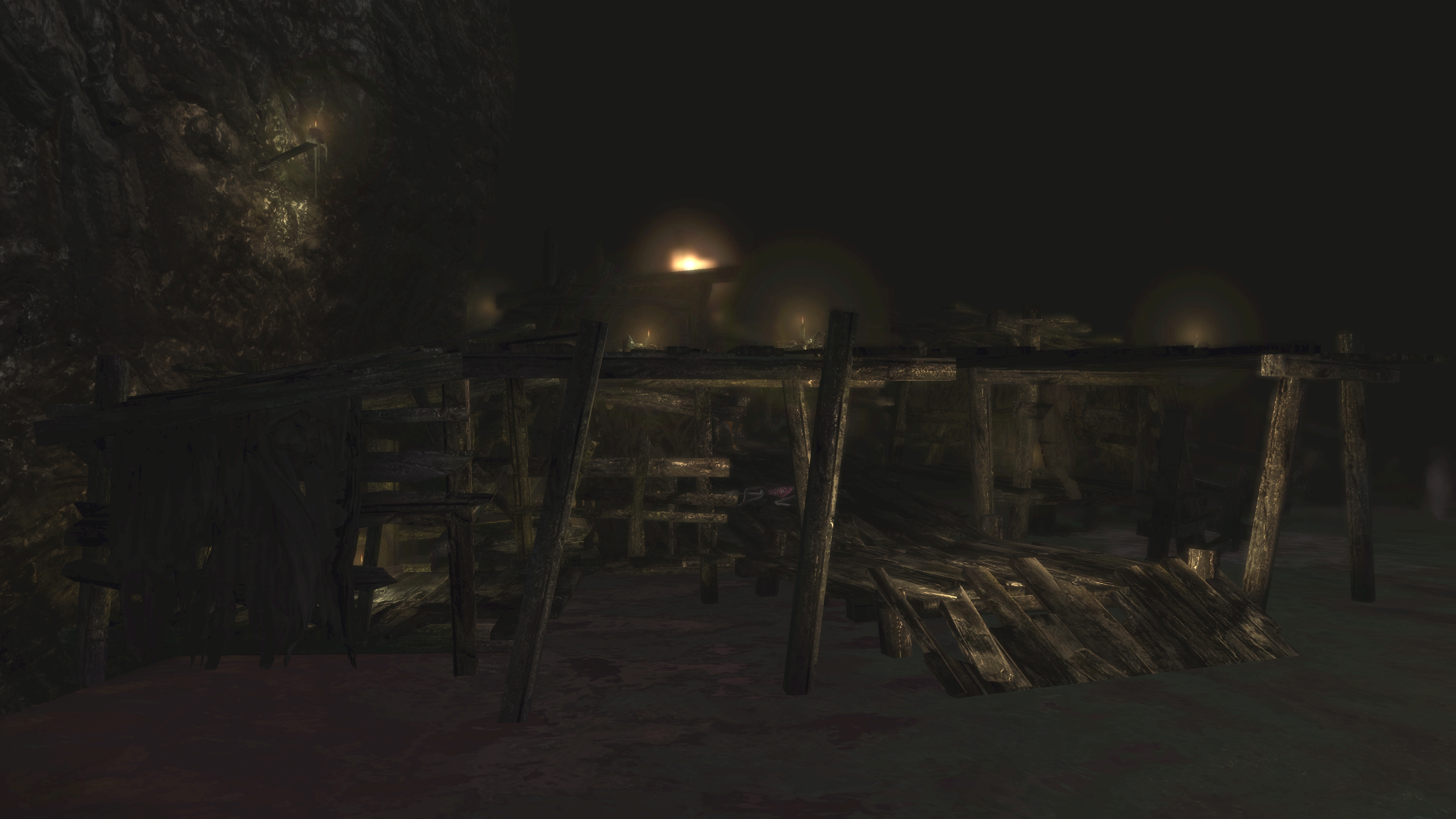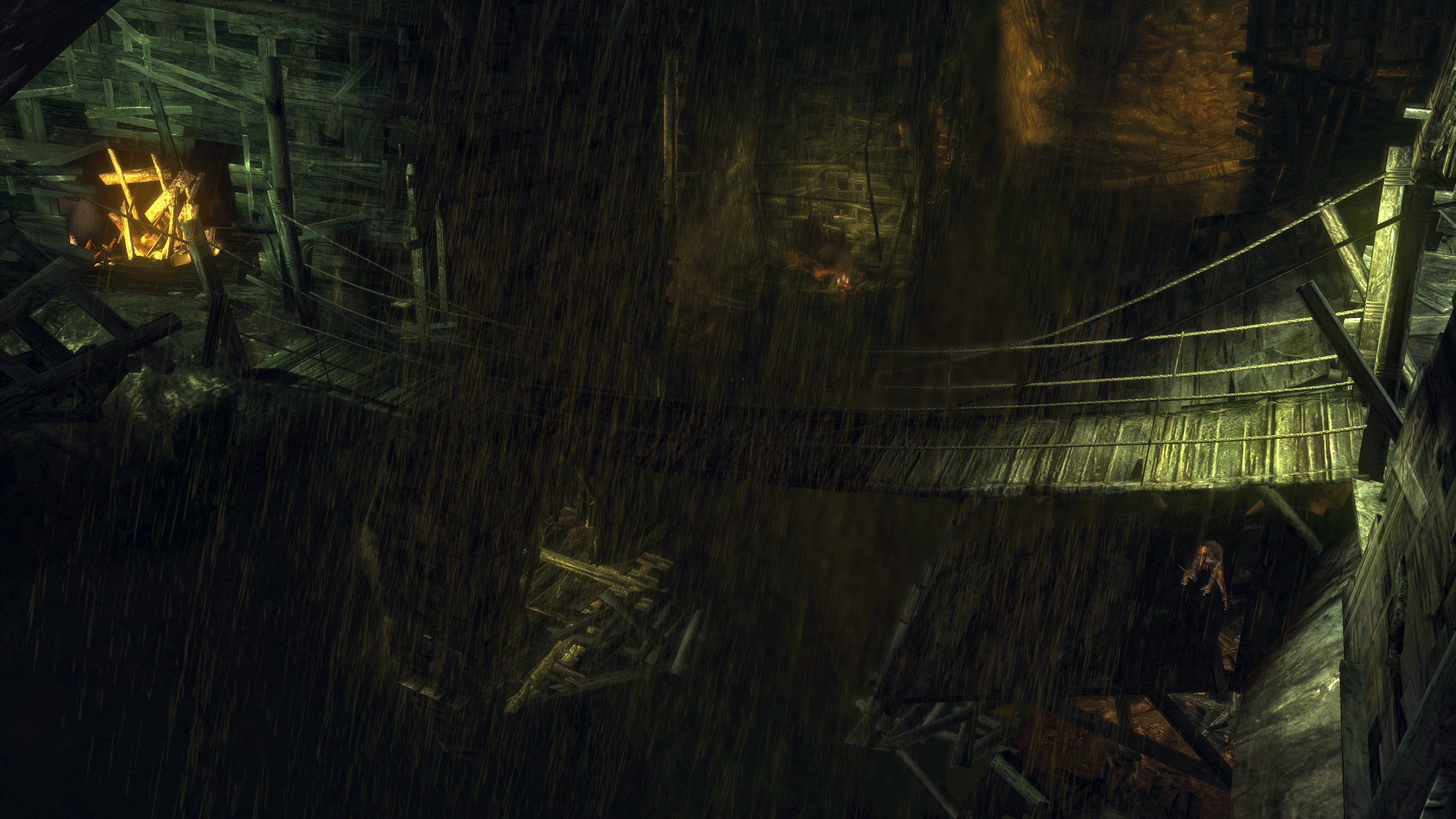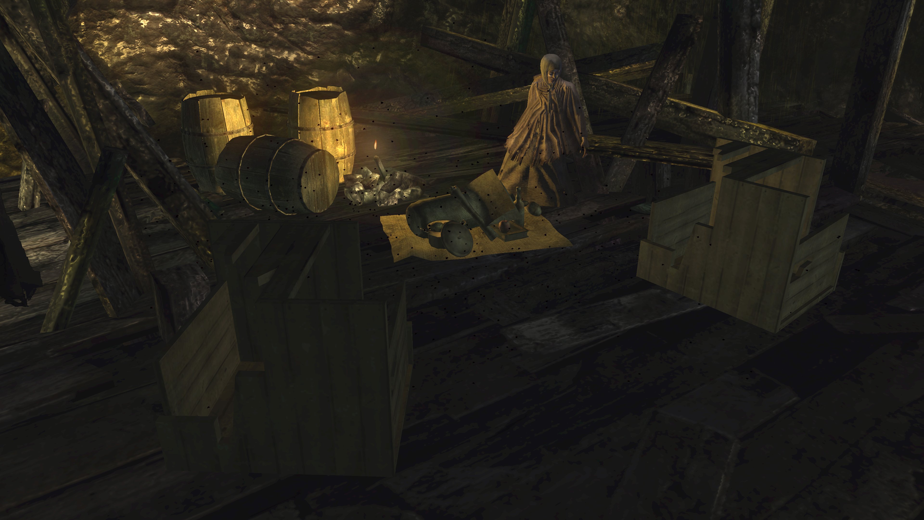 Nature has been corrupted by man’s discarded pollution. The valley serves as proof that cleansing ourselves doesn’t eliminate these impurities, only diverts them elsewhere to fester. This includes man itself. The filthy woman describes the valley’s rot specifically as “human or otherwise” in her Japanese dialogue. Indeed, we come across plenty in the gorge — people who have built themselves homes and bridges out of the leftover materials in the swamp as evidenced by the small boats commonly docked by the trash islands. They have settled their own little village in the valley, and based on the Archstone used to reach it, they are descendants of the destitute nomads whose chief received one such stone. This begs the question: Who were these wandering poor and why did they apparently end up settling in this deathtrap? The answer lies in the old ring found among the trash down there. In a similar vein to the Graverobber’s Ring, its sapphire gem suppresses the body’s presence, making it difficult for others to detect the wearer — thus appropriately called the Thief’s Ring. These were criminals.
