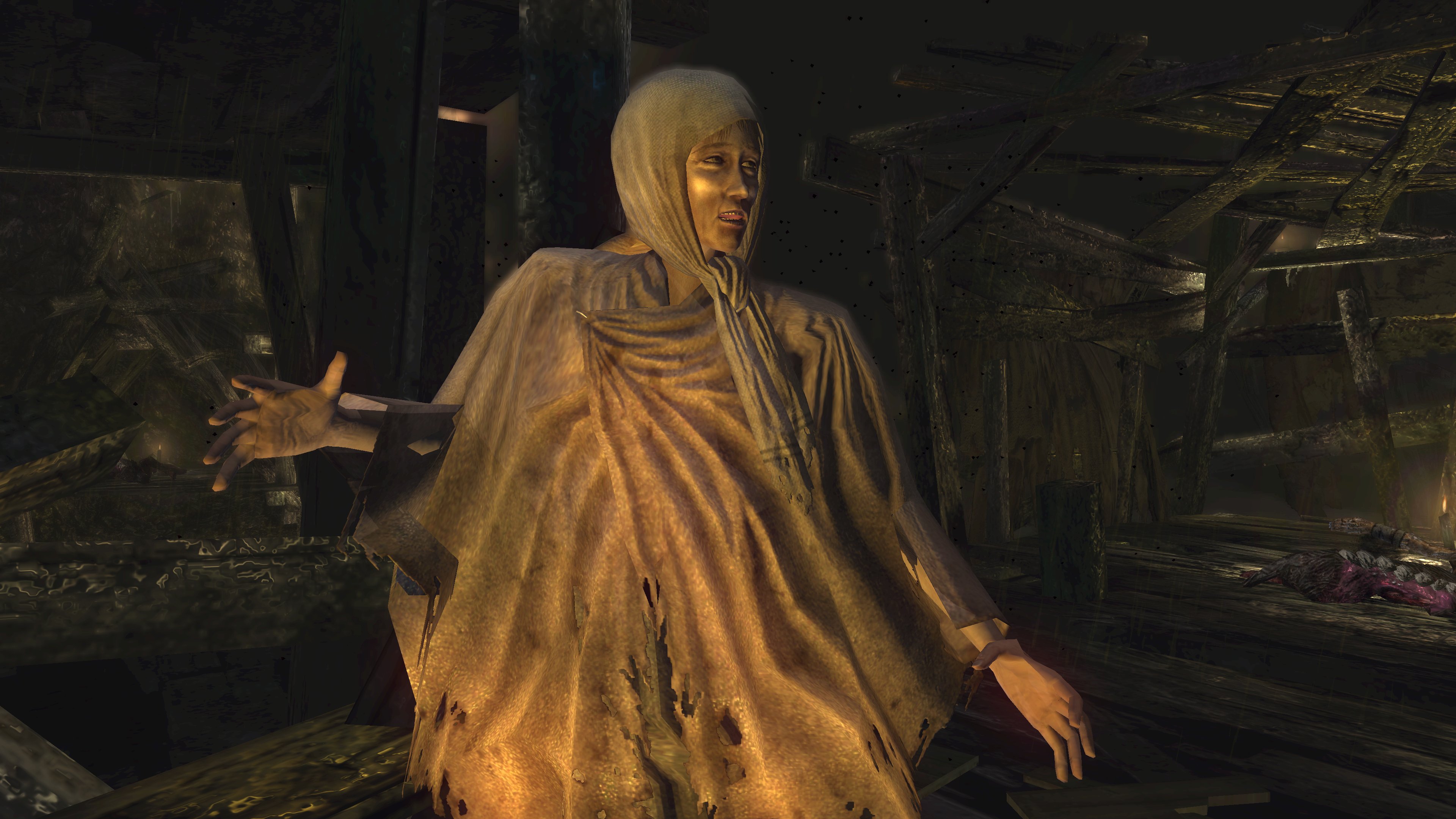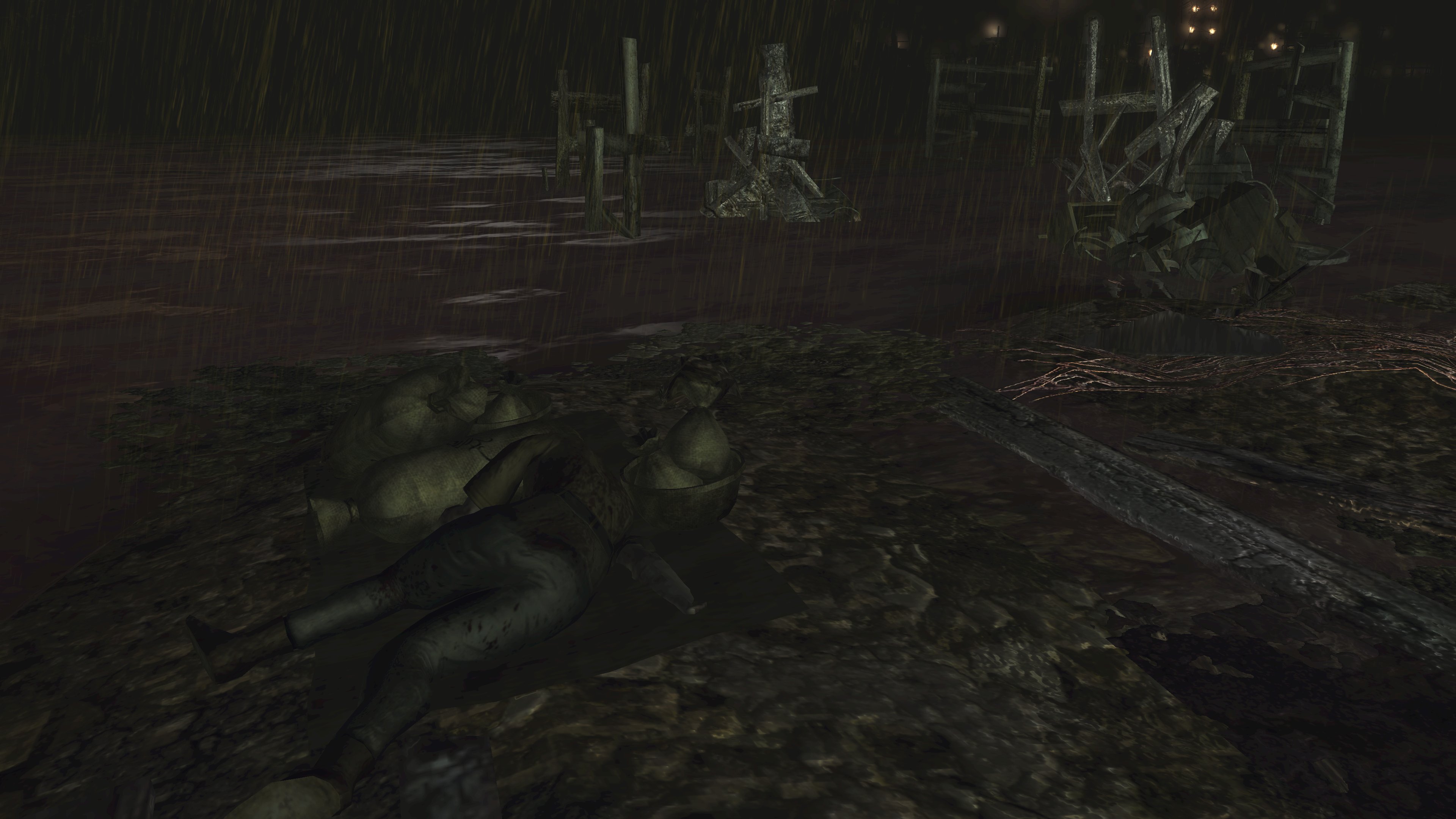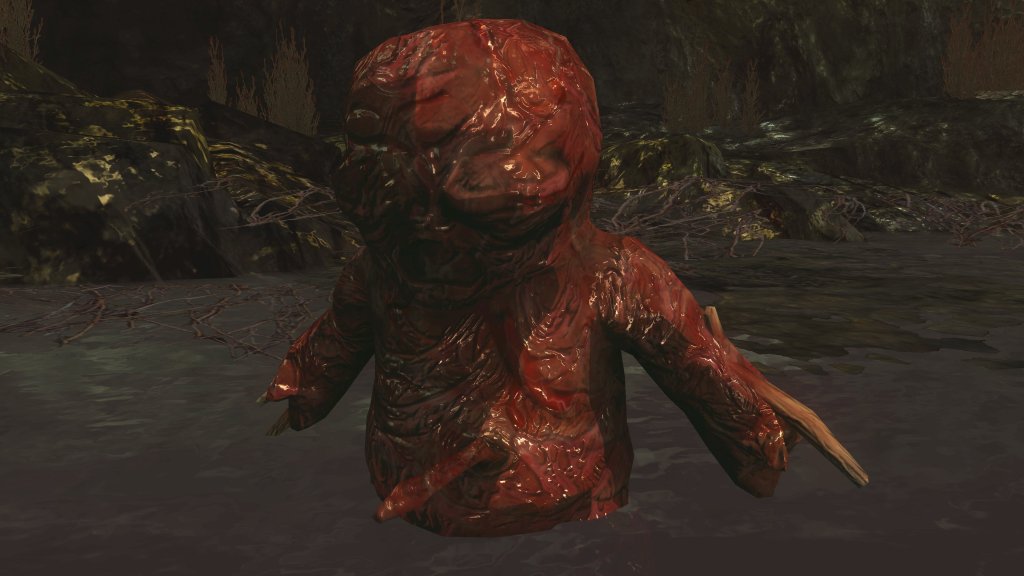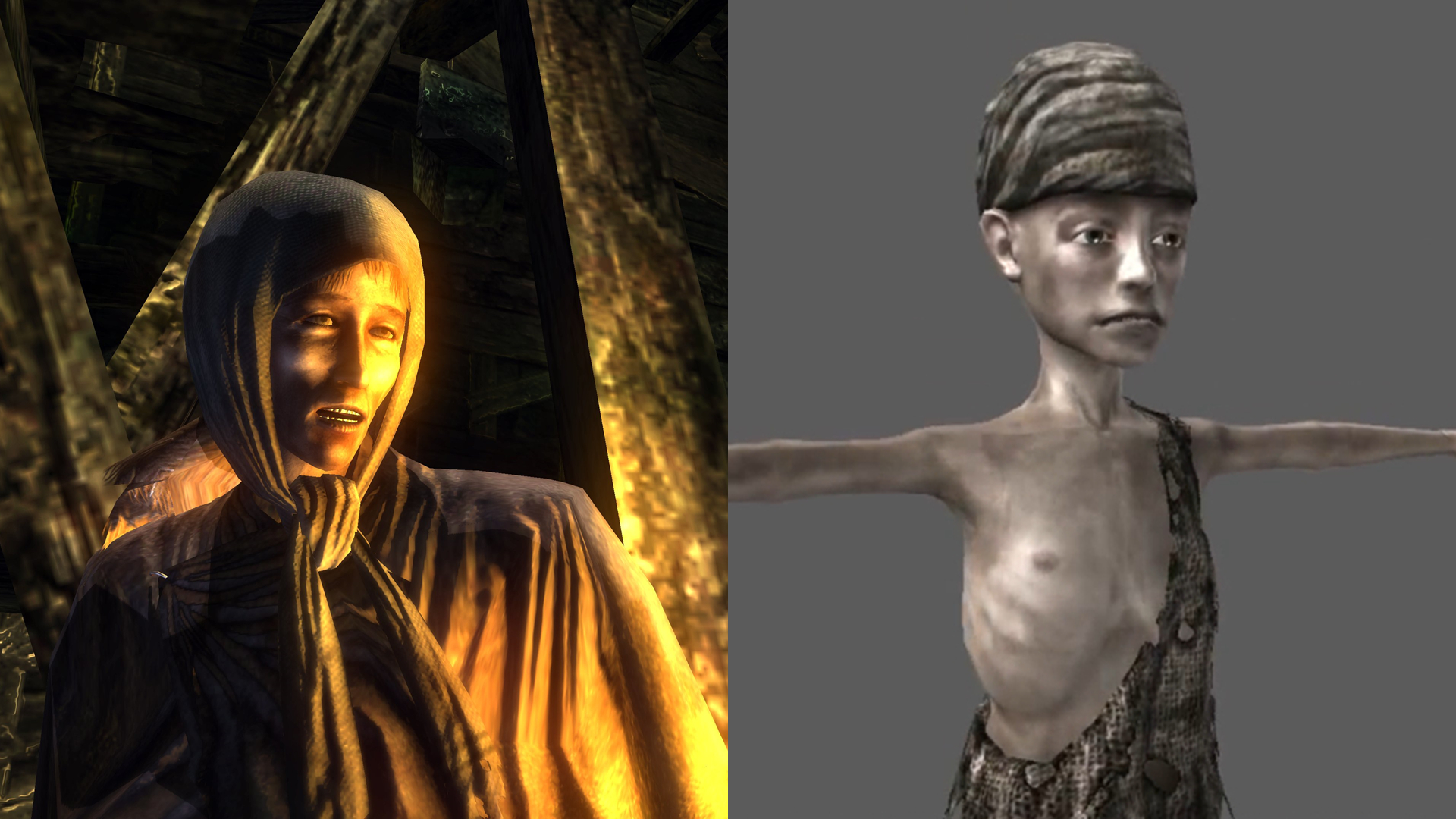 Although it may be their safe harbor from the rest of the world, it is still not an easy life down there. Their village is shoddily constructed at best; their beds, simple piles of plants or hay, devoid of any luxuries. Even though they built their village to live above the squalor, ramshackle homes don’t stop all the poison biters, bloodsuckers, and plague spreaders from infesting them. These deadly afflictions are part and parcel to living there, making the lotuses that the filthy woman promotes for sale a necessity to survive. And based on her inventory and the boats lying around the swamp, the villagers spend their days scavenging whatever scraps and junk they can find to eat or trade amongst themselves. This pathetic economy leaves most ill and hungry as exemplified by the filthy woman’s son. Since she speaks as if he is there with her while nowhere to be seen, some conclude that the woman is either lying or delusional. However, a cut model of a malnourished boy dressed in rags indicates that her son was originally intended to appear in-game, so he was likely removed due to concerns about players electing to kill children. We can thus assume that she is not a horrible liar when it comes to the “child” accompanying her.