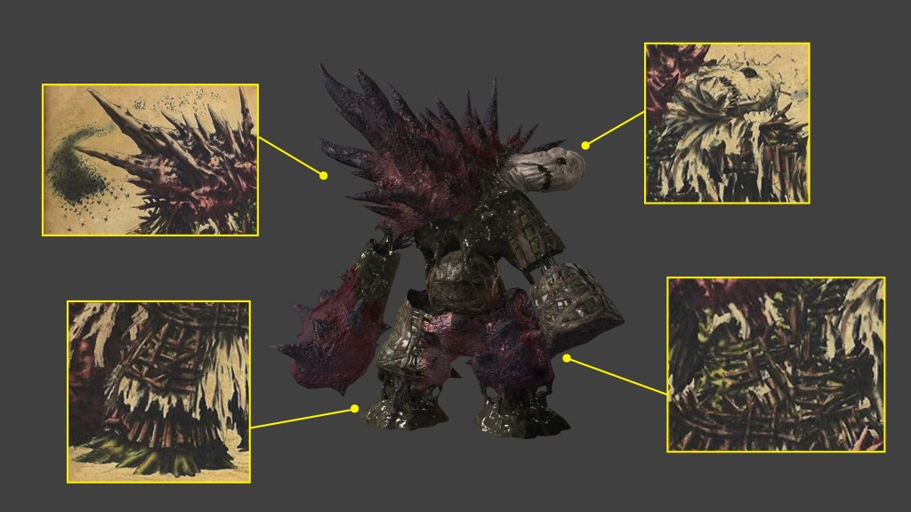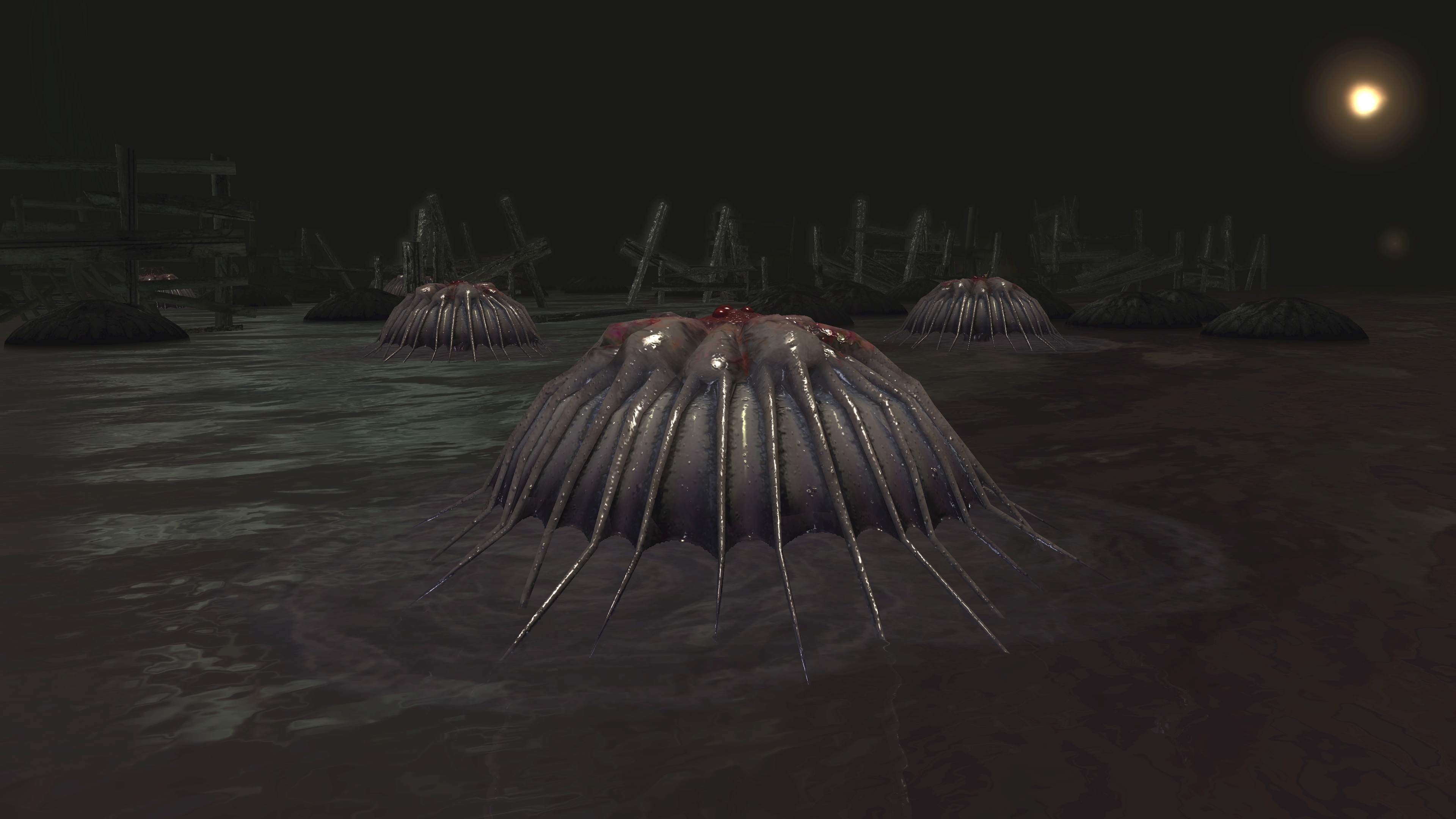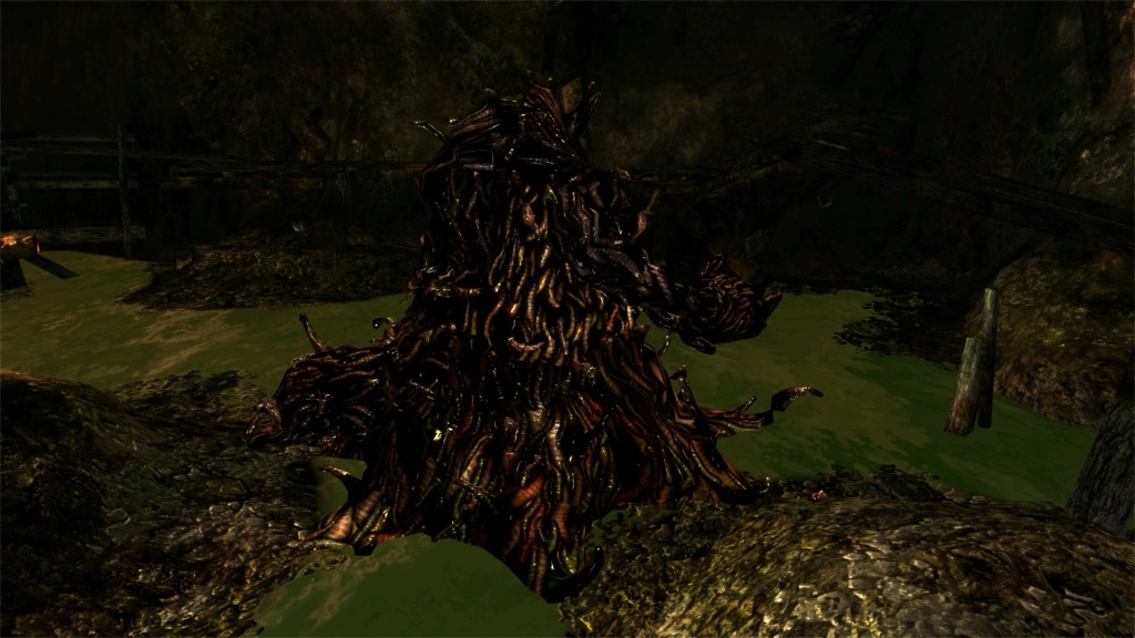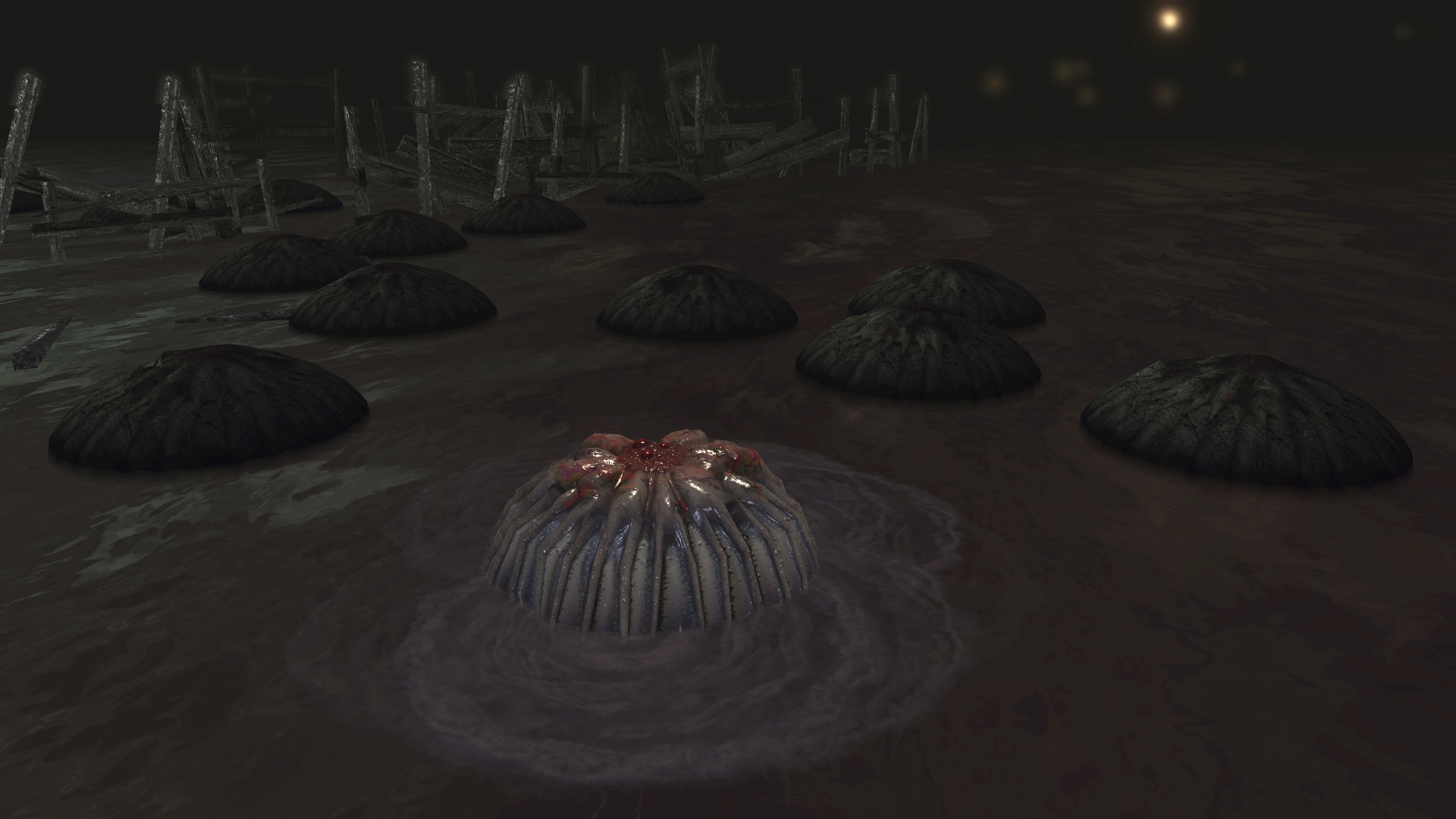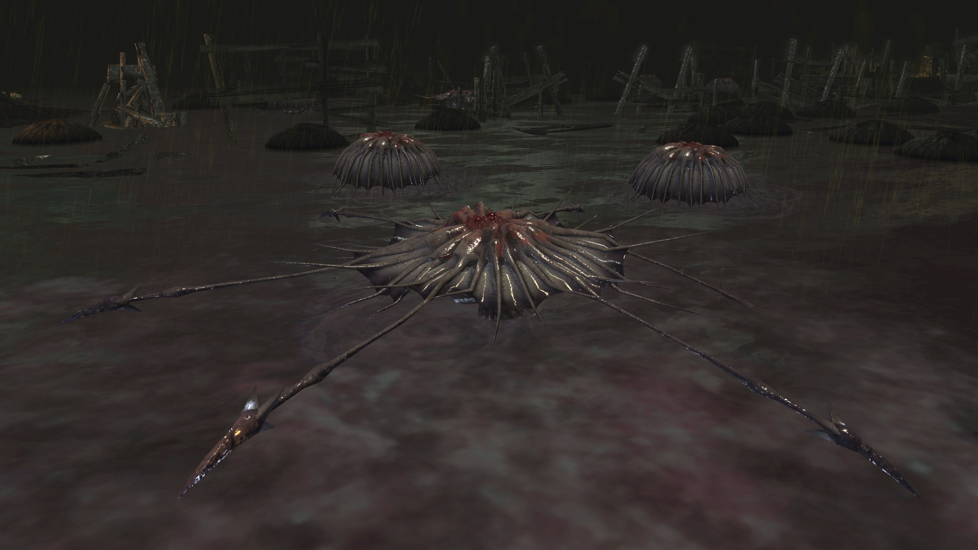 This decay is invariably inspired by Japanese culture. In Shinto, water embodies purity, and thus flowing water often conveys a cleansing force washing away impurities. But what happens when the flow of water finally ends? The answer is that it stagnates along with all the impurities brought with it. And what happens as these impurities slowly pile up? The filth accumulates until it has been fully sullied, like dirt and fallen leaves in the basin of a forest stream. The end result is a stagnant pool of unclean water, its purity spoiled. This concept is reflected in the swamp of the valley, which has accrued islands of trash that have made it a disgusting mire of putrilage over the years. And like any trash pile left to rot for a long time, the swamp has become a breeding ground for pests and disease. Trees have tried and failed to grow in this plague-ridden environment. And while the vermin mentioned in the text for the Leechmonger Archstone specifically refer to “poisonous insects”, (毒虫) the swamp is home to a variety of deadly fauna including giant mosquitoes, blood ticks, leeches, slugs, flies, plague rats, and turbid jellyfish. But the connections go much deeper.