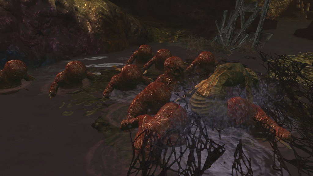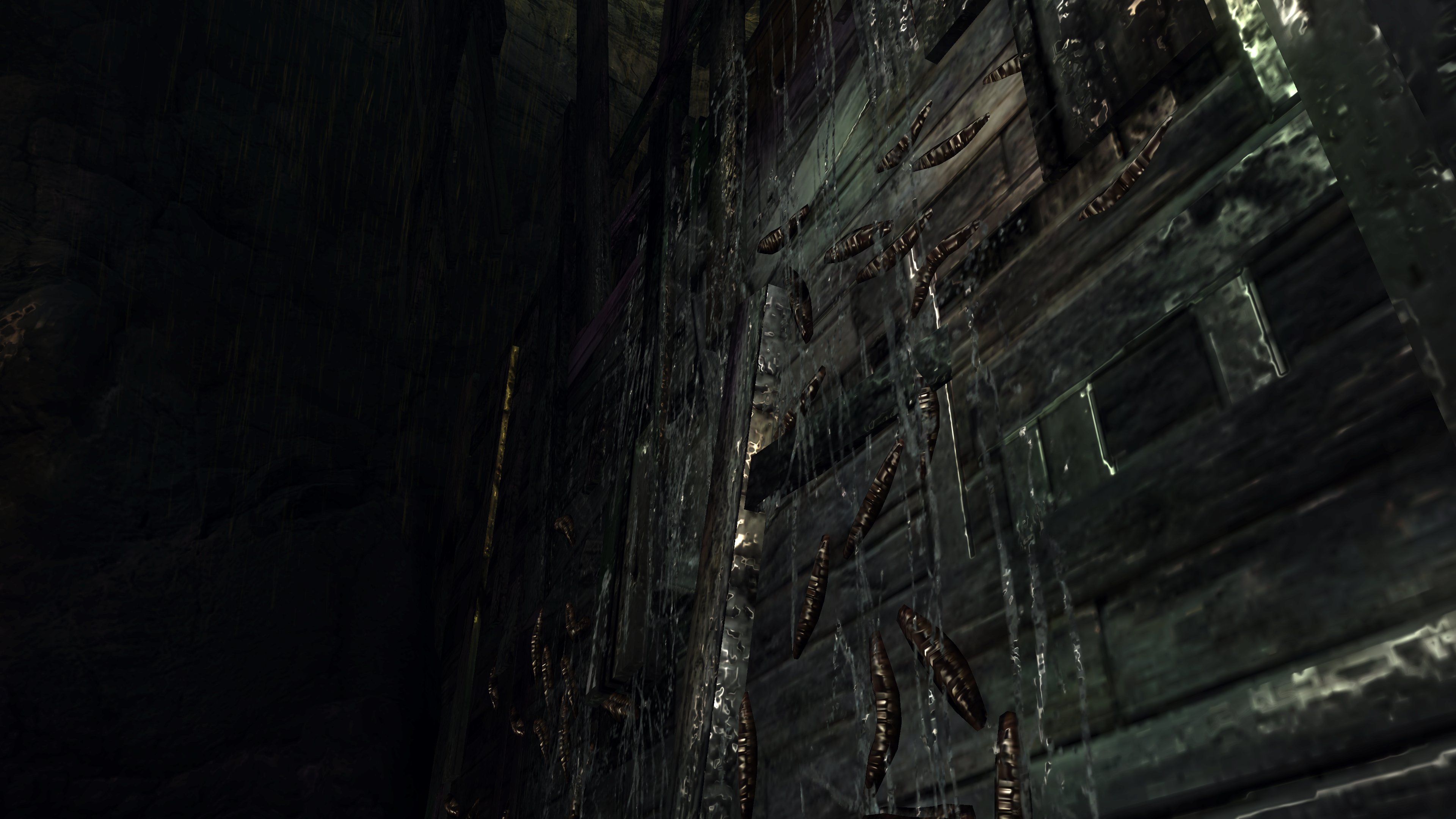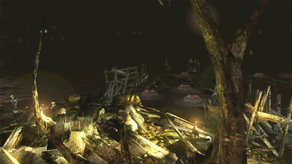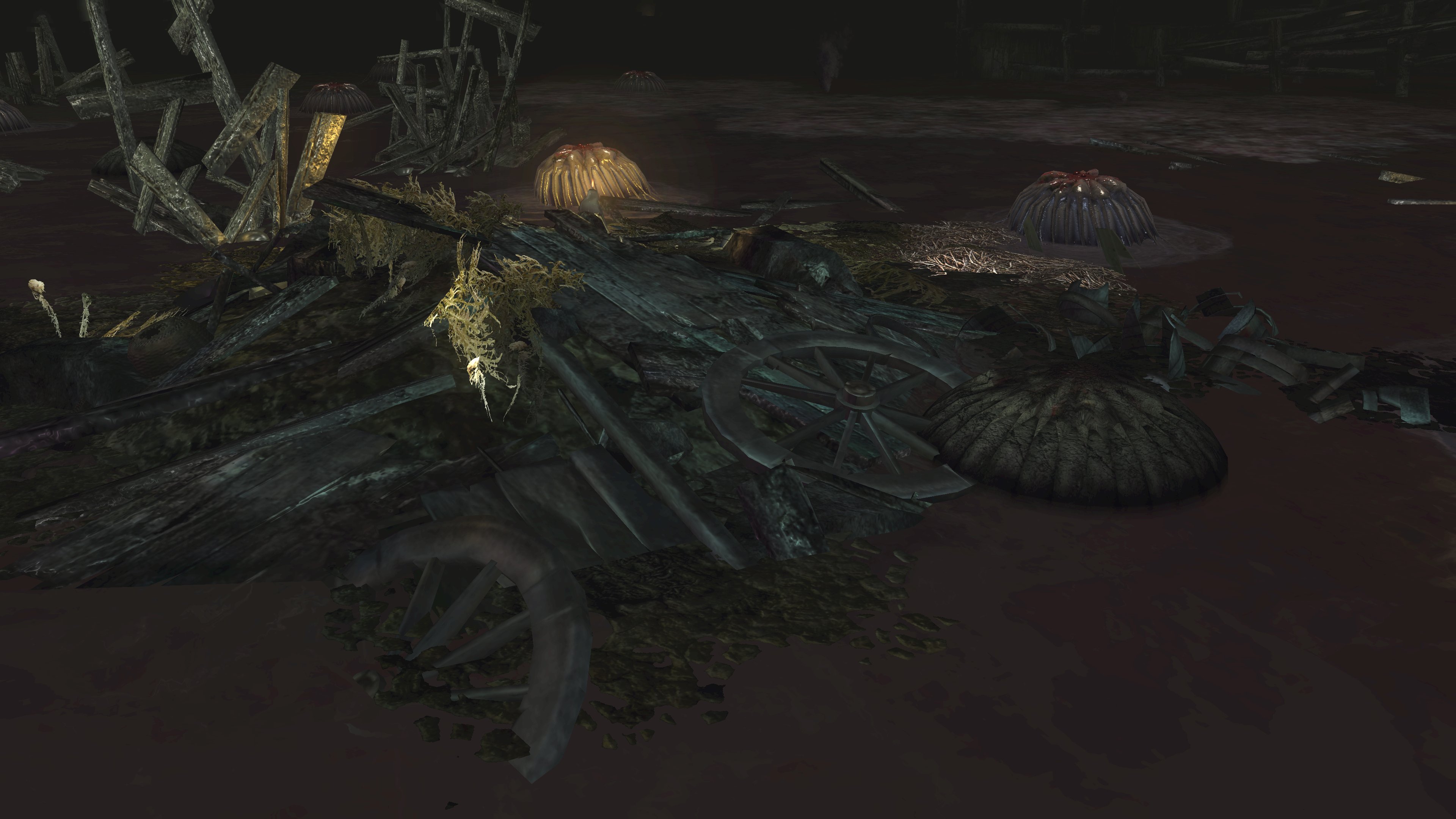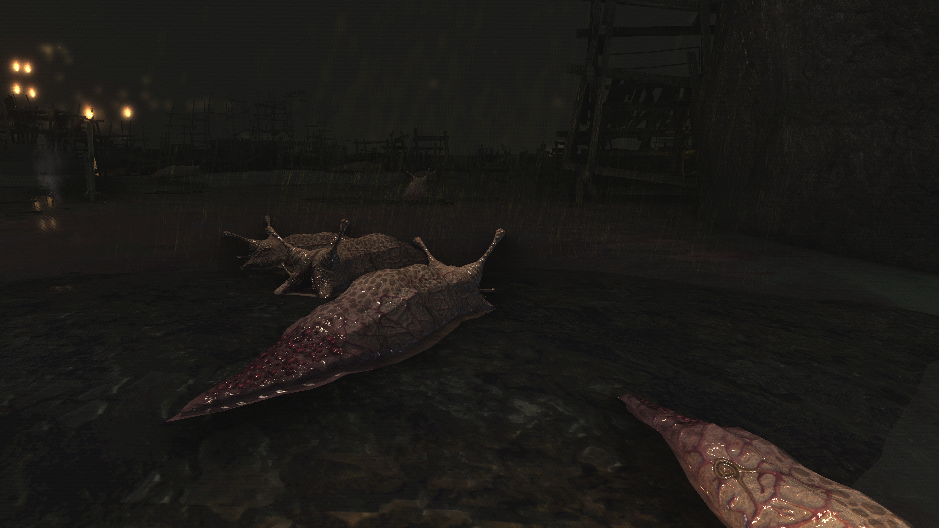 This decay is invariably inspired by Japanese culture. In Shinto, water embodies purity, and thus flowing water often conveys a cleansing force washing away impurities. But what happens when the flow of water finally ends? The answer is that it stagnates along with all the impurities brought with it. And what happens as these impurities slowly pile up? The filth accumulates until it has been fully sullied, like dirt and fallen leaves in the basin of a forest stream. The end result is a stagnant pool of unclean water, its purity spoiled. This concept is reflected in the swamp of the valley, which has accrued islands of trash that have made it a disgusting mire of putrilage over the years. And like any trash pile left to rot for a long time, the swamp has become a breeding ground for pests and disease. Trees have tried and failed to grow in this plague-ridden environment. And while the vermin mentioned in the text for the Leechmonger Archstone specifically refer to “poisonous insects”, (毒虫) the swamp is home to a variety of deadly fauna including giant mosquitoes, blood ticks, leeches, slugs, flies, plague rats, and turbid jellyfish. But the connections go much deeper.