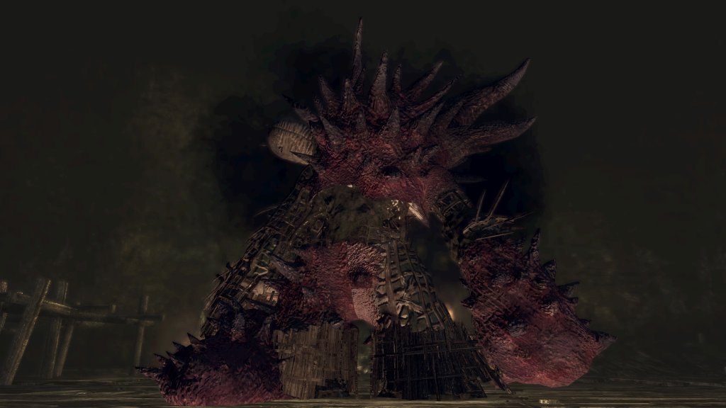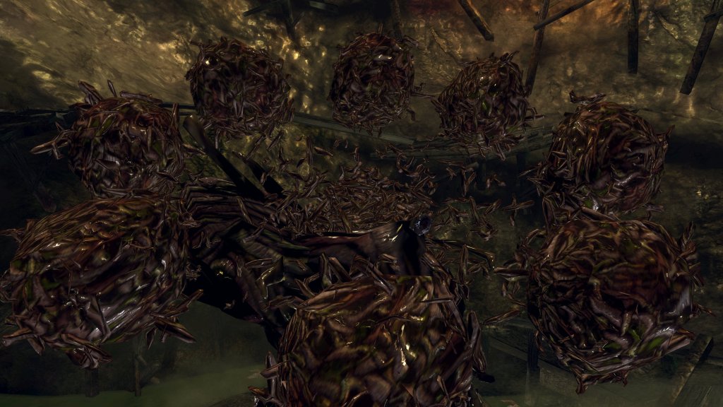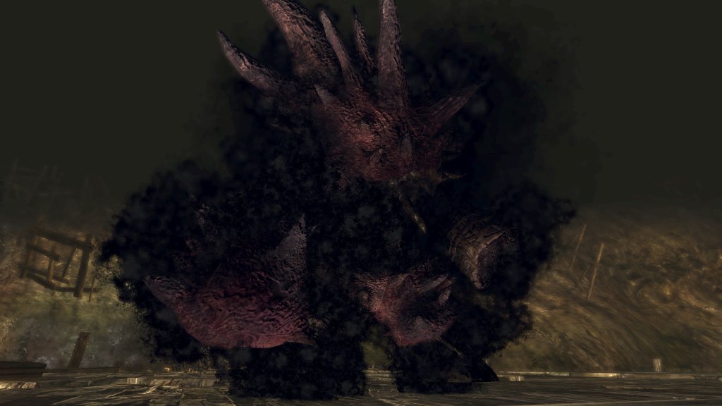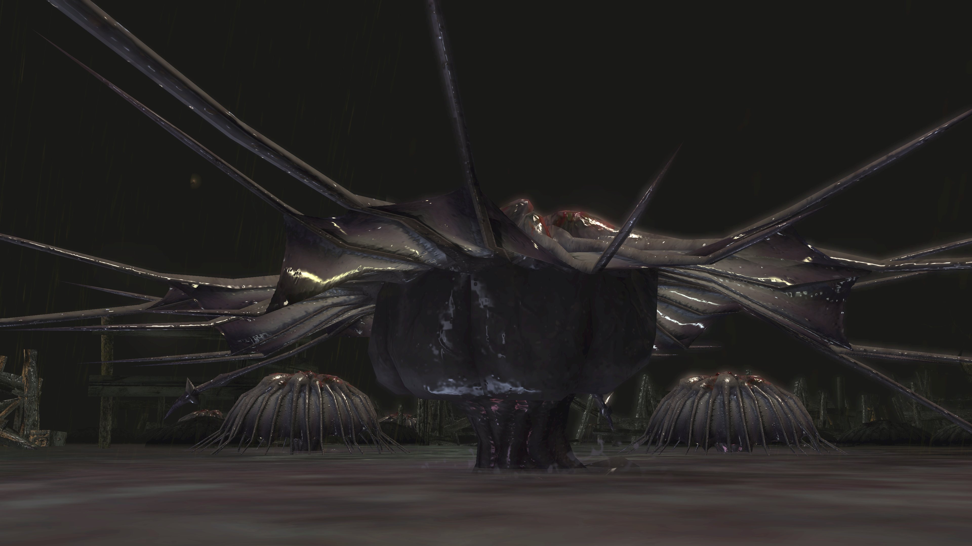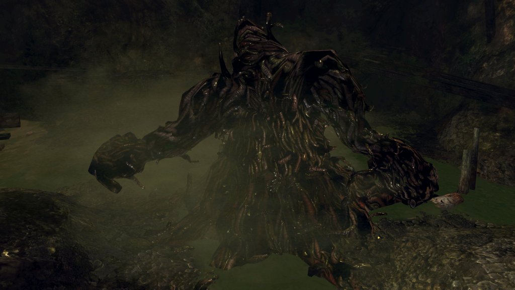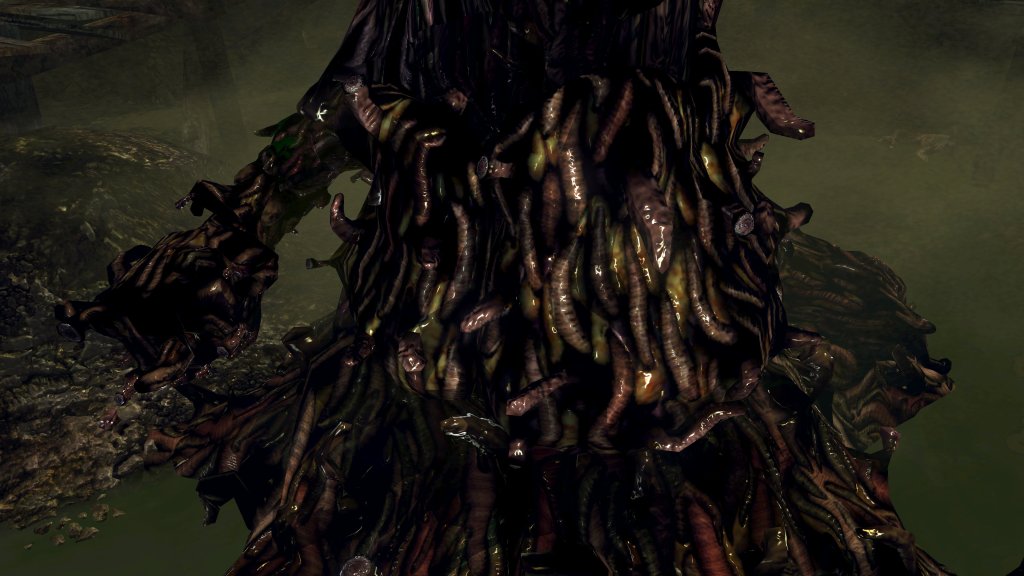 The demon is swarmed by countless flies that support it in battle and roam about its vicinity, similar to the leeches of the preceding boss. According to the deluxe edition art book, these flies are themselves demons and as much a part of the colossus as its main body. This isn’t surprising since the filthy woman mentions the various poison insects fattening themselves up on souls, implying that they too have become demons just like the Armor Spider in Stonefang Tunnel. The flies are merely an extension of the Dirty Colossus, collecting souls on its behalf. This is probably why the deluxe edition art book claims that the colossus is usually found around both fly nests and rotten areas where it can attract new flies. The demon’s “eroded” soul is actually one eaten away by insects, so its trash body serves as a lure for these bugs to nest and feast upon. The monster has been spoiled by them in the same way that the swamp has been ruined by them. It isn’t just noxious bugs plaguing the valley, it is all sorts of insects and natural phenomena causing the decay.
