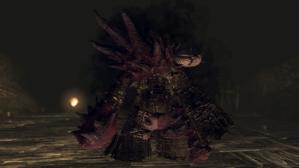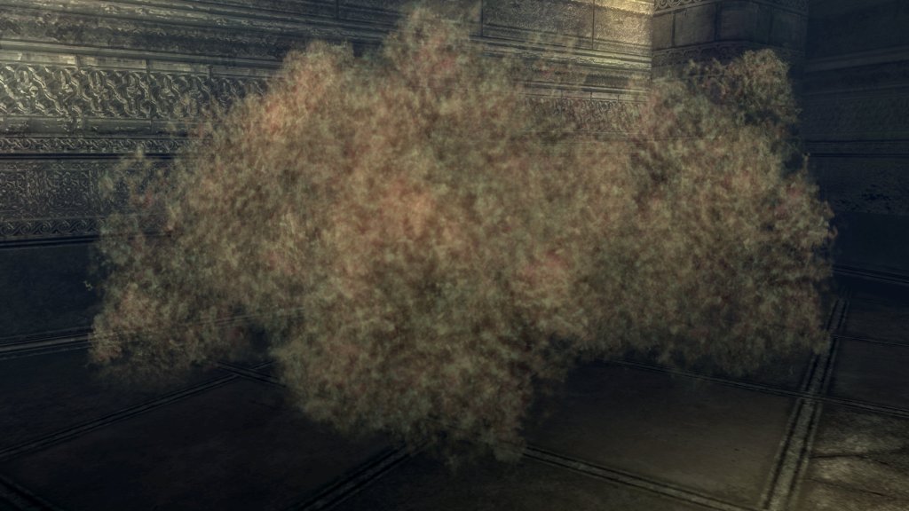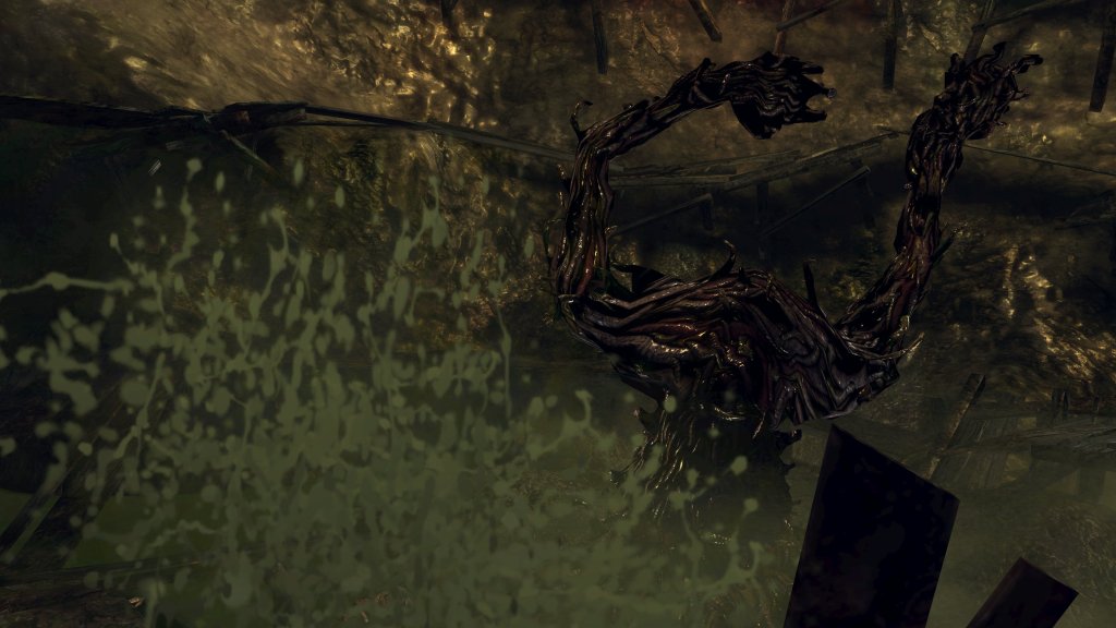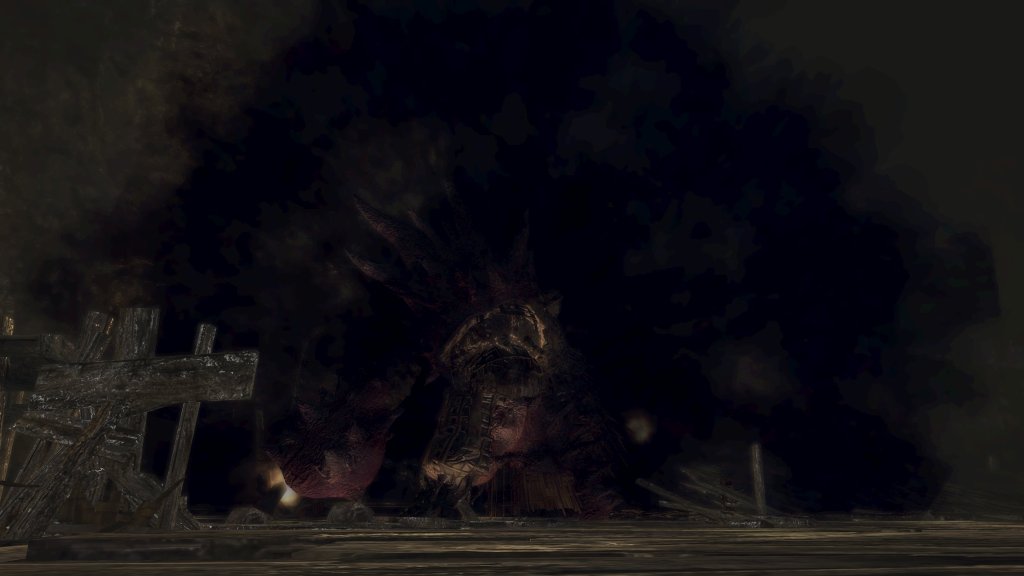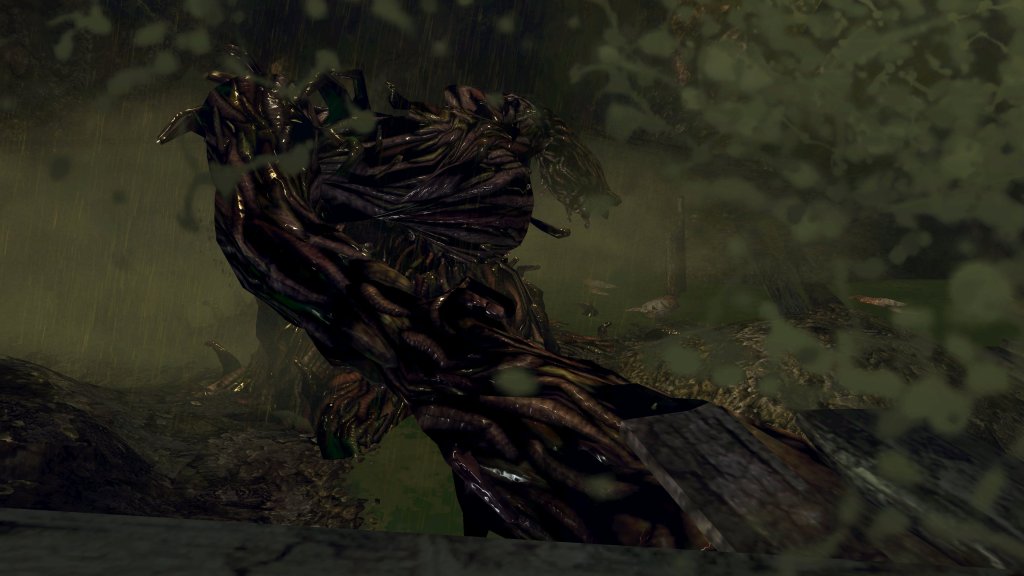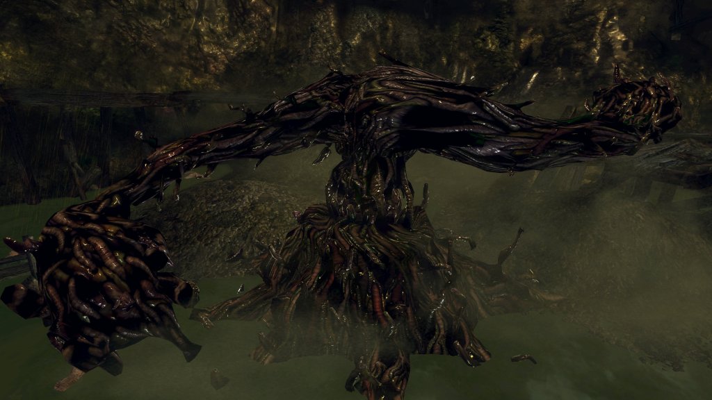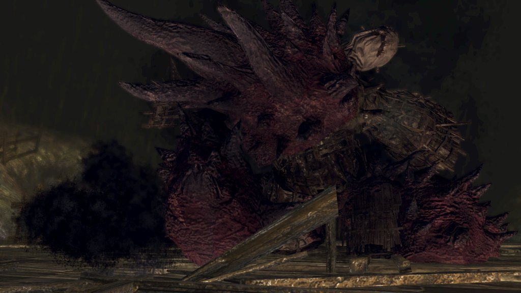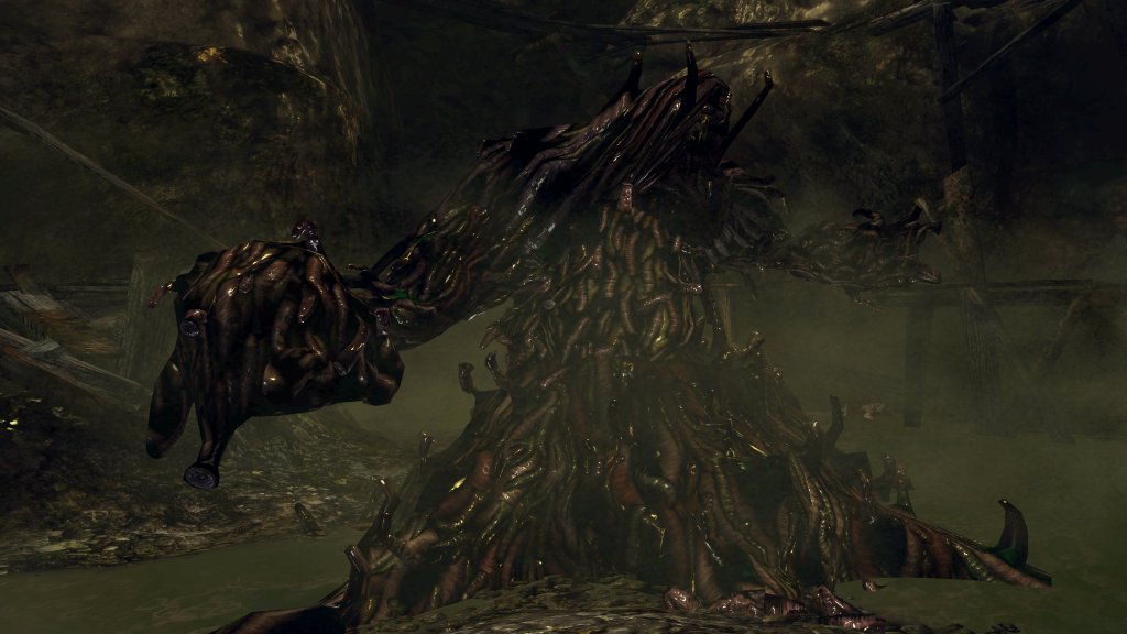 The demon is swarmed by countless flies that support it in battle and roam about its vicinity, similar to the leeches of the preceding boss. According to the deluxe edition art book, these flies are themselves demons and as much a part of the colossus as its main body. This isn’t surprising since the filthy woman mentions the various poison insects fattening themselves up on souls, implying that they too have become demons just like the Armor Spider in Stonefang Tunnel. The flies are merely an extension of the Dirty Colossus, collecting souls on its behalf. This is probably why the deluxe edition art book claims that the colossus is usually found around both fly nests and rotten areas where it can attract new flies. The demon’s “eroded” soul is actually one eaten away by insects, so its trash body serves as a lure for these bugs to nest and feast upon. The monster has been spoiled by them in the same way that the swamp has been ruined by them. It isn’t just noxious bugs plaguing the valley, it is all sorts of insects and natural phenomena causing the decay.