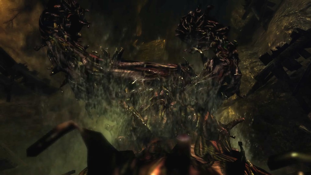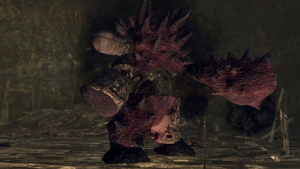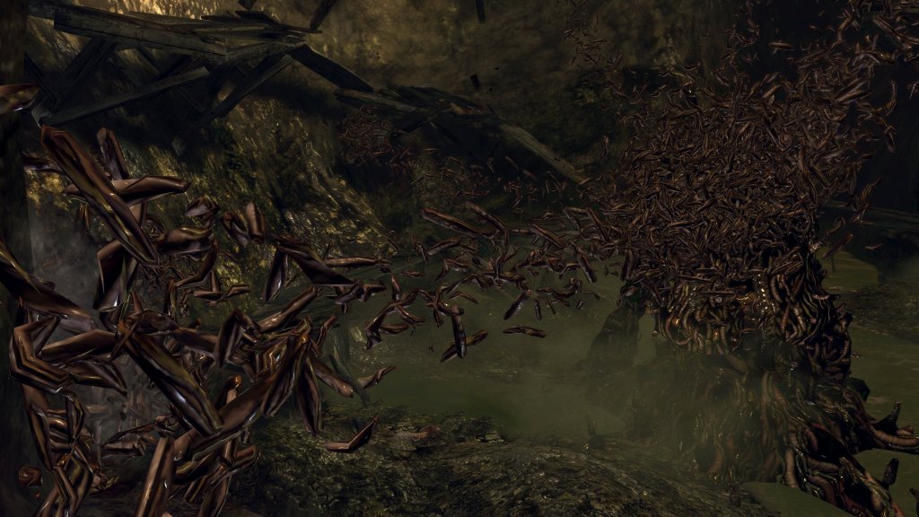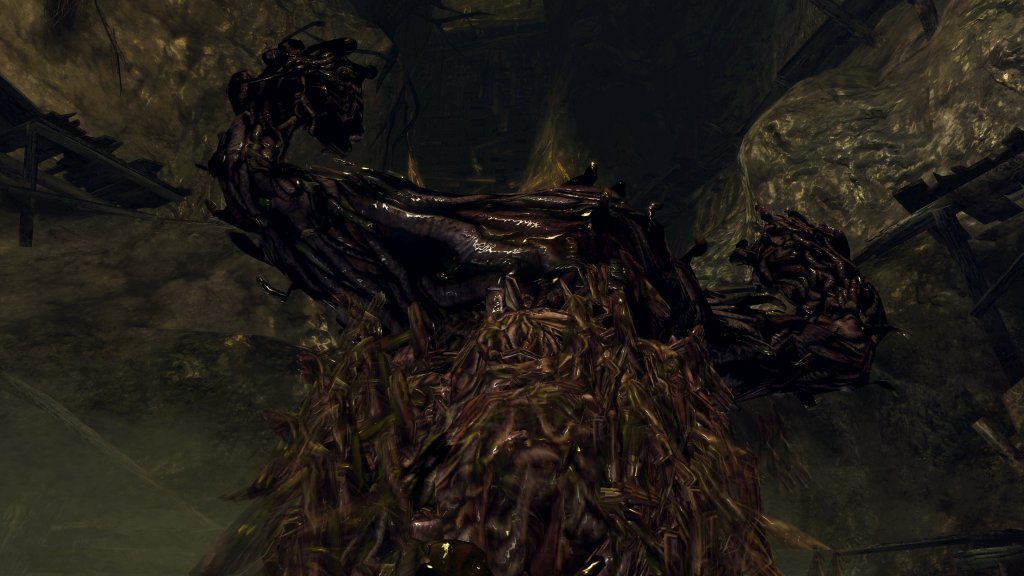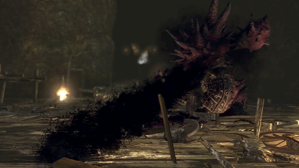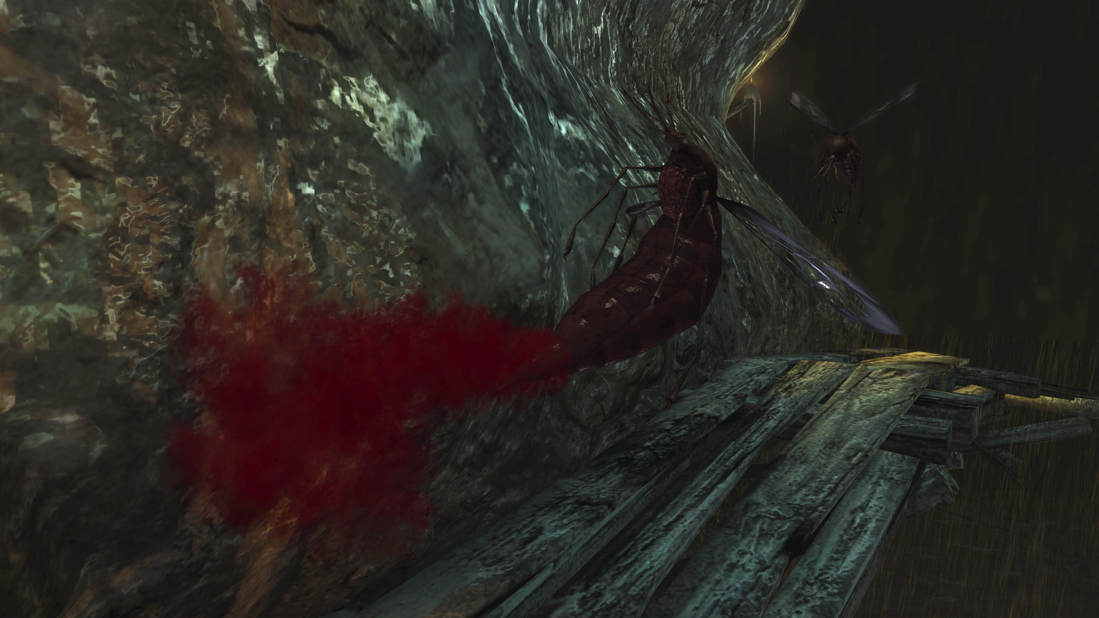 The demon is swarmed by countless flies that support it in battle and roam about its vicinity, similar to the leeches of the preceding boss. According to the deluxe edition art book, these flies are themselves demons and as much a part of the colossus as its main body. This isn’t surprising since the filthy woman mentions the various poison insects fattening themselves up on souls, implying that they too have become demons just like the Armor Spider in Stonefang Tunnel. The flies are merely an extension of the Dirty Colossus, collecting souls on its behalf. This is probably why the deluxe edition art book claims that the colossus is usually found around both fly nests and rotten areas where it can attract new flies. The demon’s “eroded” soul is actually one eaten away by insects, so its trash body serves as a lure for these bugs to nest and feast upon. The monster has been spoiled by them in the same way that the swamp has been ruined by them. It isn’t just noxious bugs plaguing the valley, it is all sorts of insects and natural phenomena causing the decay.
