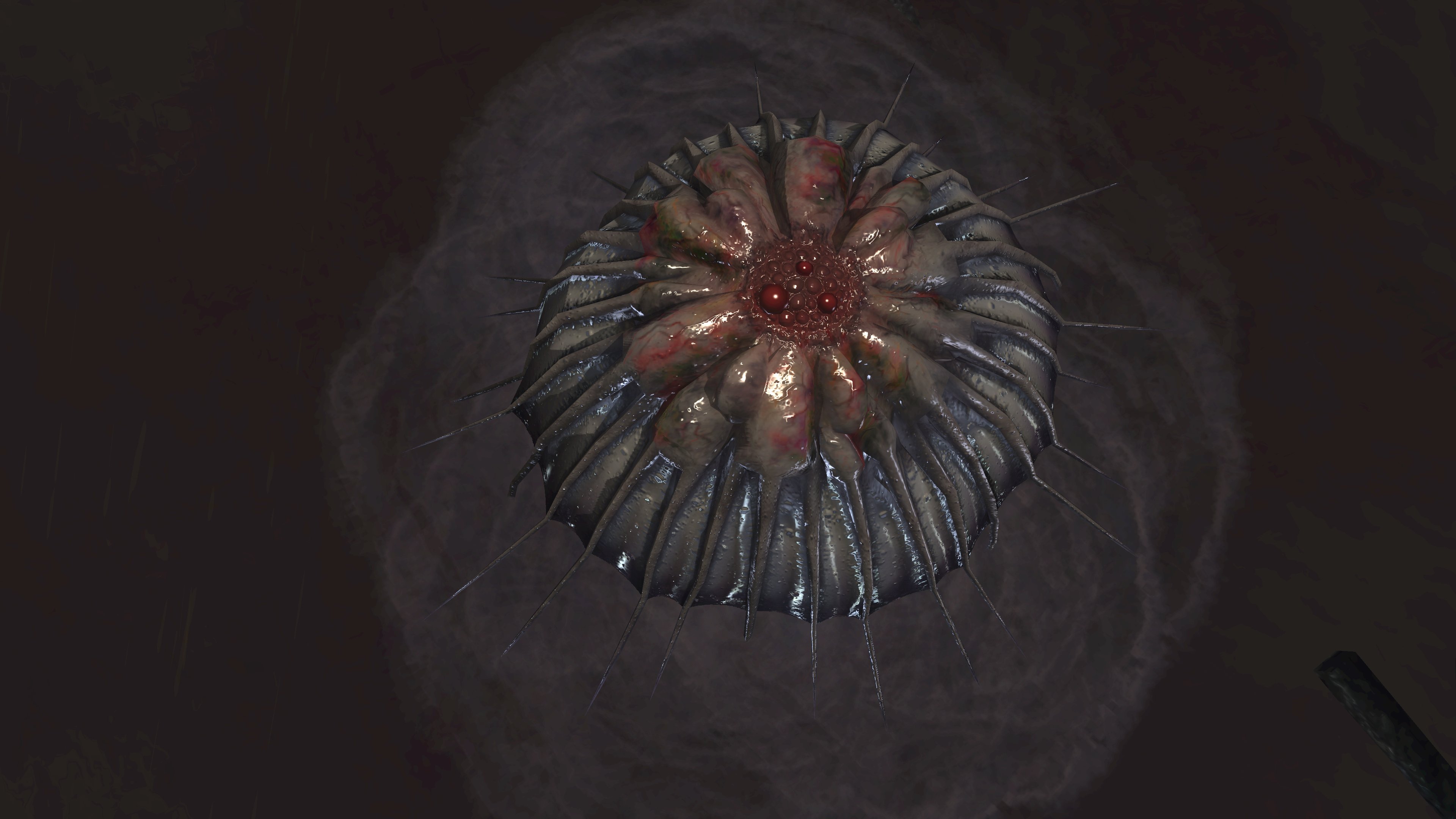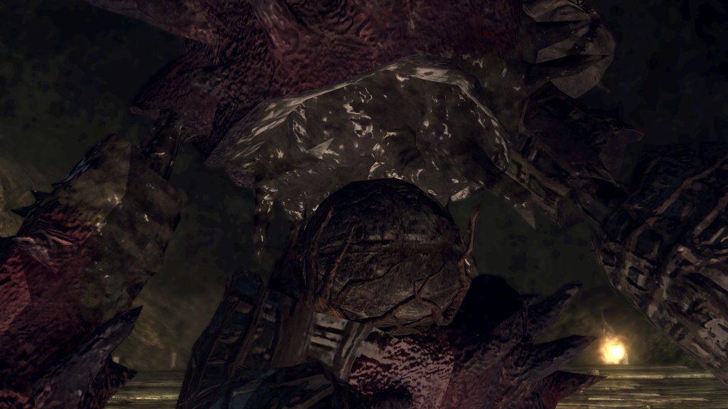 The fog has simply been creating physical incarnations of the rot that has amassed in this land, which reaches its zenith at the aforementioned graben. This last area that we can explore dumps all the uncleanliness from the giant swamp above to form another, smaller bog at the bottom. If we elect to jump down to this smaller swamp during the boss battle, we will be endlessly swarmed by rather alien creatures not even half our size. These demons look like mounds of flesh and bone vaguely made in the shape of babies, leading some to conclude that they are aborted fetuses. The truth is far less horrific. Though his English dialogue is incredibly misleading, Garl Vinland notices our fall and leaves us to “be devoured to death by the unclean.” The man is explicitly nominalizing and pluralizing unclean, so he must be referring to the only enemies found down there, namely these “babies” internally named “unclean ones”. (不浄なるもの) Garl isn’t telling us to die of the fall and be melted by acid, but to be consumed by the very unclean things referenced in the text for the valley’s Archstones.