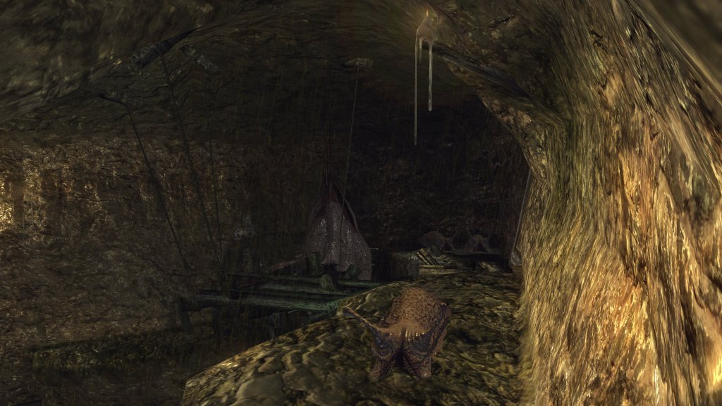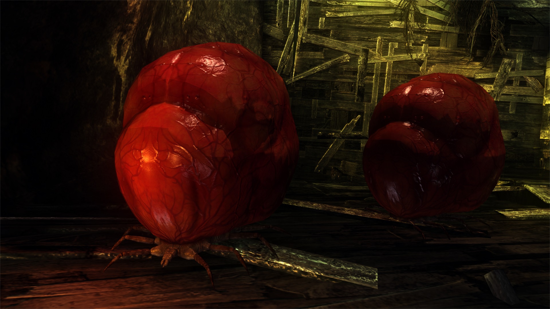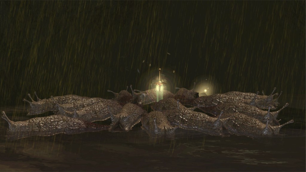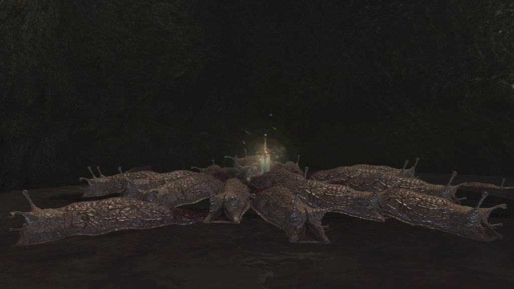 Many of these holy knights’ corpses are scattered about the valley from the village to the swamp. Countless more are piled up before Astraea at her graben temple much like the gold coins, vases, and goblets found surrounding her; evidently, they are all offerings. Like every other outsider, Astraea’s followers have been slaying those attempting to investigate the area. Risaia’s spear Istarelle can be found stabbed in the earth at the highest reachable point in the dale surrounded by three particularly large depraved ones. Vito’s Moonlight Greatsword is seen strung up by a rope in the village with countless large slugs hanging on in order to leech off it. These ominous setups indicate that they too were felled by the cult, and their missing bodies further implies them to have been among the offerings to Astraea. Some have posited that the Leechmonger and Dirty Colossus are derived from Risaia and Vito respectively given their relative proximity to each boss, but there is nothing particular to those character in either design or essence. The bosses are simply embodiments of the valley’s filth, while the two holy knights are simply wielders of renowned weapons.