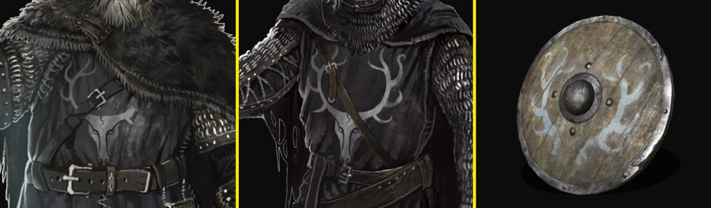 Unfortunately, there is nothing more that the old man can tell us about his kingdom’s warriors. While he wears a distinctive fur shawl and helmet adorned with a galea, the descriptions of his equipment acknowledge that these were things the warrior had picked up during his travels and thus don’t reflect the military uniforms of Jugan armies. They aren’t completely uninformative, however. Despite his clothes’ origins supposedly being unknown, his surcoat at least bears the crest of a blue stag of Mirrah, suggesting that the Jugan has been to the country of knights and acquired some of their equipment, perhaps through battle. Both countries are described as being situated east of Drangleic, so it makes sense that he might stop there early in his travels searching for strong opponents. But, the parma he carries depicts the antlers of that very stag on its face — with no mention of him picking it up in its description. Instead, we are told that it is old and probably some clan’s crest. What clan? From Mirrah? Why does Benhart have an old Mirrah shield in his possession when he uses a greatsword?