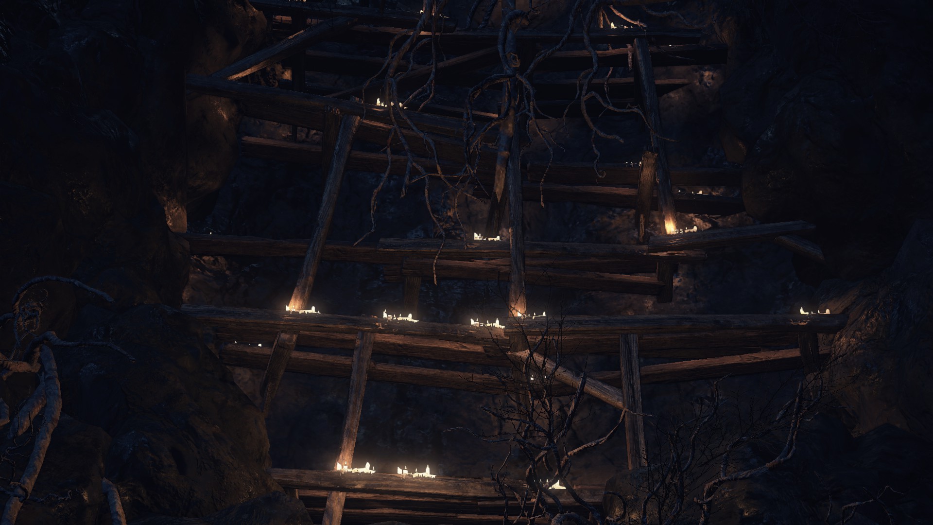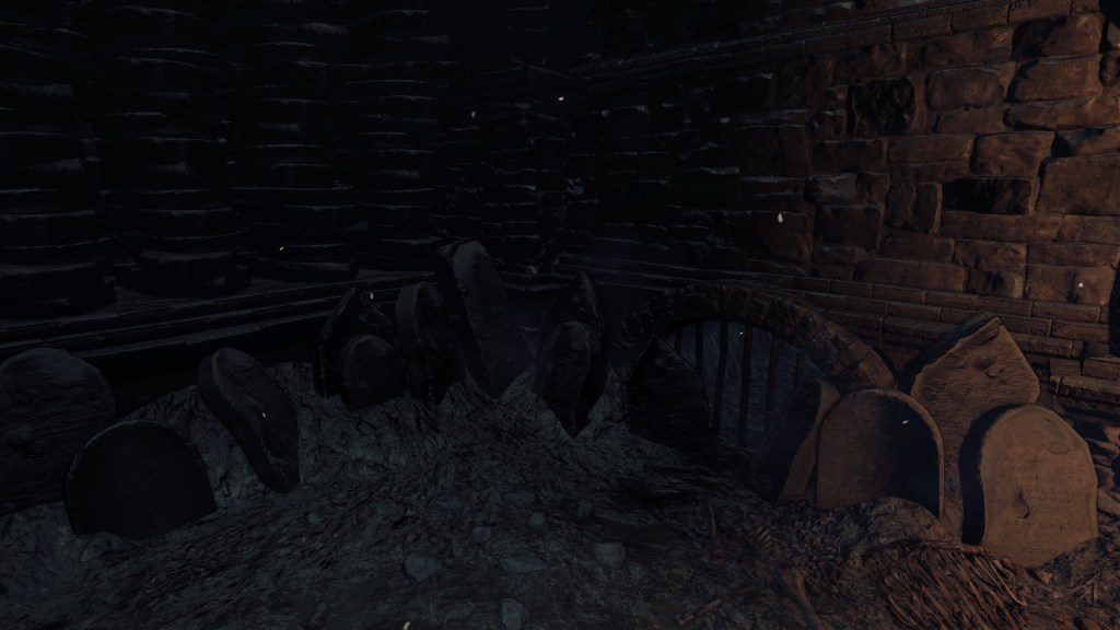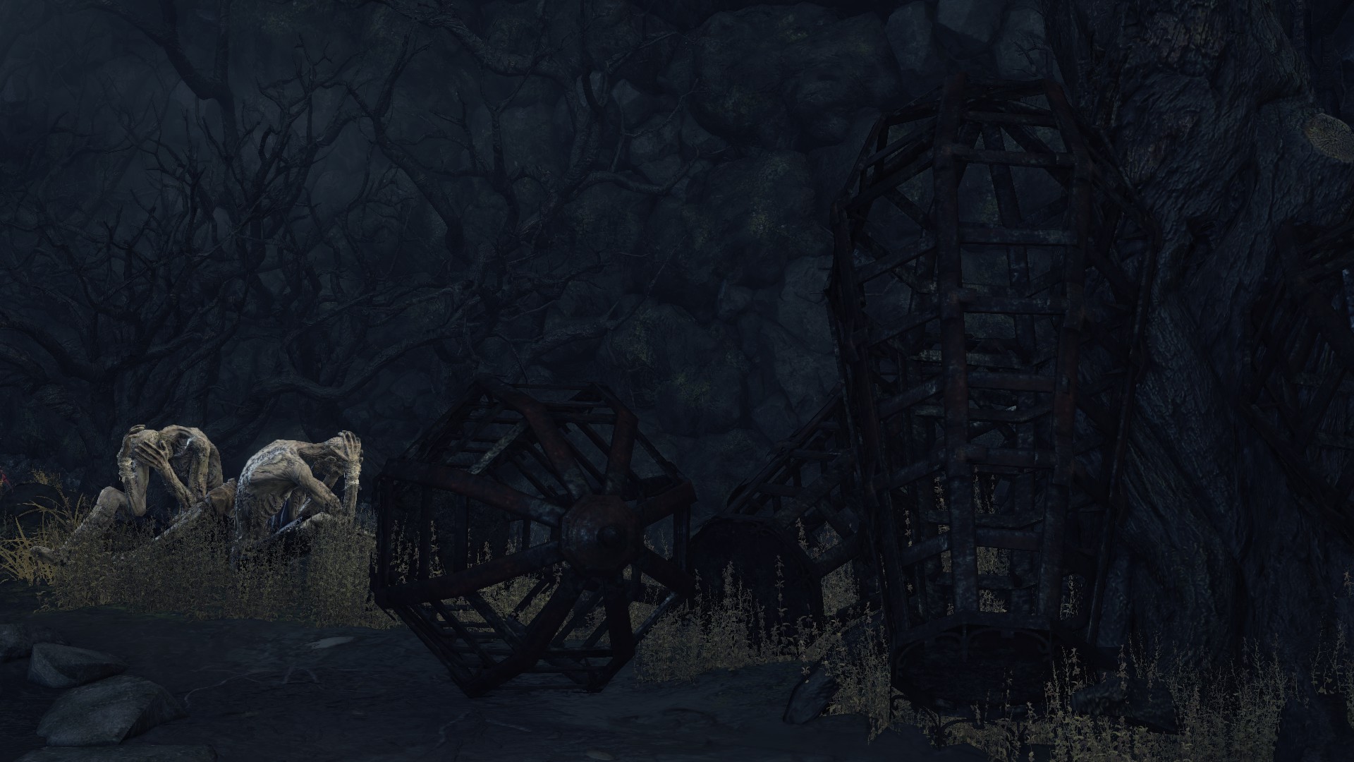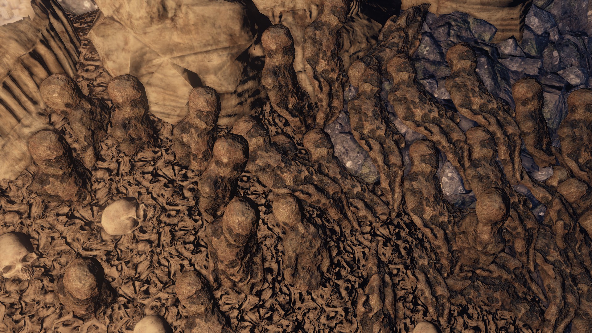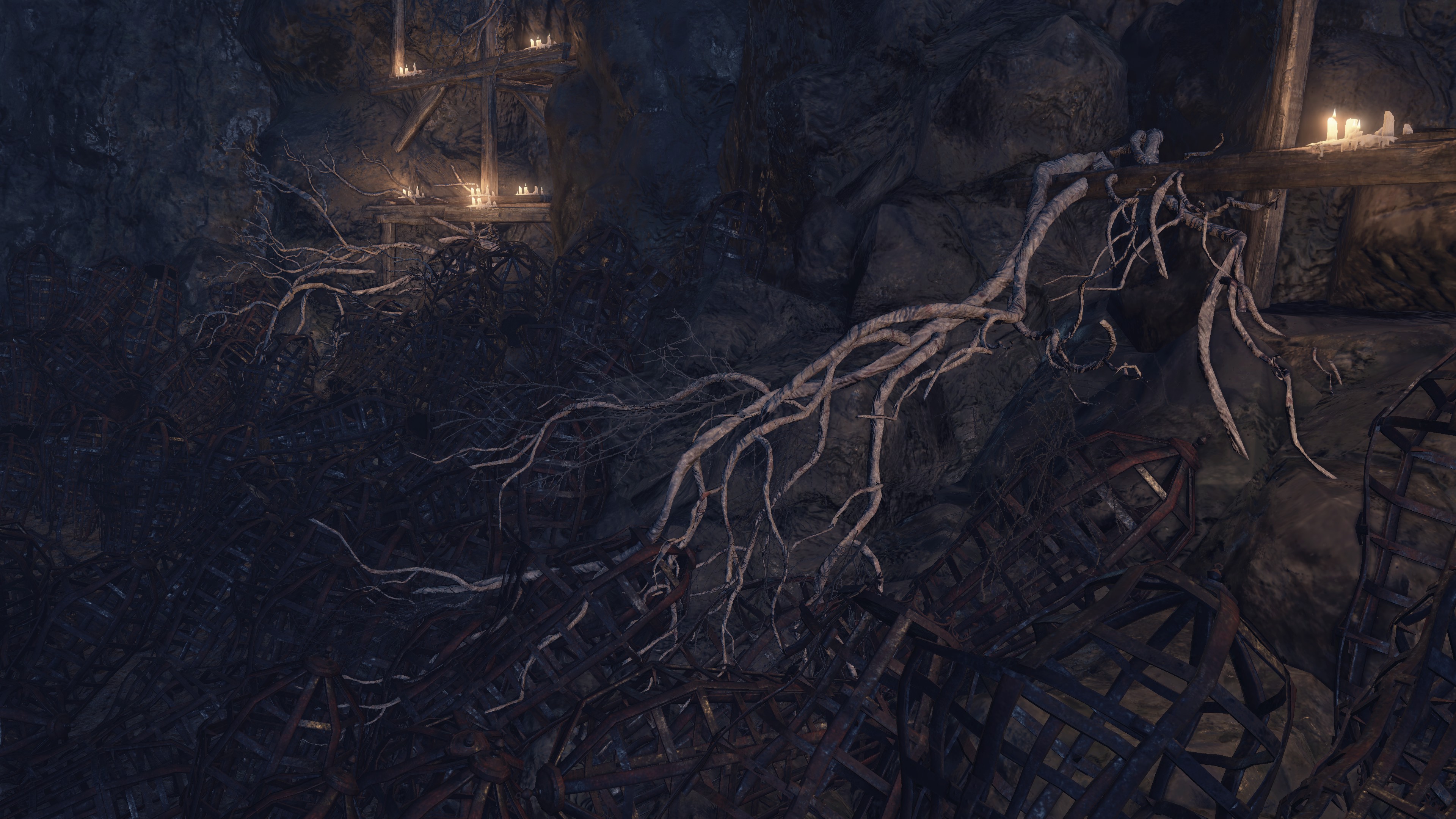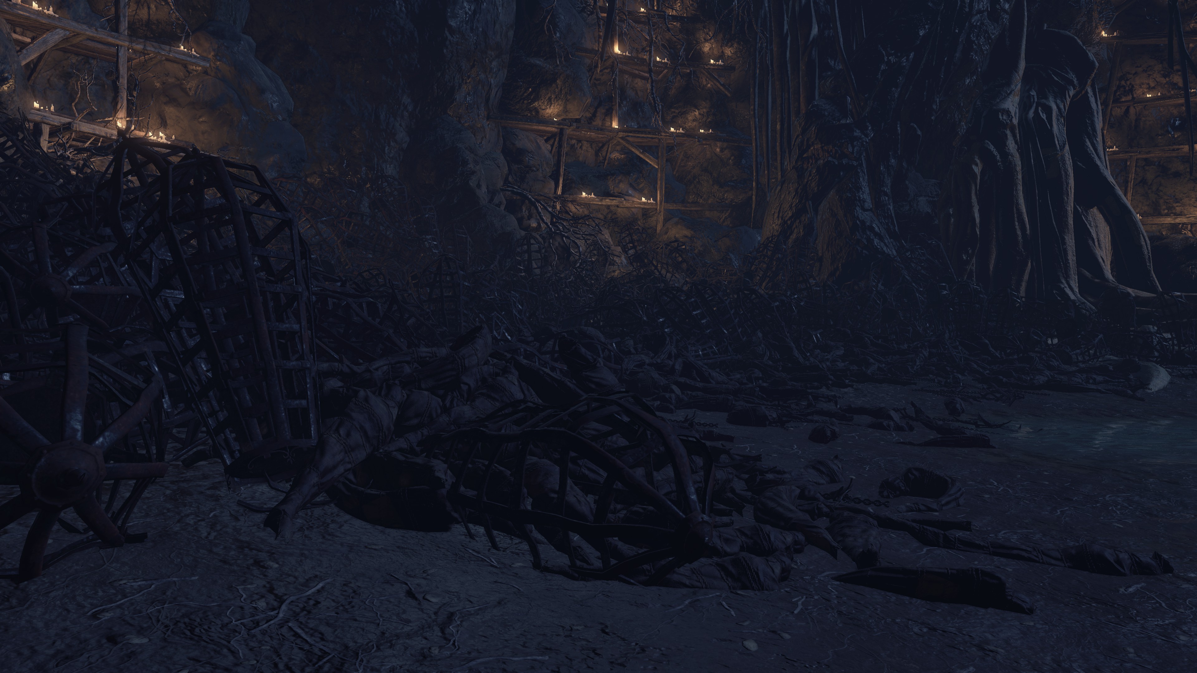 Beneath the shrine hides the Pit of Hollows, various wooden platforms and support beams installed to help citizens safely scale down it. The pile of bagged corpses and cages at the back are dumped by manservants, one of whom can transport us to the pit prior to the Greatwood boss battle. This plus the headstones dotting in the courtyard overhead suggest that this pit is a burial ground; to that point, the shrine does adjoin the town cemetery proper. And among the Mound-makers’ altar up front is what appears to be more corpses, plants sprouting between earthy breaks in their stone skin. Townsfolk have already been suffering from the metaphysical petrification and dendrification — apparently lazing around town awaiting the world’s stagnation to take them — as have the local skeletons buried in the old crypt. But based on the depth of the pit and the statuesque bodies’ current condition, these are the earliest residents, buried before the town developed its current burial practices. Because they weren’t properly dissected, their rotting flesh had ample opportunity to completely petrify and dendrify.
